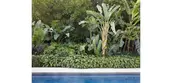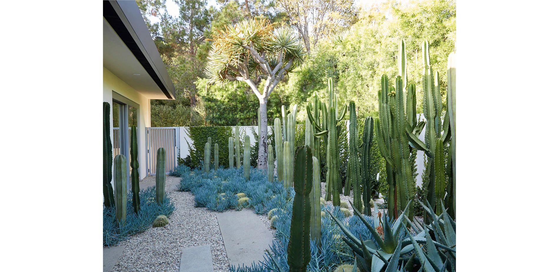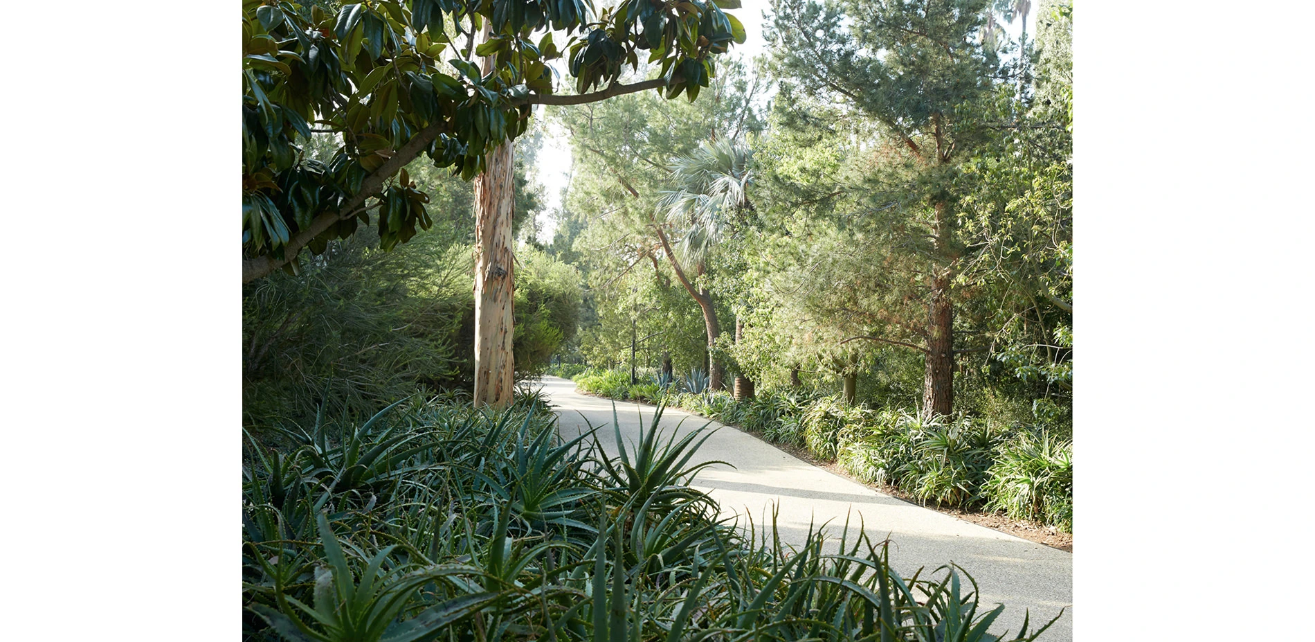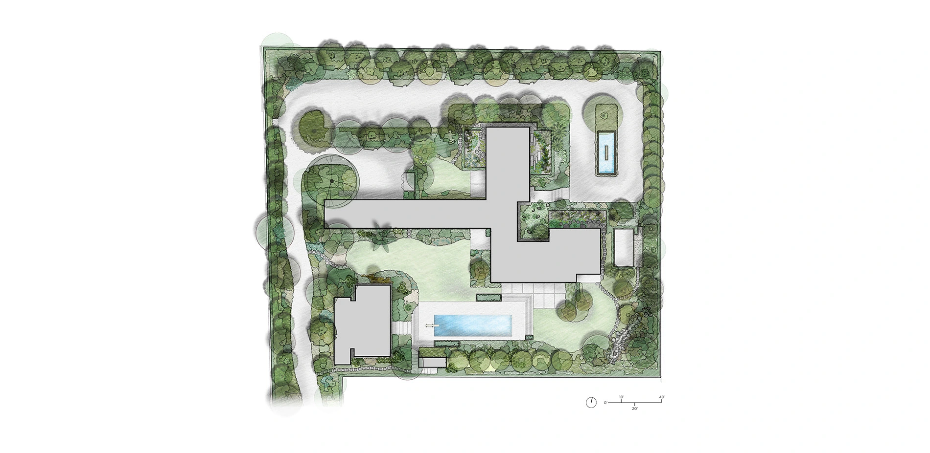 The rest of the landscape design focused on the client’s desire to showcase the unique diversity of plant life available to Southern California gardens, as well as offer privacy from nearby Sunset Boulevard. Over 150 mature specimen trees of more than 25 species were planted at the property’s perimeter, along the driveway and within its garden spaces, creating an instant, lush atmosphere. Native plantings dominate the driveway and autocourt, while diverse plant palettes from Mediterranean climates, temperate shade gardens, desert areas, and subtropical regions reflect and adapt to the particular microclimates of different courtyards and garden spaces throughout the site.