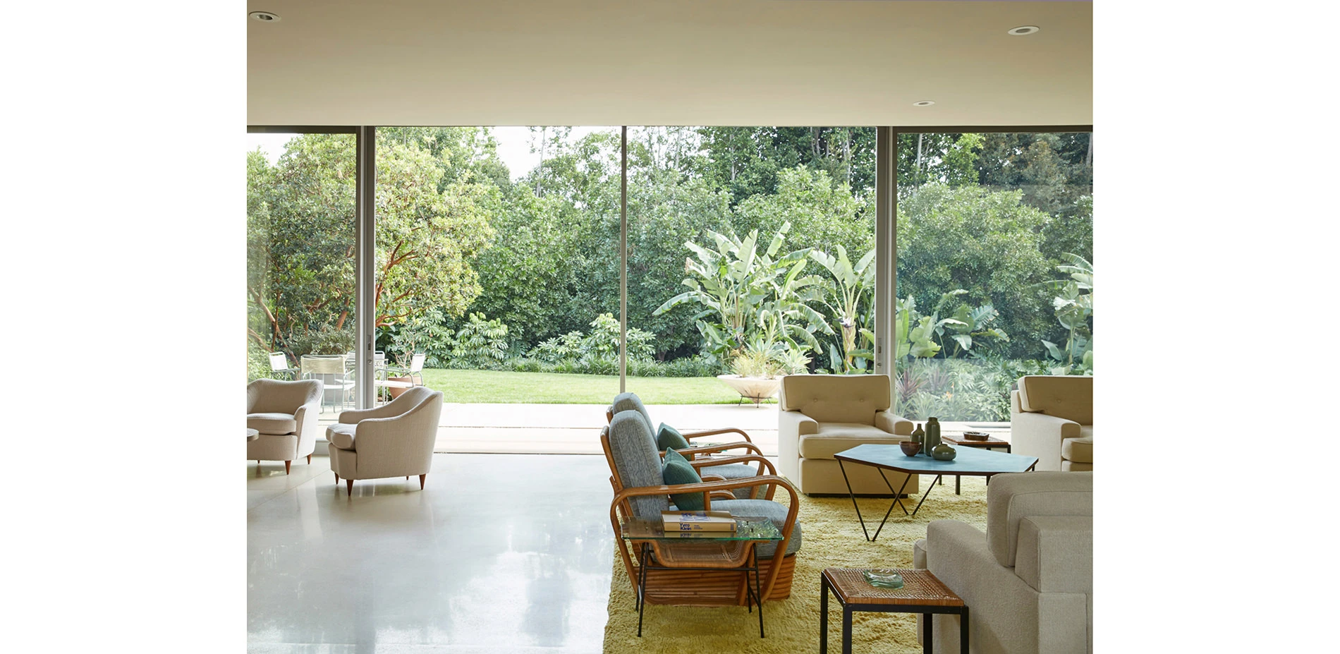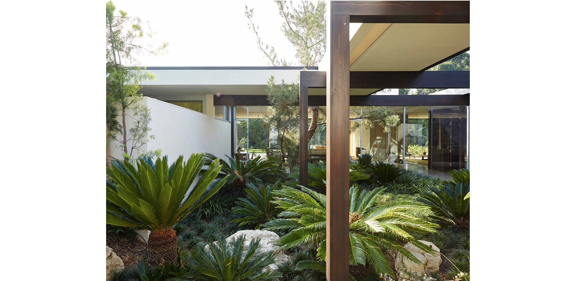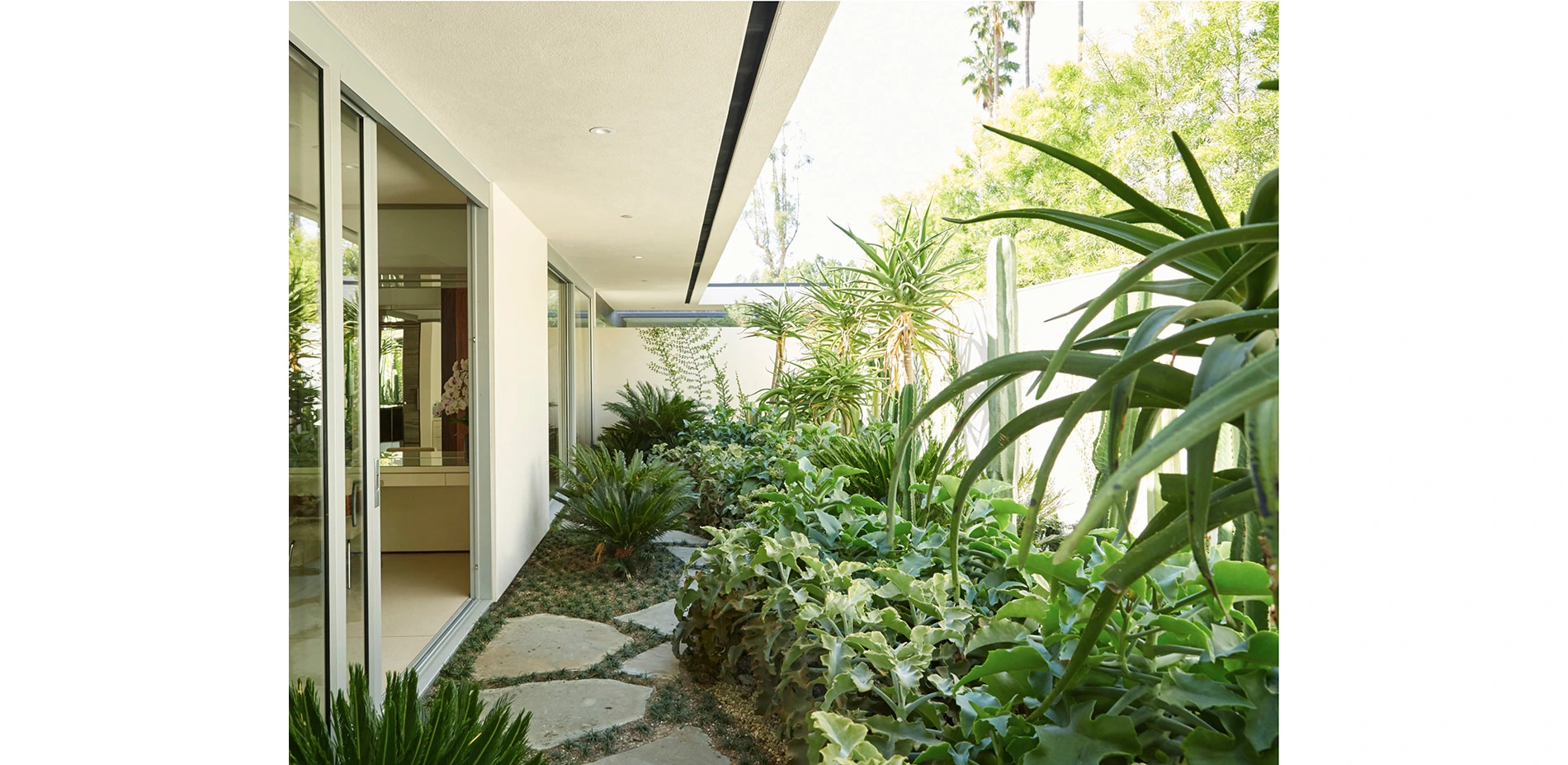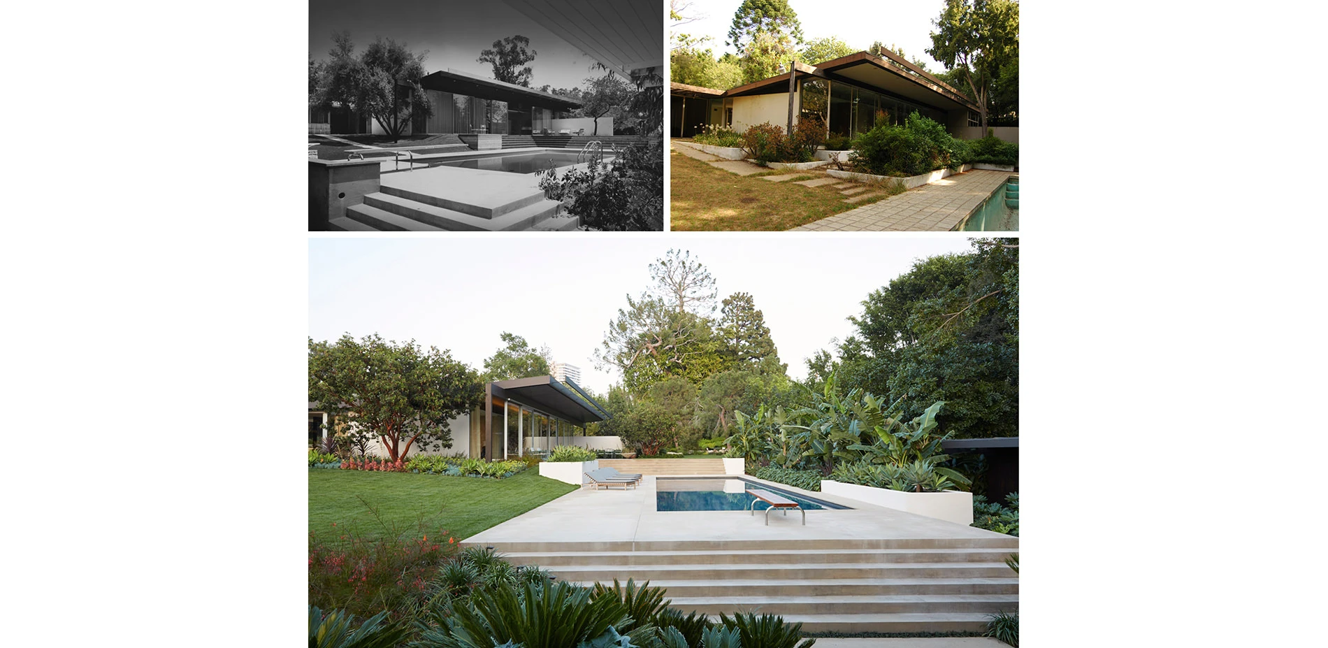 To ensure adherence to the original design intent, our team referenced Julius Shulman’s historic photos of the house interiors, façade, and landscape. The original, dynamic, terraced configuration of the main patio and pool deck had been filled in and rearranged. The restoration brought back the built-in planters, stairs, and sloping lawn that Neutra had envisioned for the space. Key specimen trees were placed to interact with the architecture’s overhangs, site walls, and beams, in locations shown in the historic photographs. The historic pool house was remodeled, and a new guest house at the end of the pool celebrates views toward the main house, from Shulman’s famous vantage point.