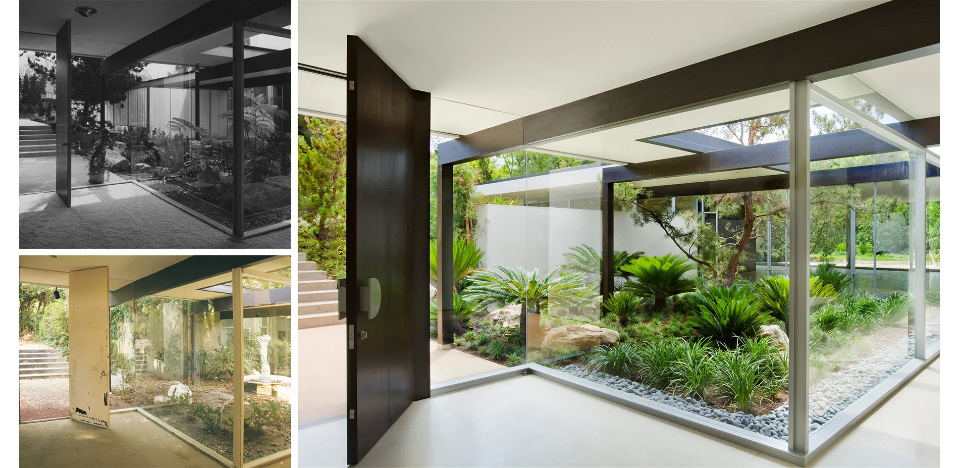 The Kronish House is situated at the end of a long driveway, on a flag lot off of Sunset Boulevard in Beverly Hills. Built in 1954 for real estate developer Herbert Kronish and his family, the Kronish House is one of only three Neutra-designed homes ever built in the City of Beverly Hills, and the only one that survives intact. Reflecting Neutra’s typical style of integrated indoor and outdoor spaces, the low-slung villa is composed of three wings, which radiate from a glass-enclosed garden area. Over time and through changing of hands, the property suffered from neglect. Not only the house, but the courtyards, patios, pool, and landscape, which were important aspects of the original Neutra vision, had suffered from modifications, the plantings becoming neglected and overgrown. In 2011, the property was listed for sale and bought as a tear-down, slated for demolition.