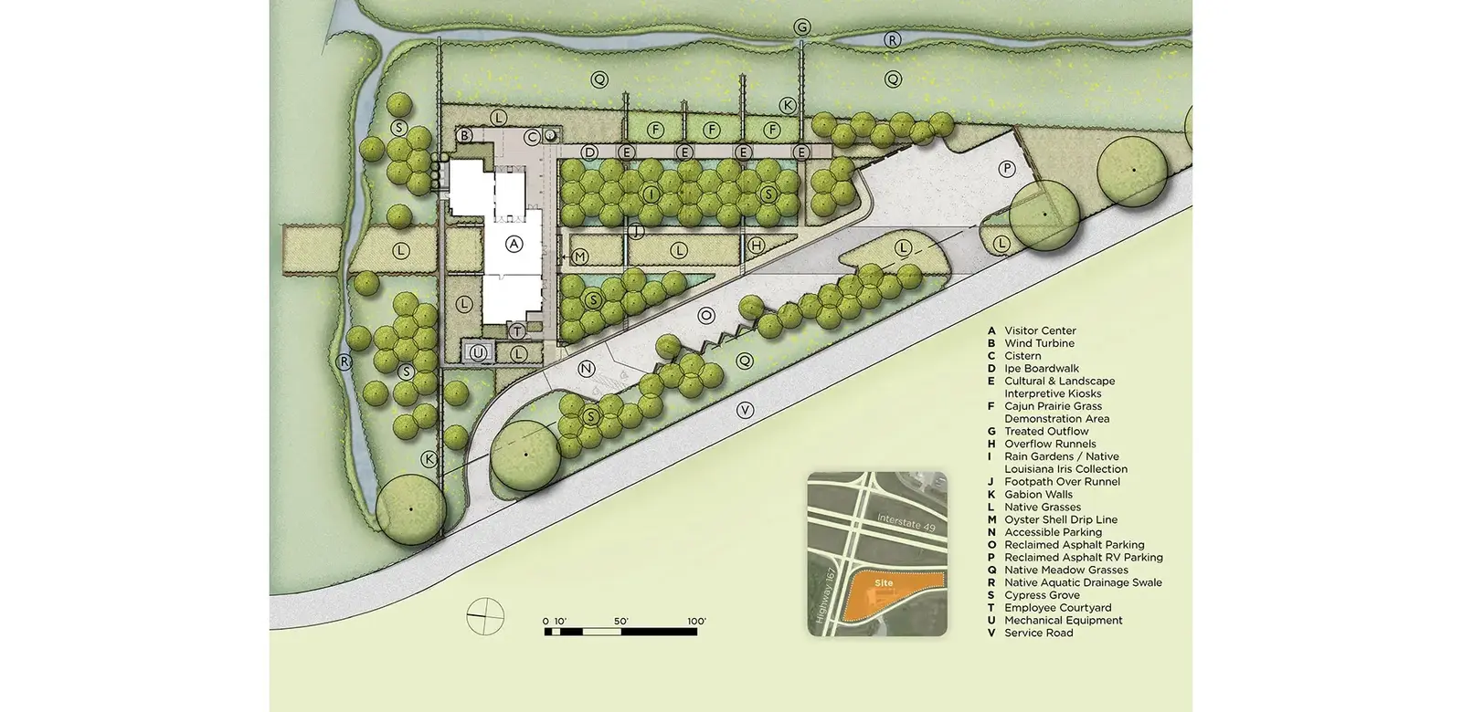 The design team, led by a close collaboration between landscape architects and architects, embraced the ideals of an integrated design methodology and sustainable development principles that celebrated regional ecologies and culture. These became the guiding influences for the proposed design, which originated as the winning submission in a design competition facilitated by the St. Landry Parish Visitor and Tourist Commission in 2008. This new visitor center, along Interstate 49 at the northern edge of the Acadiana region, features interpreted native landscapes, rain gardens, exhibit spaces, restrooms, and outdoor gathering / event areas with exhibits that unravel the landscapes, ecology, and history of this unique region.
