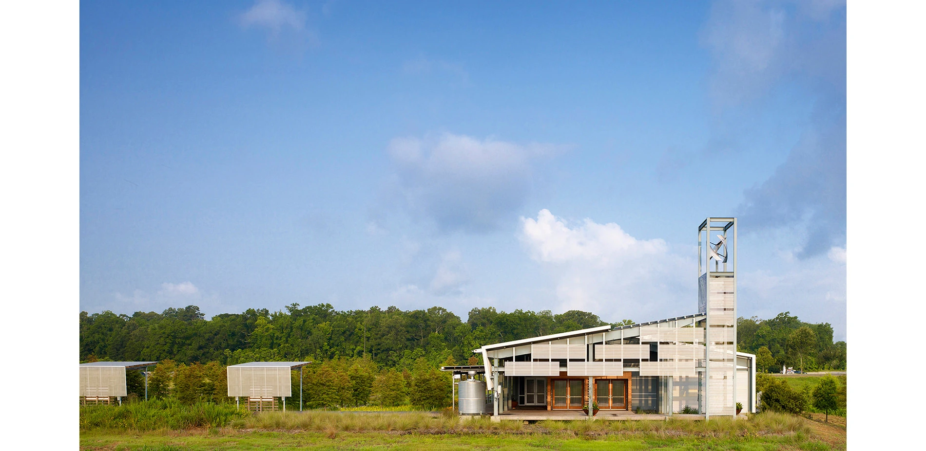Within a rural region such as Acadiana, where landscapes are dominant, this design is a full integration of building and landscape, connected by visible sustainable strategies. The architects and landscape architects worked closely together at the intersection of building and landscape, prioritizing the landscape and outdoor experience in architectural decisions. Interpretations of traditional Louisiana building responses such as deep-shaded porches, raised elevations for protection from rising waters, sloped roofs, and cistern-collected rainwater are used in tandem with more current responses such as the vertical axis wind turbine and roof integrated solar panels. Thoughtfully selected native building materials are dominant; these include the use of recycled brick, native aggregates, milled asphalt, recycled metal, and salvaged longleaf pine and cypress. The visitor’s center showcases how both old and new sustainable practices along with appropriate material selections can work together for a current, regional response.