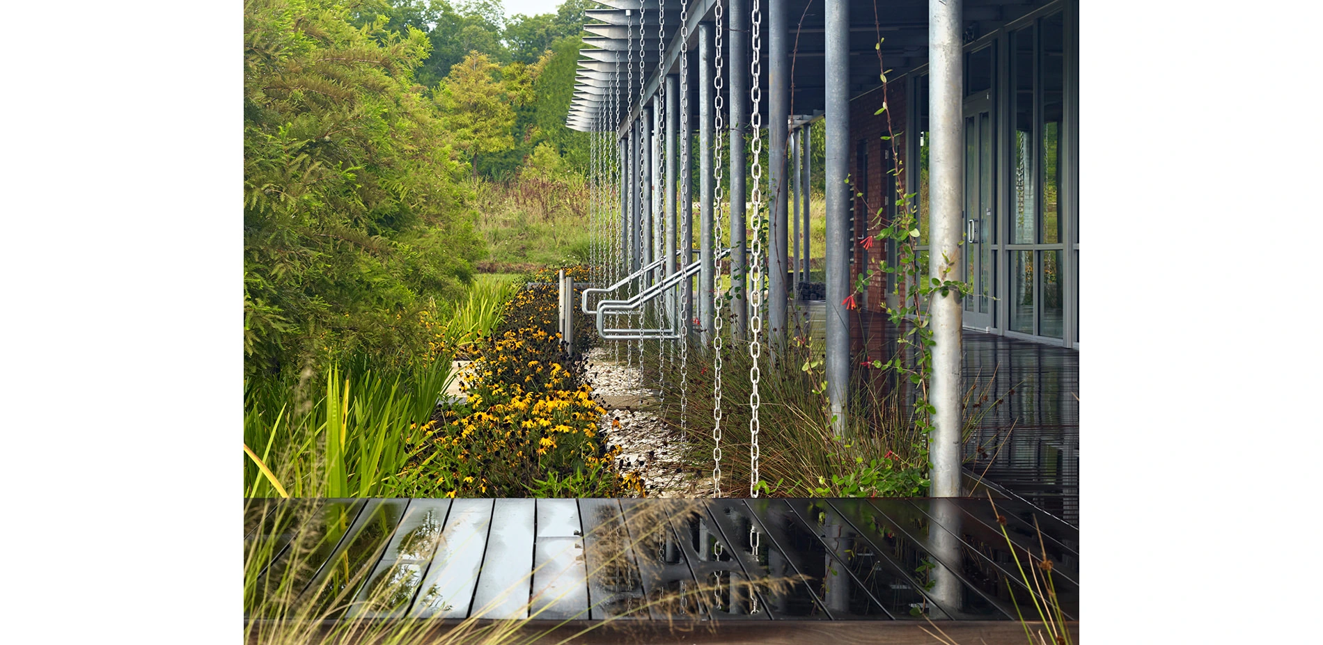 With an annual rainfall of 60-70 inches, the St. Landry Parish Visitor Center strives to responsibly manage its stormwater runoff. To do so, rain gardens collect all on-site storm and roof water via ground swales and rain chains that direct excess roof water through gulf oyster shell runnels. These gardens are accented by grids of bald cypress and brimming with eight varieties of native Louisiana iris. For all shades of green, there is an aesthetic and functional purpose. These landscapes are the centerpiece of the design and frame the exhibit hall, all while serving as a biological filter for adjacent parking and cistern overflow.