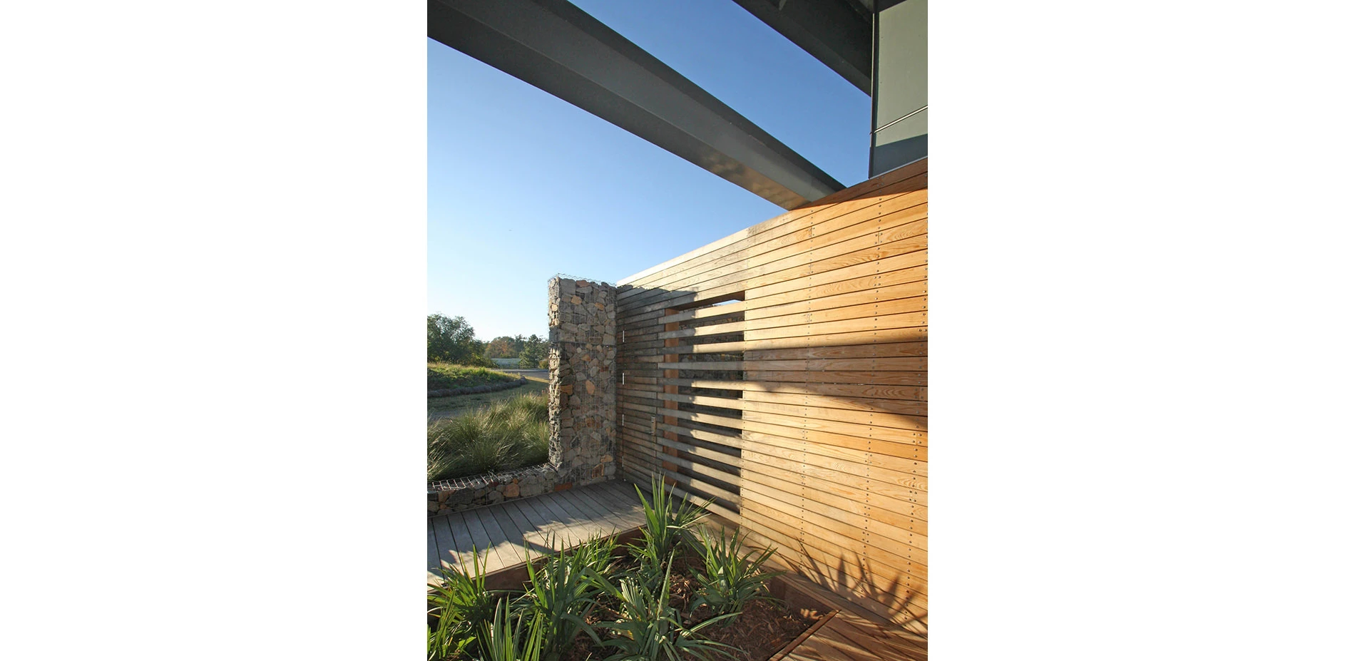 The visitor experience begins within a parking zone composed of loose and permeable milled asphalt, harvested from a nearby highway resurfacing project. Paths are paved with native aggregates, and visitors view open spaces planted with meadow grasses native to the prairies of the parish. At the Visitor Center, a seamless transition between architecture and site is very evident, with a direct sight line through the central lobby to the landscapes beyond. Elevated porches and boardwalks stretch around to a covered outdoor room. The boardwalk extends into the landscape, guiding the viewer’s eye towards the long, linear view of the horizon. The walks give access to the lush rain gardens and a procession of interpretive kiosks that punctuate the boardwalk, conveying information in both English and French, as to the history, culture, and ecology of the parish and region. Our firm was integral in the site placement and design of exterior spaces continuous with architecture.