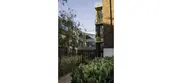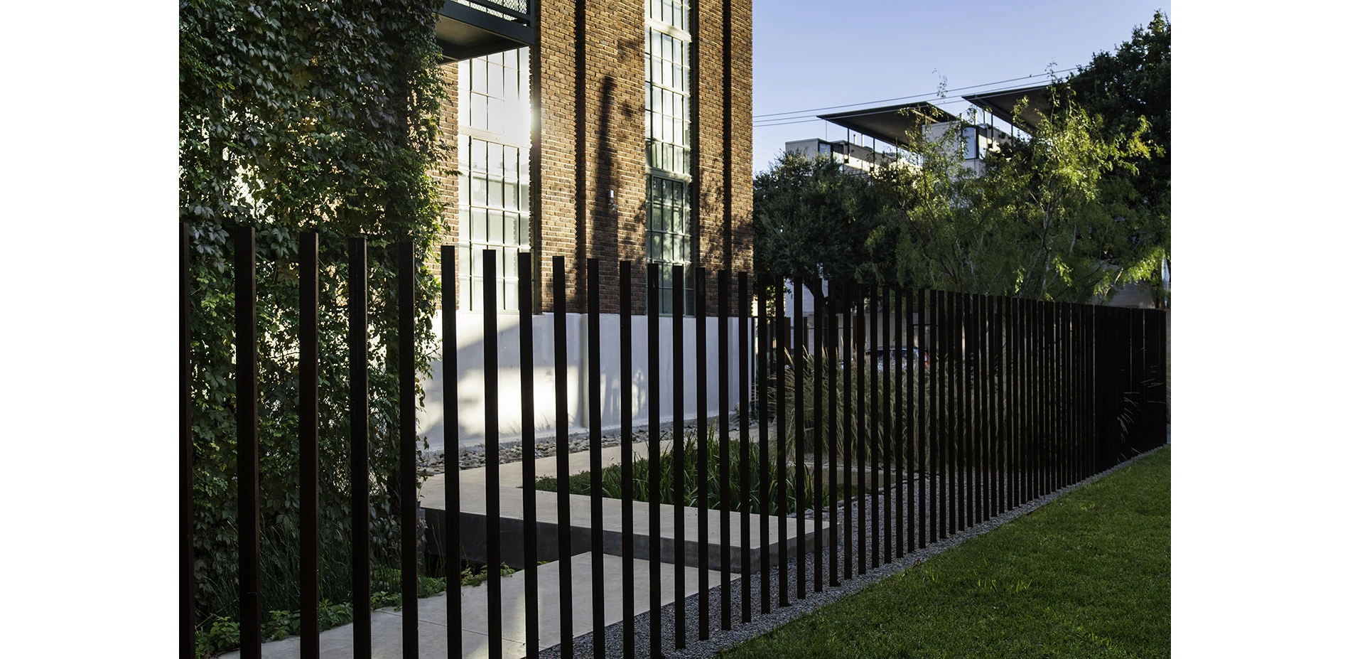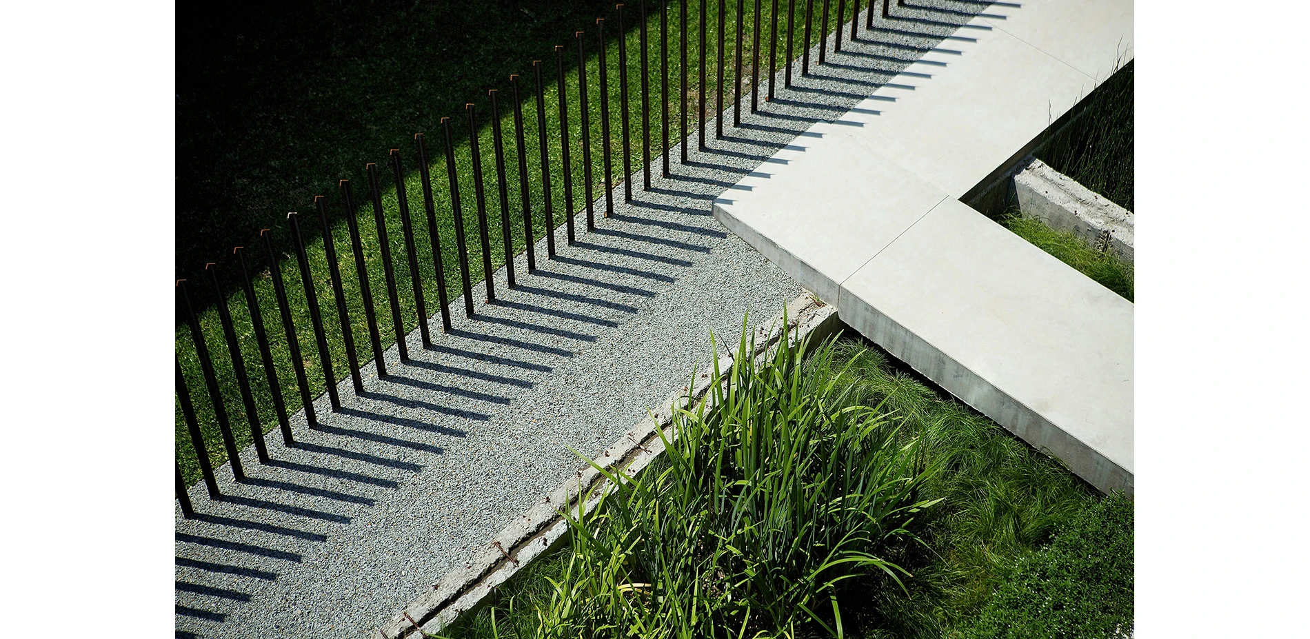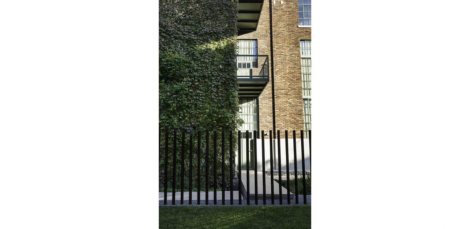 Securing the interior garden space is beautifully articulated steel picket fence. It creates a physical barrier along the west while maintaining visual porosity into the gardens. The vertical cantilevered pickets animate the site with shadows as the sun crosses the site throughout the seasons. This sculptural use of materials increases the sense of scale, and therefore the functionality of the small exterior courtyards. An unused, remnant concrete shaft is exposed and planted with iris, sedges, and horsetail reed as slightly sunken rainwater garden. The exposed steel rebar “stiches” of the walls create an interesting contrast of old versus new. This is another of several minimal interventions that increases permeability across the post-industrial site, allowing absorption of rainwater and minimizing run-off discharge to the city stormwater system.