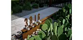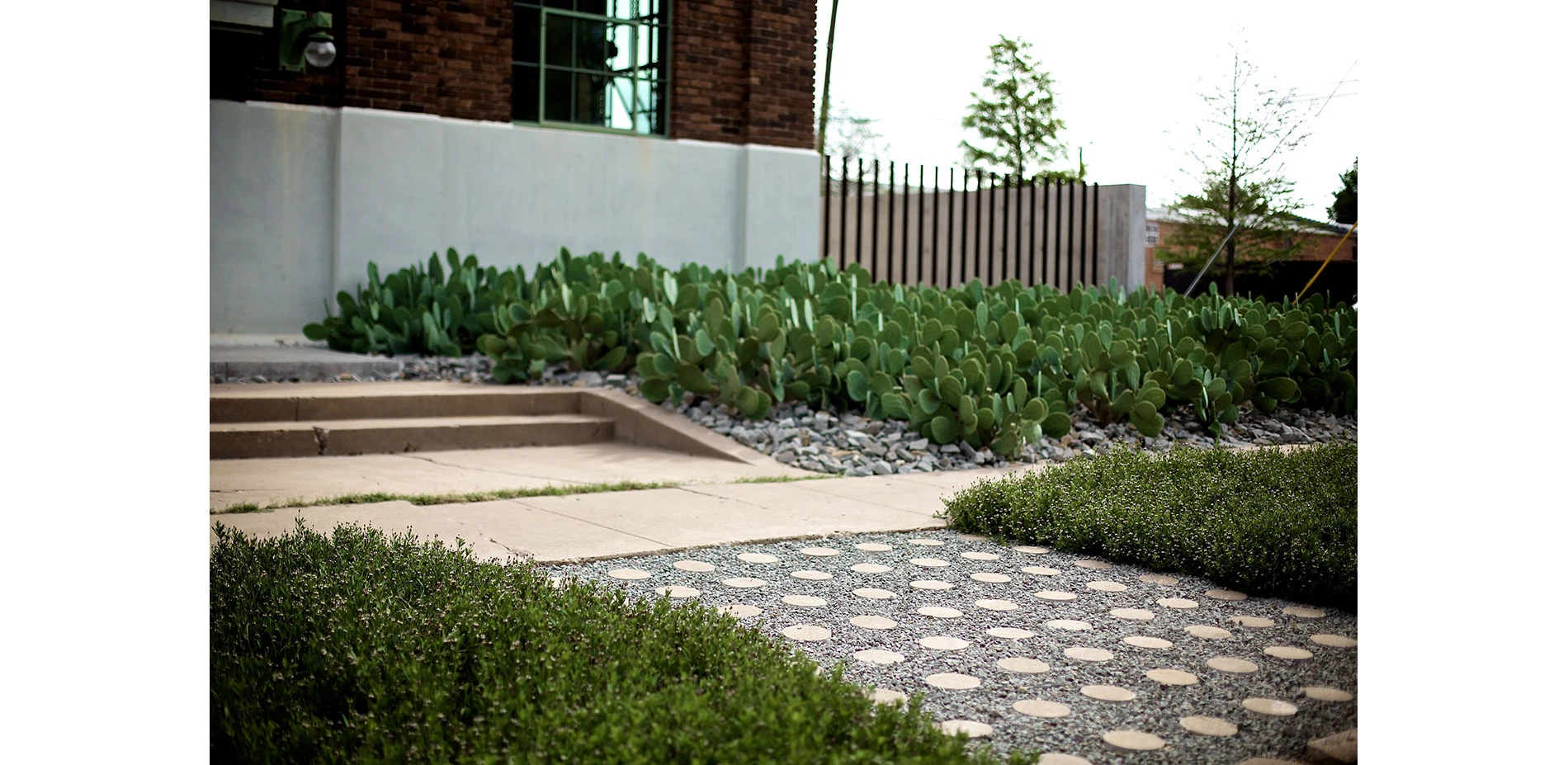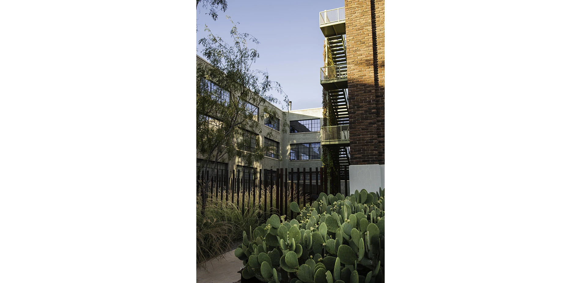 The site was healed back with extensive native and adapted plant material. Areas were strategically left unirrigated for a straightforward sustainable approach to site water management. A lone Mesquite Tree becomes a sculptural element announcing the entrance to the gardens and stair tower beyond. A colony of xeric, spineless prickly pear consumes the south and east side of the site providing an unusual and continuous graphic texture along the city sidewalks. A matrix of seasonal vine species were used on a chain-link enclosed four-story stair tower where they quickly engulfed the vertical surfaces to create a towering green enclosure. The vines provide the sense of privacy and security, and help shade the stair and building against the west Texas sun.