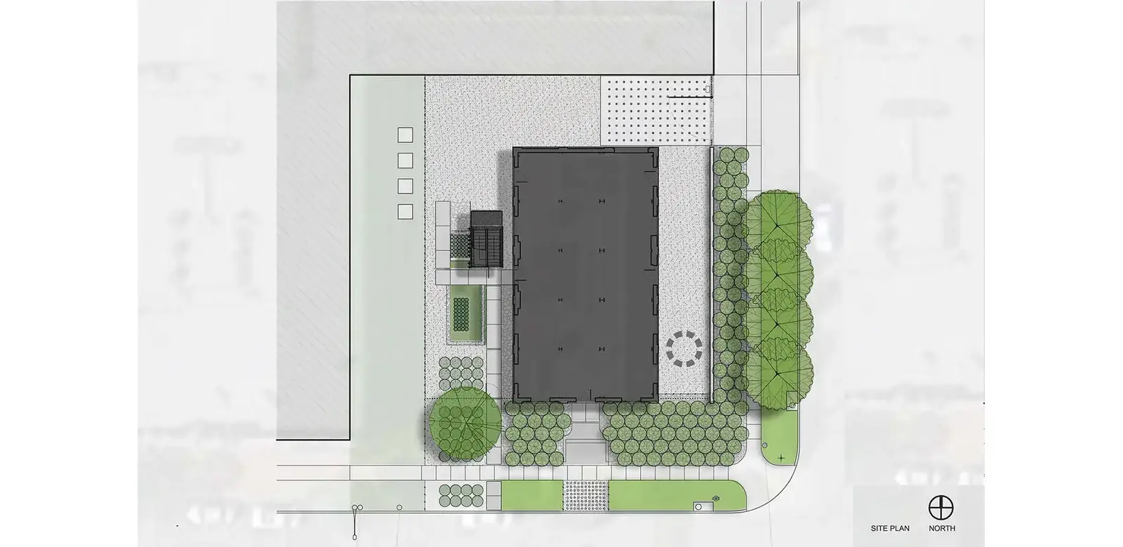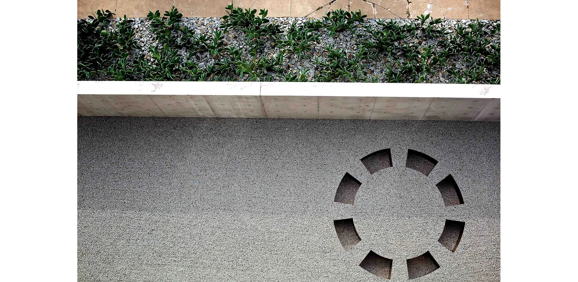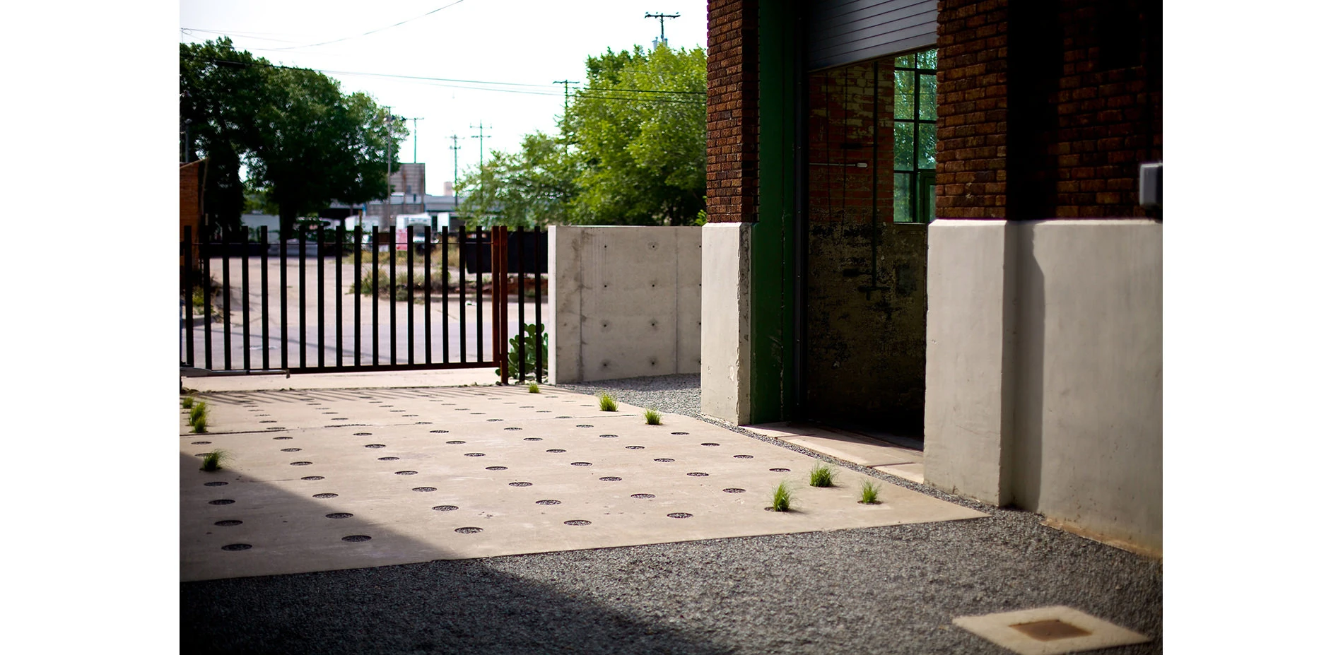 The exterior of the compound presents a unique urban streetscape experience for the flow of pedestrians travelling by on their way to the Santa Fe Trail, a bicycling and running trail. Along the eastern flank a cast-in-place concrete wall reinforces the parallel building face and street edge, while creating a minimalist outdoor room as an extension of the building’s interior. A collaborative effort with artist Jacob Kassay resulted in an elegant sculptural intervention in this space. Much of the existing concrete pavement was retained and creatively incorporated into the new streetscape design. A section of the existing concrete was core drilled in a grid to create holes for plant interventions and increased permeability. The core drills are repurposed at the main entry, an exercise in reclamation and reuse.