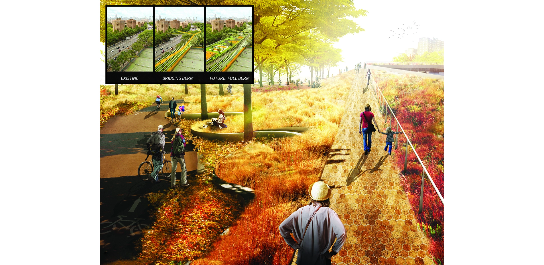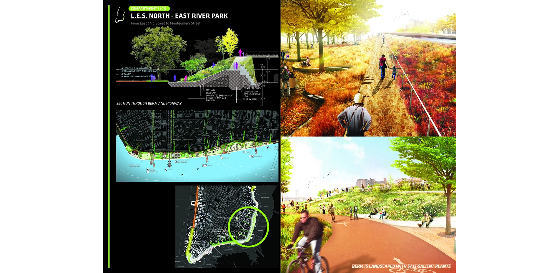 In C1, a 15-foot continuous, undulating berm delineates a new topography for East River Park that safeguards the FDR Drive and upland neighbors. New pedestrian circulation routes, a bicycle path, and frequent pedestrian bridges enhance local connection to the waterfront, erasing the barrier of the highway. Deployable street-end walls preserve traffic flow and protect the 14th Street Con Edison substation. Park programming, guided by stakeholder input, provides amenities tailored to park’s immediate neighbors, while the striking views and variegated landscapes attract visitors. Upland, the landscape architect employs bioswales and rain gardens to enhance local urban experience and create green corridors that lead to park entrances. This portion of the BIG U was awarded $335 million by the US Department of Housing and Urban Development (HUD), and will be built by 2022.