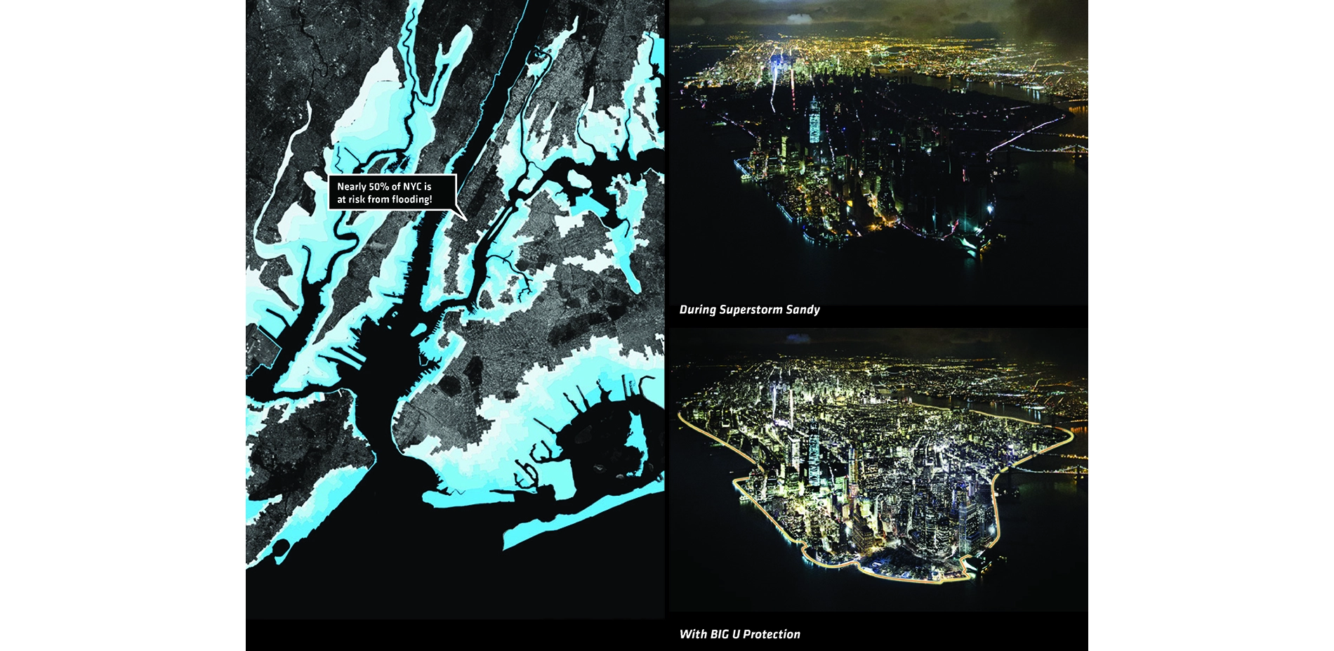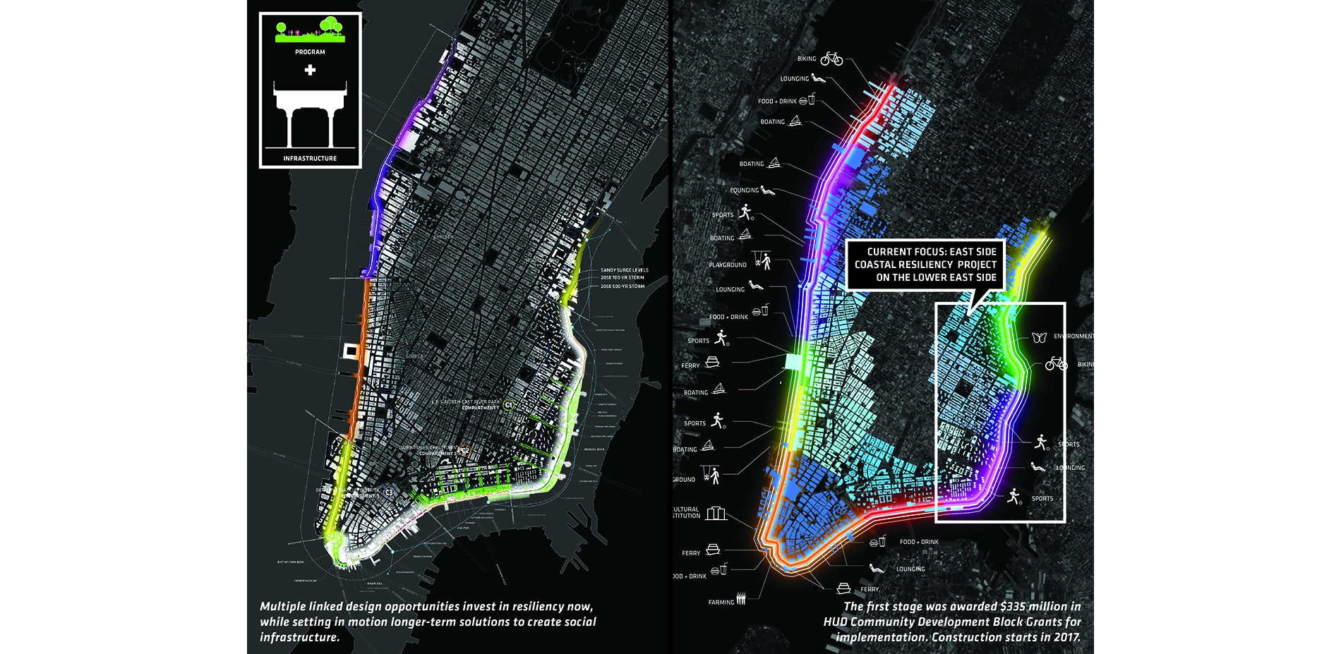 In 2012, Hurricane Sandy slammed into New York with unprecedented force, resulting in 43 deaths, 90,000 inundated buildings, untenable living conditions for 2 million residents, and approximately $19 billion in damages. The storm radically altered local understanding of the threats of climate change. FEMA’s new flood-risk zones, revised after Sandy, include 10 miles of coastline in Manhattan alone, home to 285 million built square feet, 21,000 businesses, the New York Stock Exchange and Financial District, attractions that draw 57.2 million annual visitors, and 200,000 residents (including 95,000 low-income, elderly, or disabled residents). Through the “Rebuild by Design” competition, City and Federal government challenged the design community to develop innovative approaches to protect the coast and its inhabitants from future inundation. In Manhattan, the winning idea was the BIG U.
