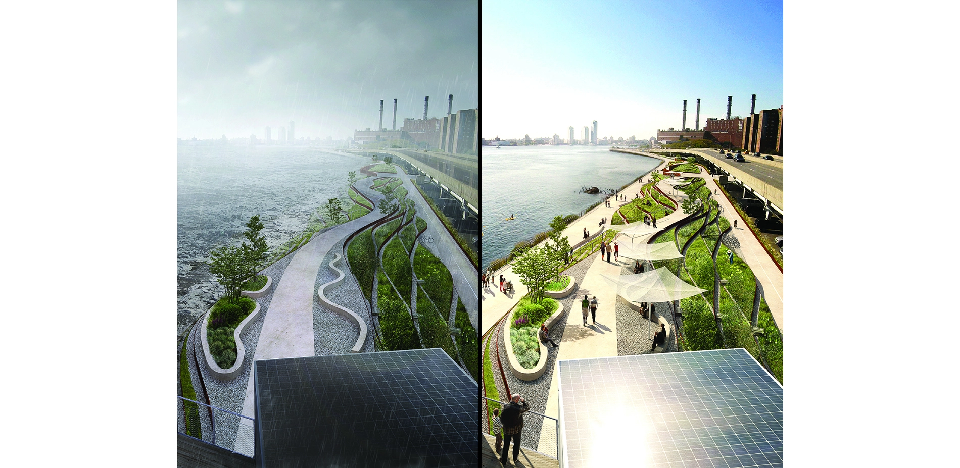 The BIG U wraps the coast of Manhattan from West 54th Street to East 40th in a ribbon of protective landscapes that defend neighborhoods from storms and sea level rise while providing locally-needed cultural, recreational, and socio-economic benefits.