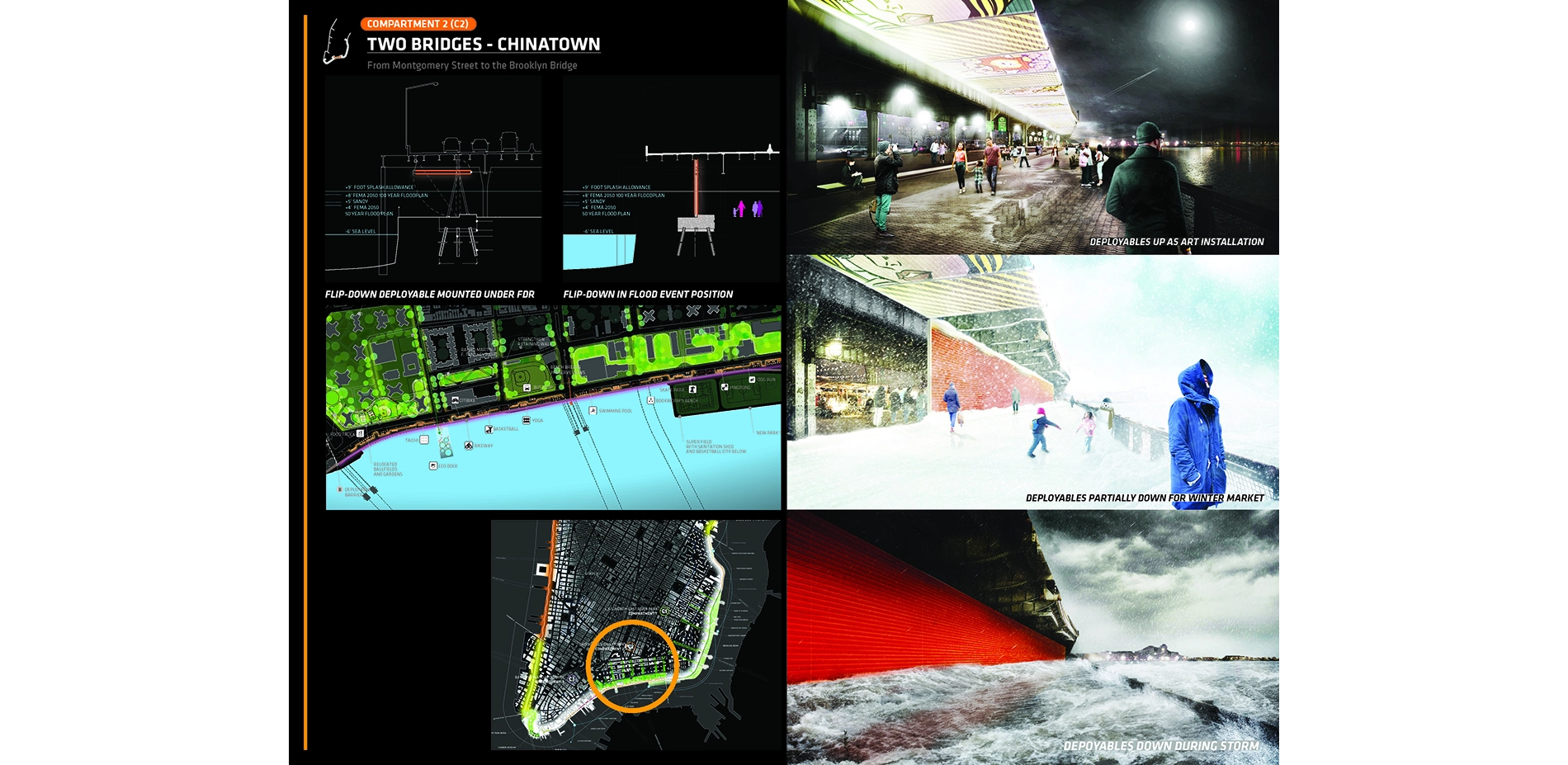 The BIG U comprises a sequence of contiguous compartments that protect a series of topographically discrete flood zones; together these compartments form a shield that will enable New York to thrive in the face of climate change. Protective interventions, design choices, and amenities in each compartment are tailored to the needs, desires, and character of the coastal neighborhoods protected. Compartmentalization allows for incremental project implementation and financing, and preserves the function of the overall protective system should any individual section fail. For Rebuild by Design, the BIG U focused on three compartments hardest hit by Hurricane Sandy: C1, from 23rd Street through East River Park to Montgomery Street; C2, which encompasses the area between the Brooklyn and Manhattan bridges; and C3, which extends south from the Brooklyn Bridge to The Battery.