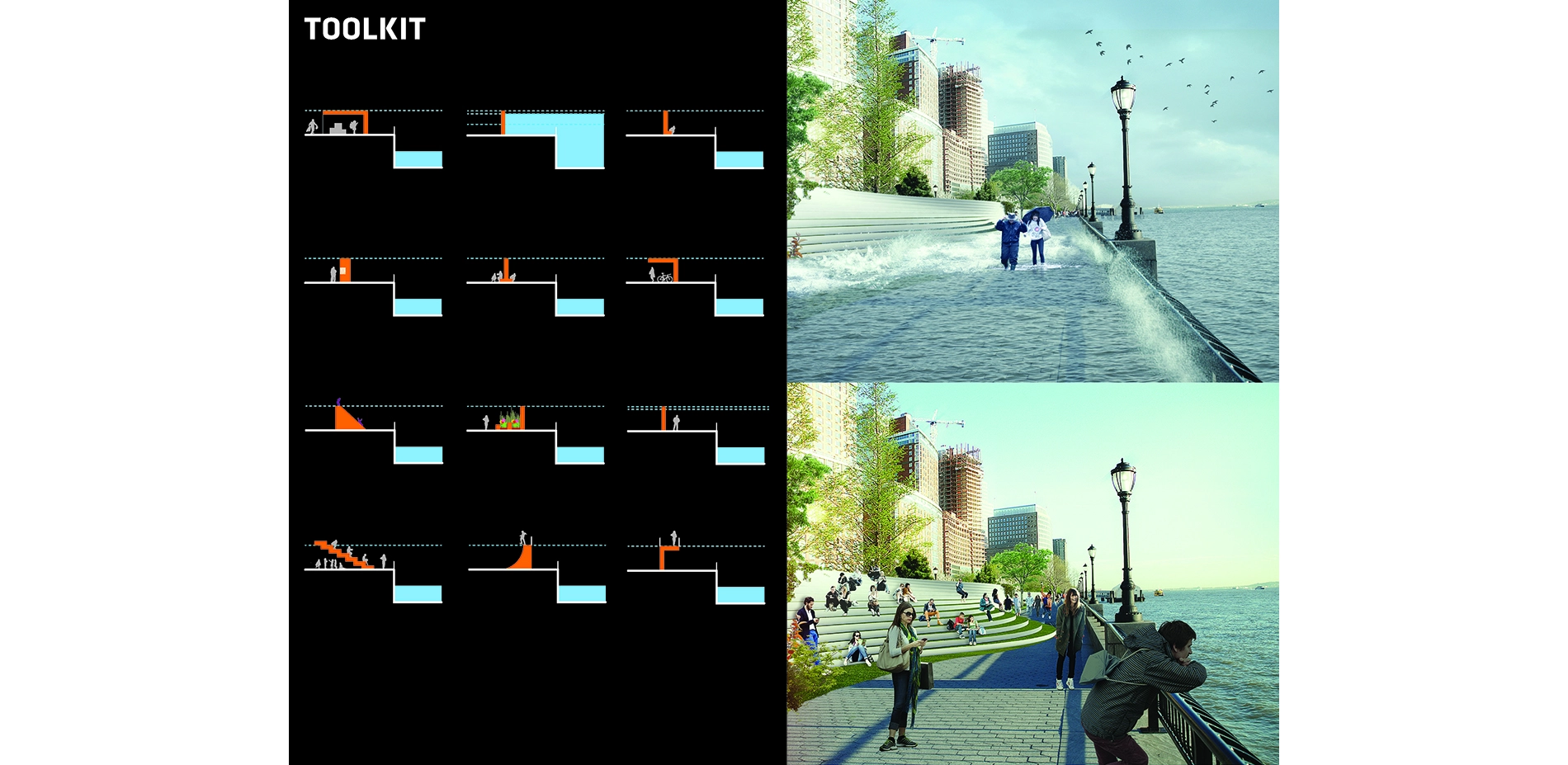 These toolkits reveal the BIG U’s essential replicability. The proposed designs are not only a thoughtful response tailored to Lower East Side and Downtown communities, but a flexible menu of solutions and approaches that can apply around the world. From Bangkok to Venice, Dhaka to Miami, at-risk cities and coastal areas are investigating defenses to protect millions of people and key infrastructure from the effects of global warming. The BIG U’s segments embody a catalog of adaptive strategies that can be applied at myriad physical scales in other waterfront communities. Moreover, its thesis, that protection should enhance communities not only physically but also ecologically, economically, and socially, stands to redefine designers’ and policymakers’ approach to resilience and sustainability worldwide.
