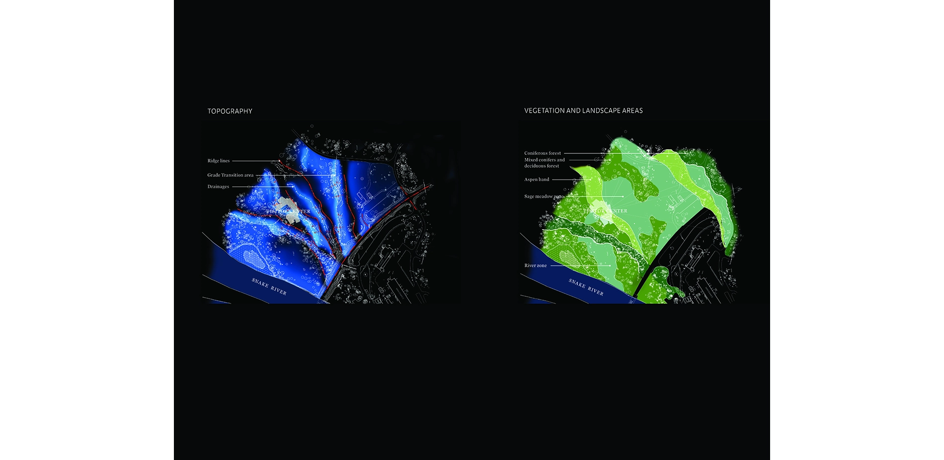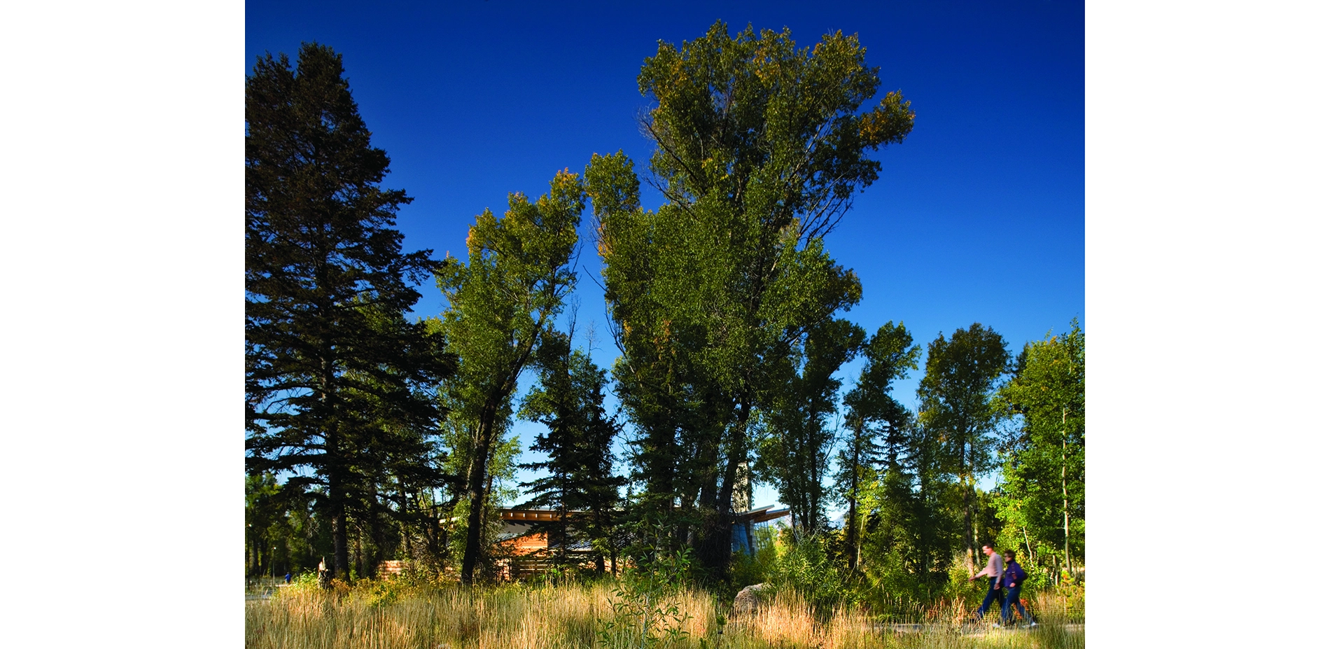 Located near Moose, Wyoming at the Grand Teton National Park’s southern entry, the Craig Thomas Discovery and Visitor Center rests between two dramatic and powerful forces: the Snake River and the Teton Mountains. Former flooding created subtle, undulating landforms that fan out through the site. Native vegetation reveals, frames, or blocks views of the Teton Range. The 12-acre site also lies at the edge of a sagebrush meadow within a riparian forest of aspen, cottonwood, and spruce. Bands of aspen, cottonwood, and spruce trees create zones with distinct character, sensory quality, and ecological function.