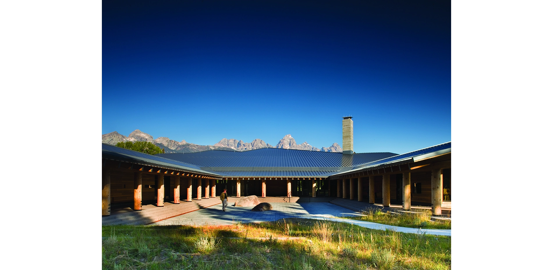 The intention was to create a visitor experience that is as emotionally evocative for a family staying for 45 minutes as it is for mountaineers traveling deep into the park. As visitors approach the building, a courtyard is revealed. The courtyard is minimal and serene, an intimate respite from the vast landscape. The space is embraced on three sides by a covered portico and seating stairs that can accommodate gatherings and park orientations. The fourth side opens to a sage meadow framed by large spruce and cottonwood trees. The Visitor Center’s roof lifts upward and away from the courtyard, its jagged peaks mimicking the Teton ridgeline. Entrance through the portico into the building reveals a wall of windows with soaring views across the meadow to the moraines and the spectacular, ever-changing mountain range beyond. An outdoor terrace invites visitors out of the building to the edge of the aromatic sagebrush. The sequence of courtyard, building, and terrace introduces and binds visitors to the place, and prepares them to experience the powerful environment of the valley and Teton Range.