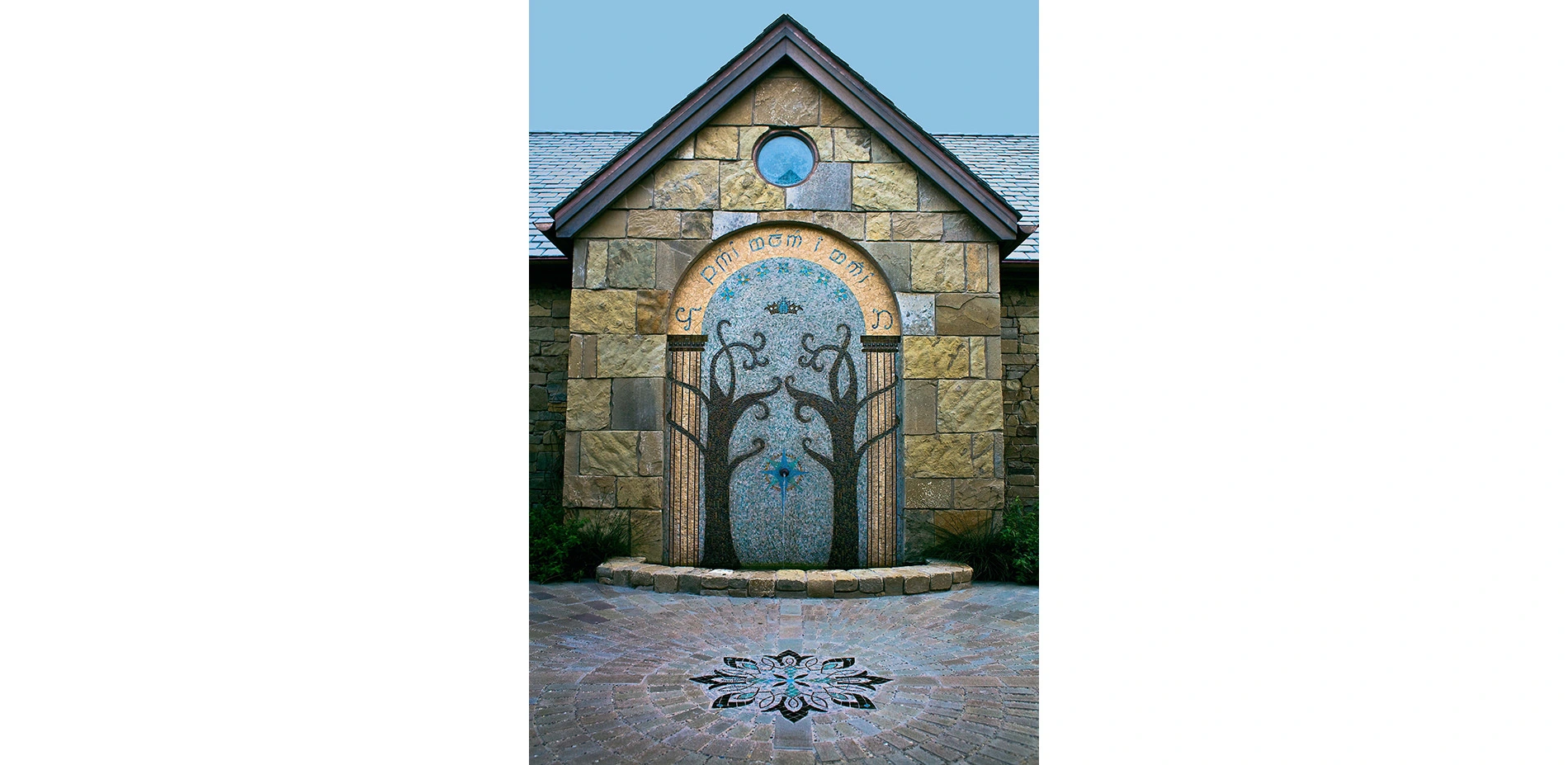 The garden features a robust water catchment system, planted roofs and the Mirror of Galadriel. Native plantings and quail habitat rest at the feet of deities. Ruin walls emerge from overflow winter ponds.