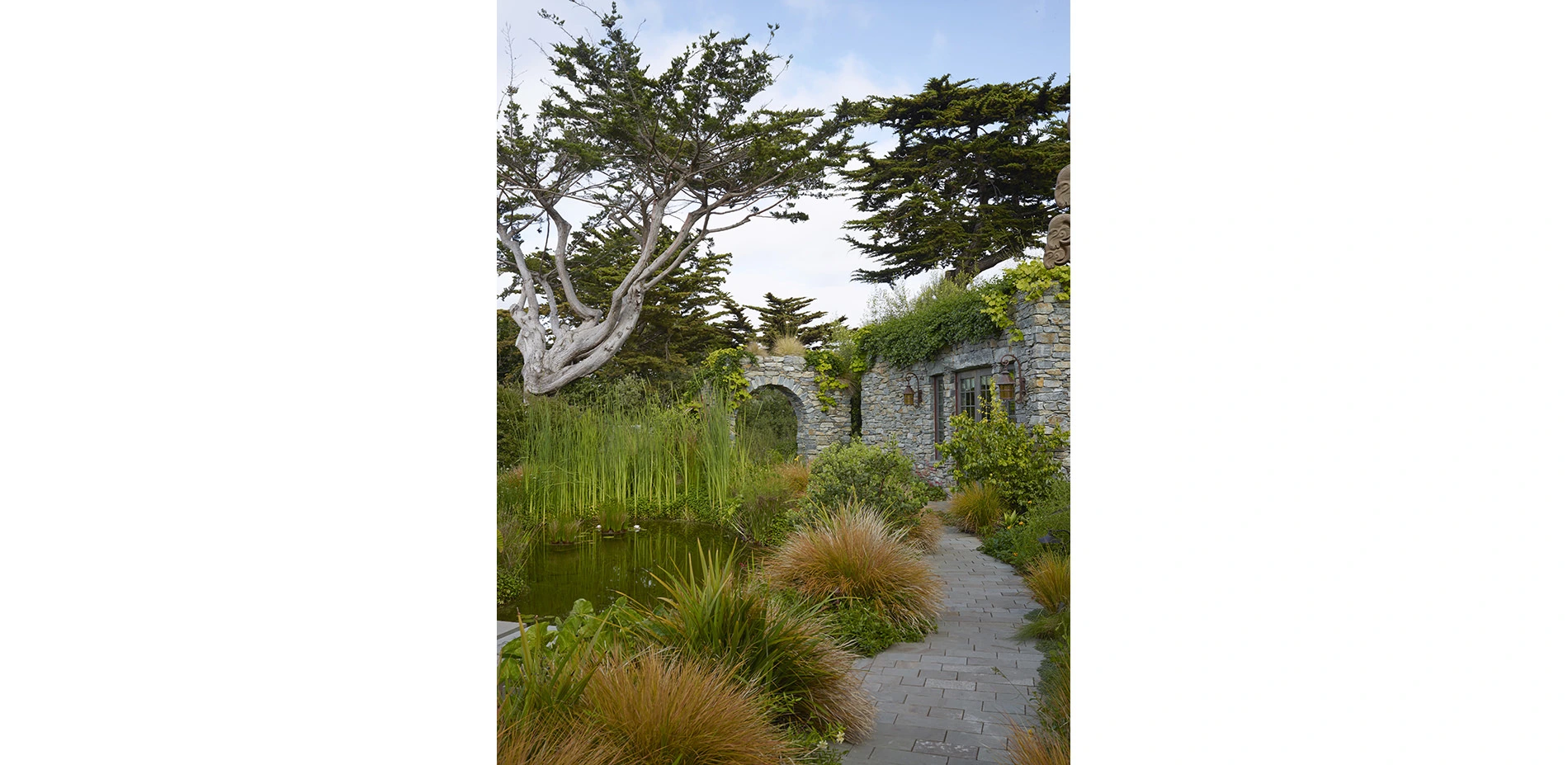 This is a coastal site and subject to punishing, salt laden winds and a thick, ethereal fog. The ¾ acre site is nearly level, the soil is sand and the site receives an average of only 19” of rain a year. Water management was integral to the design of the project. The site’s greatest natural feature is the historic Monterey Cypress, which ring the perimeter.