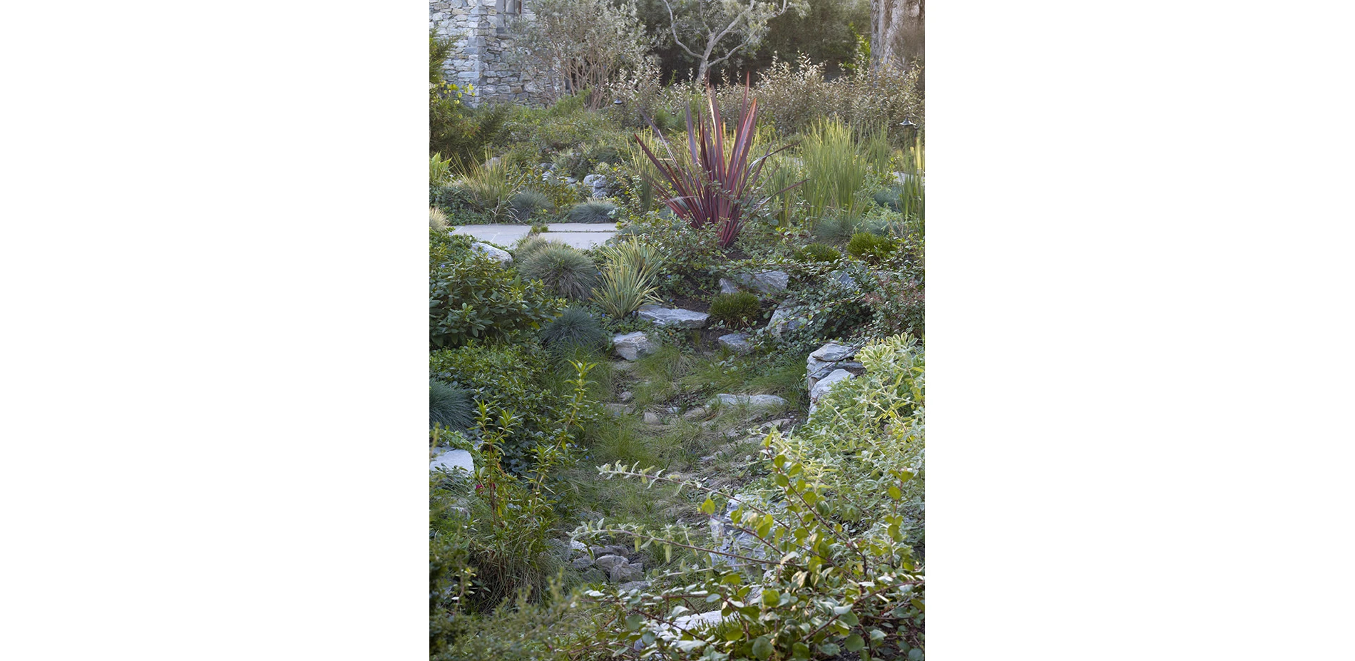The resulting landscape is meaningful on multiple levels. The visual narrative, the art, the craft and the native plantings all define this garden. What lies hidden tells an equally important story in the making and maintaining of a garden that is responsive to site and resources. It is a blend of poetic interpretation and water calculation.