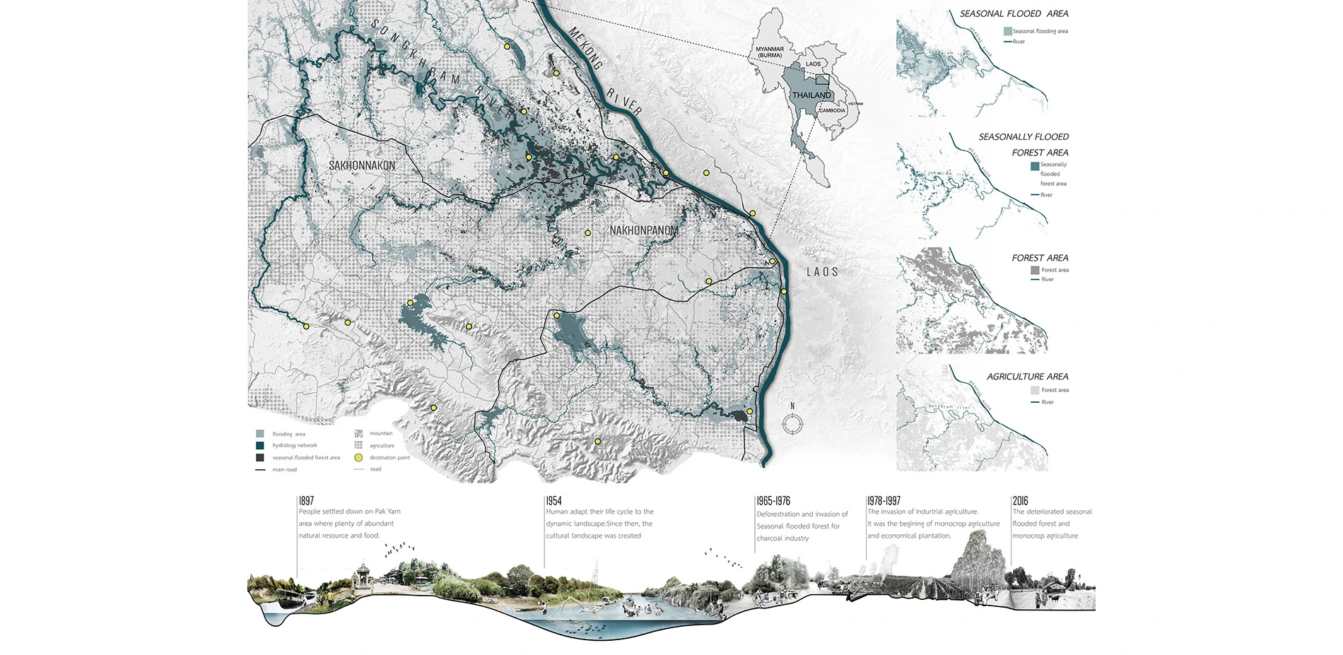 Located in Nakhon Phanom province, northeast of Thailand, this proposal aims to reclaim and preserve Seasonally Flooded Forest that was trespassed and destroyed by charcoal industry and industrial agriculture since 1965. By restoring and conserving the seasonal flooded forest in area of Pak Yam village, a rural landscape is proposed to relink human to seasonally flooded forest which was harmonized between life and nature, to create the space for better quality of life and become Nakorn Panom's provincial tourist attraction, in terms of ecology and cultural landscape. Understanding this dynamic landscape that benefits positive effects toward human beings, Ecological Gateway to seasonally flooded forest, educational space between interface of seasonally flooded forest and Dry evergreen forest have been proposed to the area. Through analysis on seasonally flooded area, landscape character, vegetation, annually activities and site potential, adaptable design is the key for living on this area and symbolizing the awareness to other people.