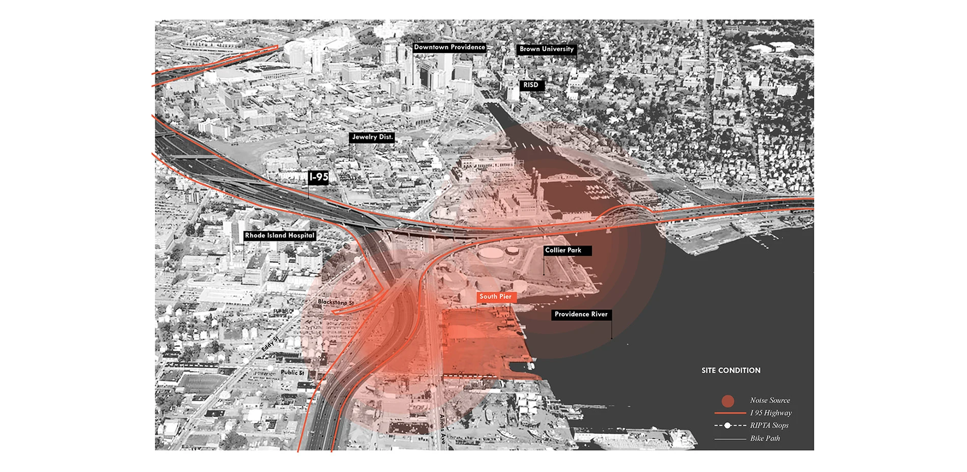 The design for South Pier Park in Providence, Rhode Island, seeks to provide habitat for species as well as human access to the waterfront in an urban context. By introducing two main target species with strong acoustical characteristics, the proposal of this project develops a sound co-habitat. When going through from the city to the water, visitors experience a transition from the sound of the I-95 highway into the site, moving from the sound of