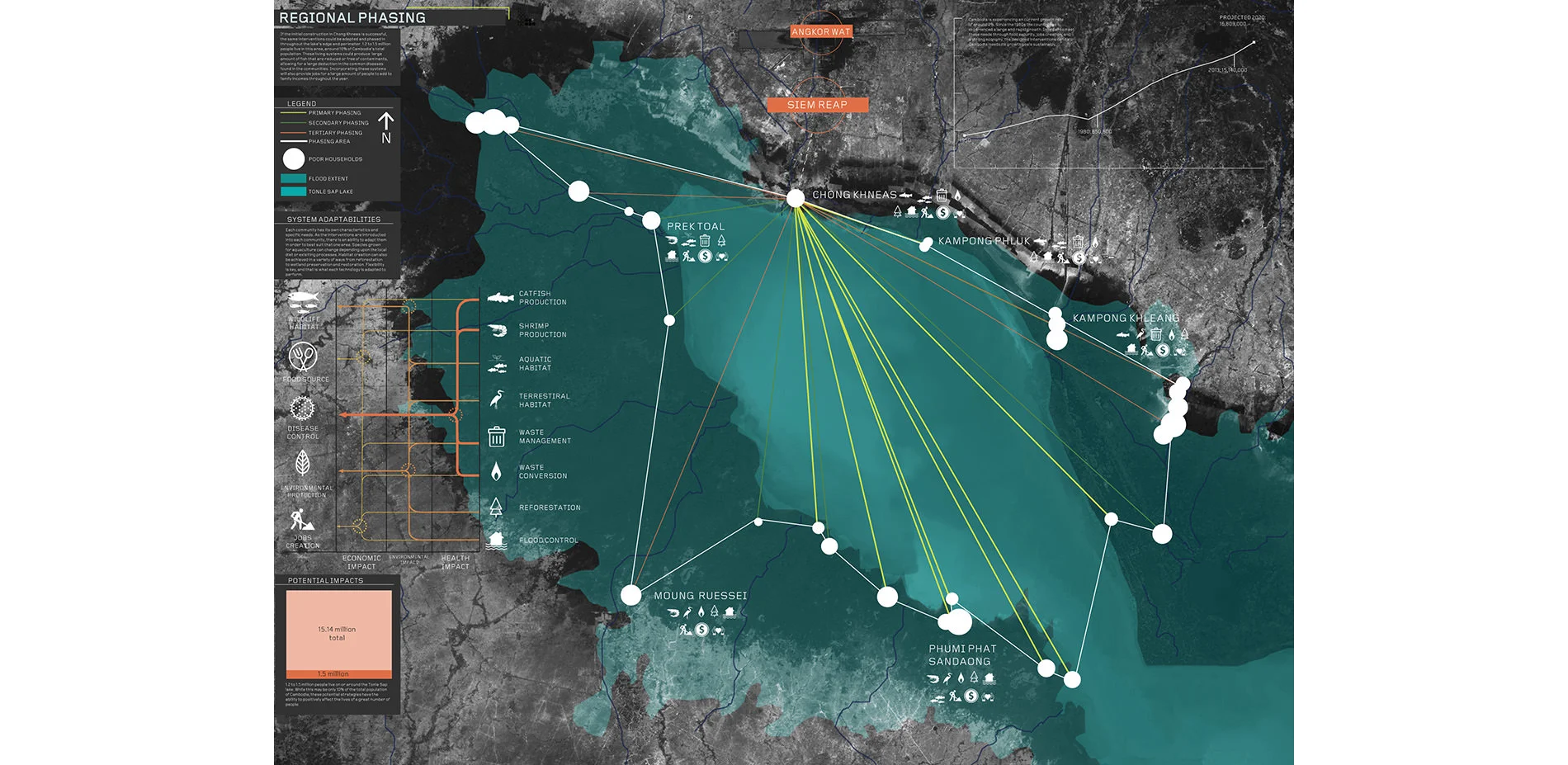 As the largest freshwater lake in Southeast Asia, Tonle Sap, located in the heart of Cambodia, is a highly productive and volatile system. Currently, 1.2 to 1.5 million people move with the lake’s temporal change each year, but live in poor and unhealthy conditions. The goal of the project is aimed at how to interpret the native landscape and nature of the lake while improving the overall quality of life for the communities that call it home. Three main strategies are designed to improve the