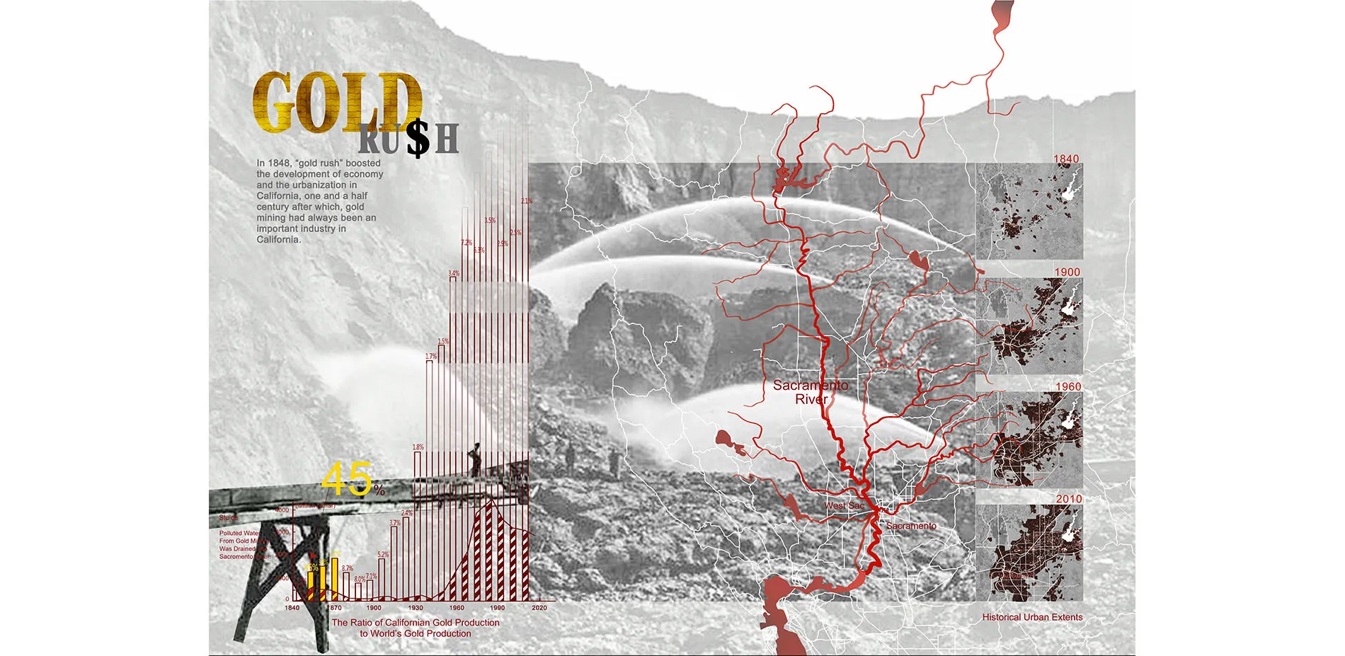 The project, named 'from Gold to Pearl' proposes a framework of eco-friendly industry catalyzing river revitalization for river waterfront landscape design and takes advantage of various ecological problems, such as an excess of sediments and heavy mental and degradation of riparian habitats that stem from Gold Rush, as opportunities for Sacramento River revitalization. This project seeks to make full use of the unattractive vacant areas along Sacramento River in order to achieve riparian ha