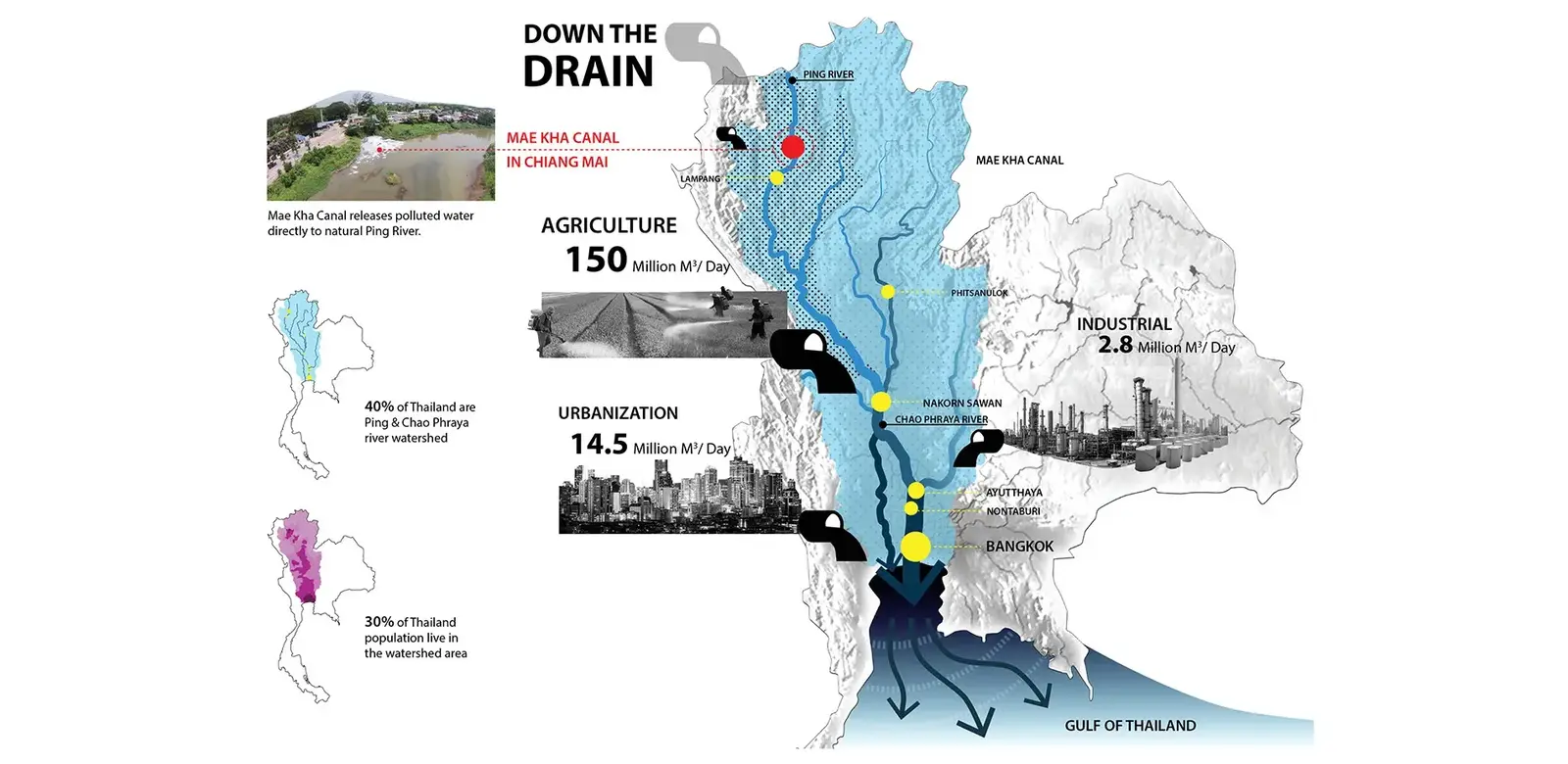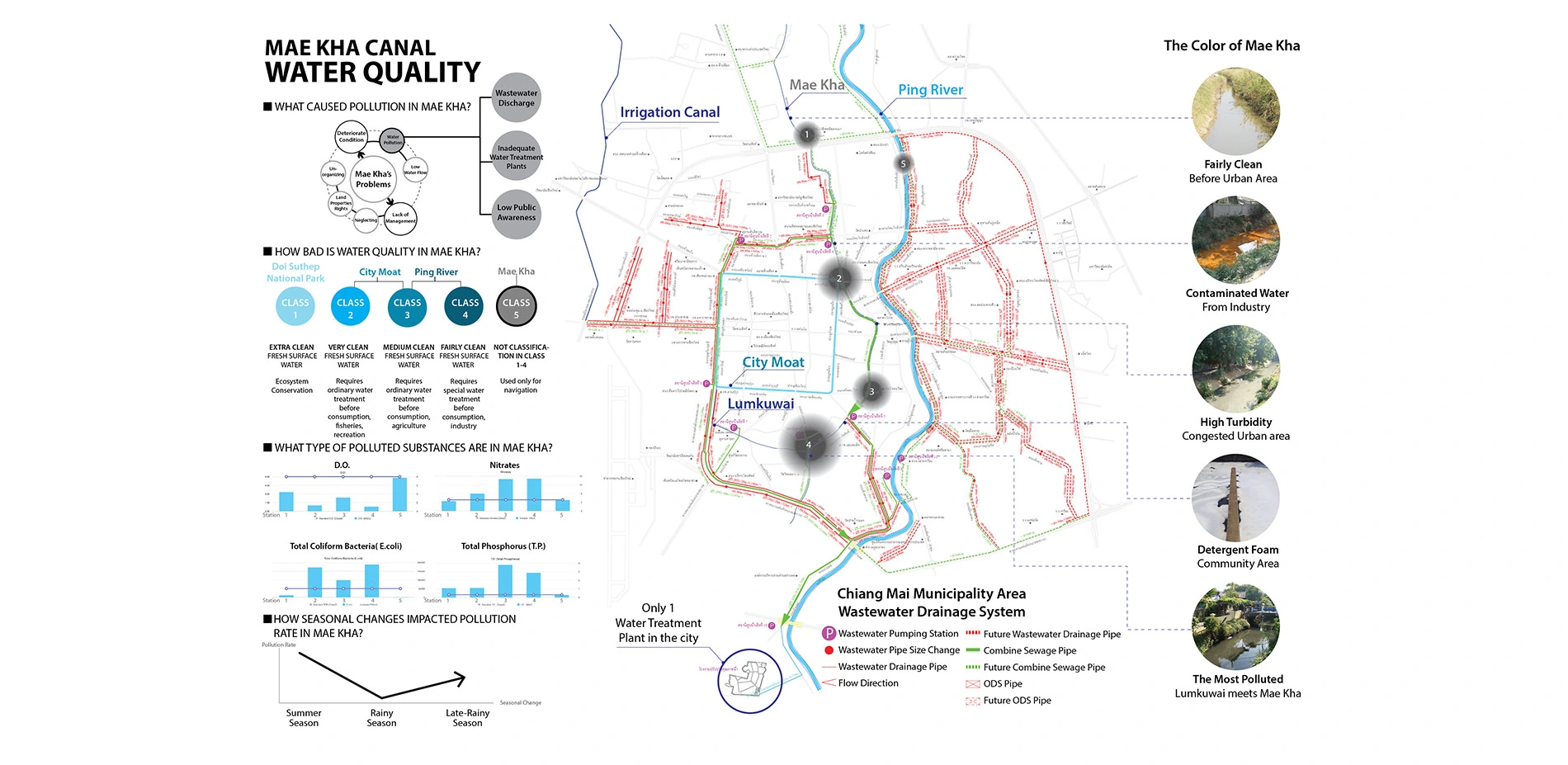 Chiang Mai is the most significant city in northern region of Thailand. The city is greatly benefited from freshwater sources that originate from national park. These water sources flow to the south and nourish the center of Thailand. Overall Chiang Mai water systems are in good condition except for Mae Kha Canal. The canal was excavated as a second layer protection from flooding when the city was established in 1296. In the present, the canal is heavily contaminated from sewage and city drainage, especially when it flows through urban areas. Because of the city’s expansion, and internal migration, communities along the banks have grown and occupied the canal, which make Mae Kha Canal narrower. Moreover, deforestation and poor sewage management create more degradation, thus the canal is unable to perform ecological and recreational function.
