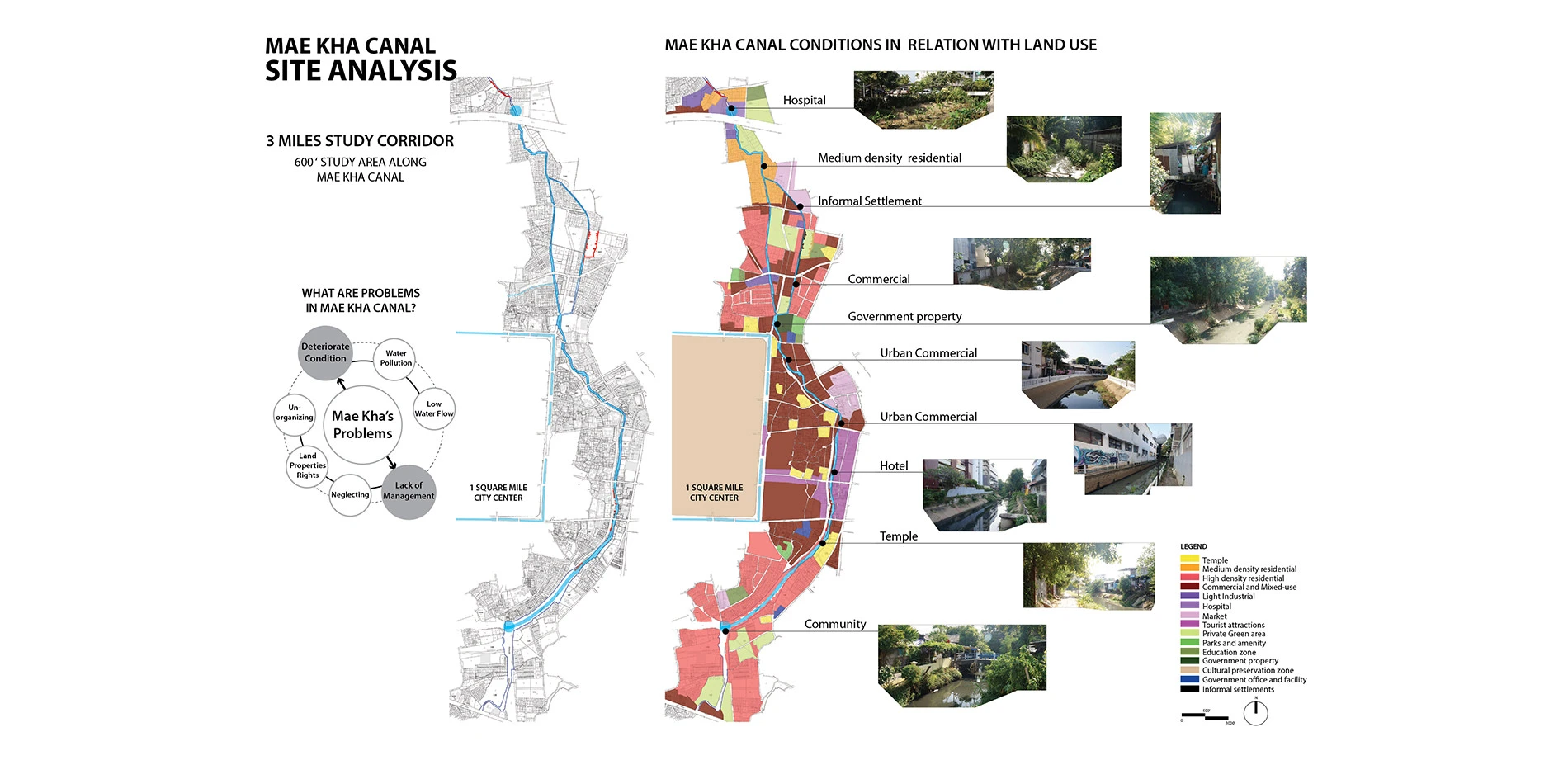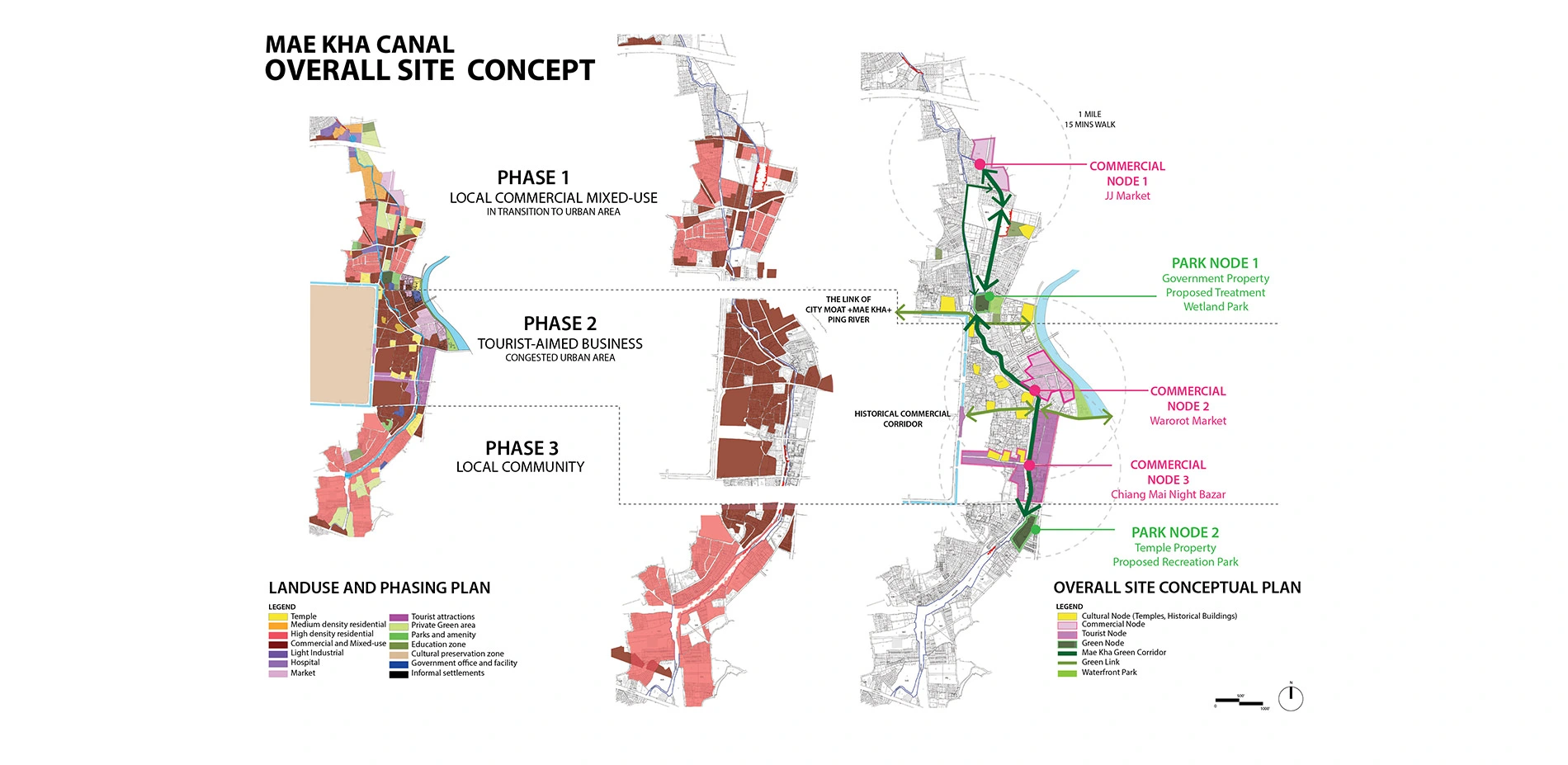 Prior to a design phase, the city, land use planning, water system, and the canal were examined from document analysis, site observation, and interview. According to document analysis, there two main urgent problems of Mae Kha Canal: water quality and lack of management. Water quality data from Chiang Mai University illustrates that the canal starts to be heavily polluted at the highway and getting worse as it flows south. Thus, the studied area focuses on the three-mile canal that runs through the urban area. In this area, the water is classified as type 5 which can only be used for navigation. After the site has been defined, the context, regulation, and existing conditions have been studied. The existing land use determines 3 design phases: local commercial mixed use to the north, tourist aimed business in the center, and local community to the south. In each phases, this study proposes to develop commercial nodes and park nodes that respond to local activities and property rights.