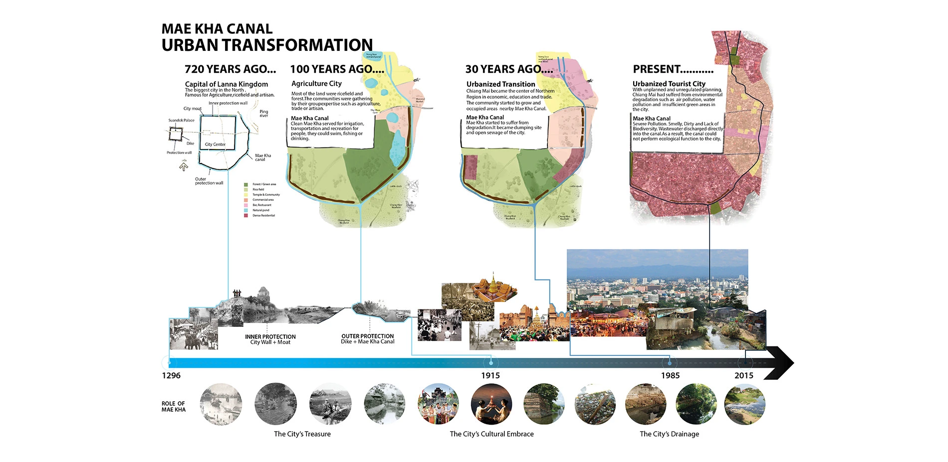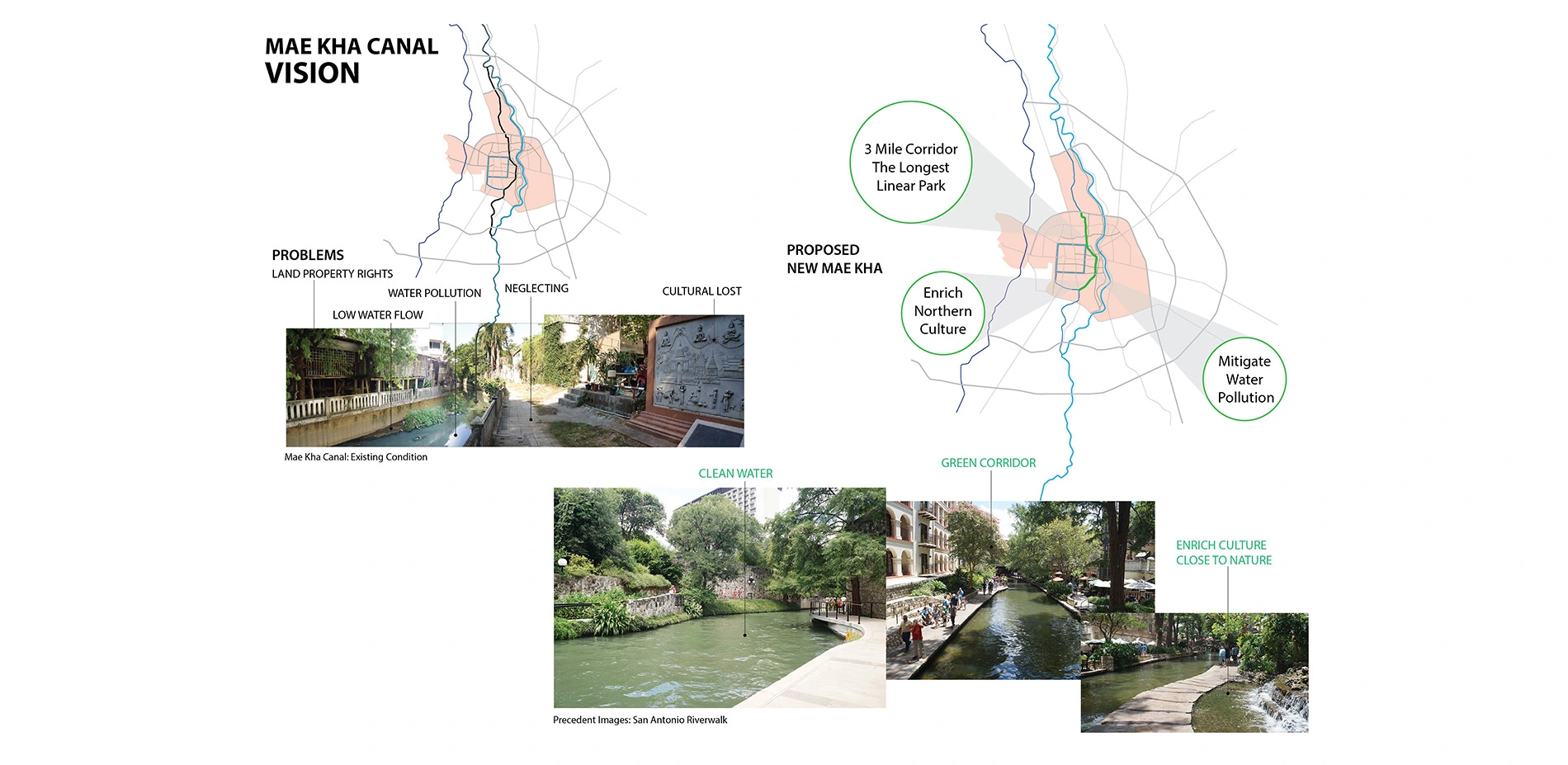 Having roles as a city guardian, cultural features, and irrigation system, Mae Kha Canal was one of the most important components of Chiang Mai water system. Unfortunately, the unregulated growth due to a rapid urbanization since 1985 has caused the canal to suffer with massive amounts of pollution. As a consequence, the city turns its back on the canal, and makes it a dumping site. This project provides a comprehensive study and thoroughly analysis in historical, environmental, and planning aspects. The proposal aims to revitalize the image as well as reestablish a relationship between people and nature. In order to achieve a sustainable development of Chiang Mai, three water treatment methods are proposed in accordance with the existing land use planning aiming to create a linear park framework along the canal. Moreover, a landscape urban infrastructure is proposed to be a pilot project of wetland water treatment. The design demonstrates the strong capability of landscape intervention that can resolve the severe problems of water quality and bring about quality of life.