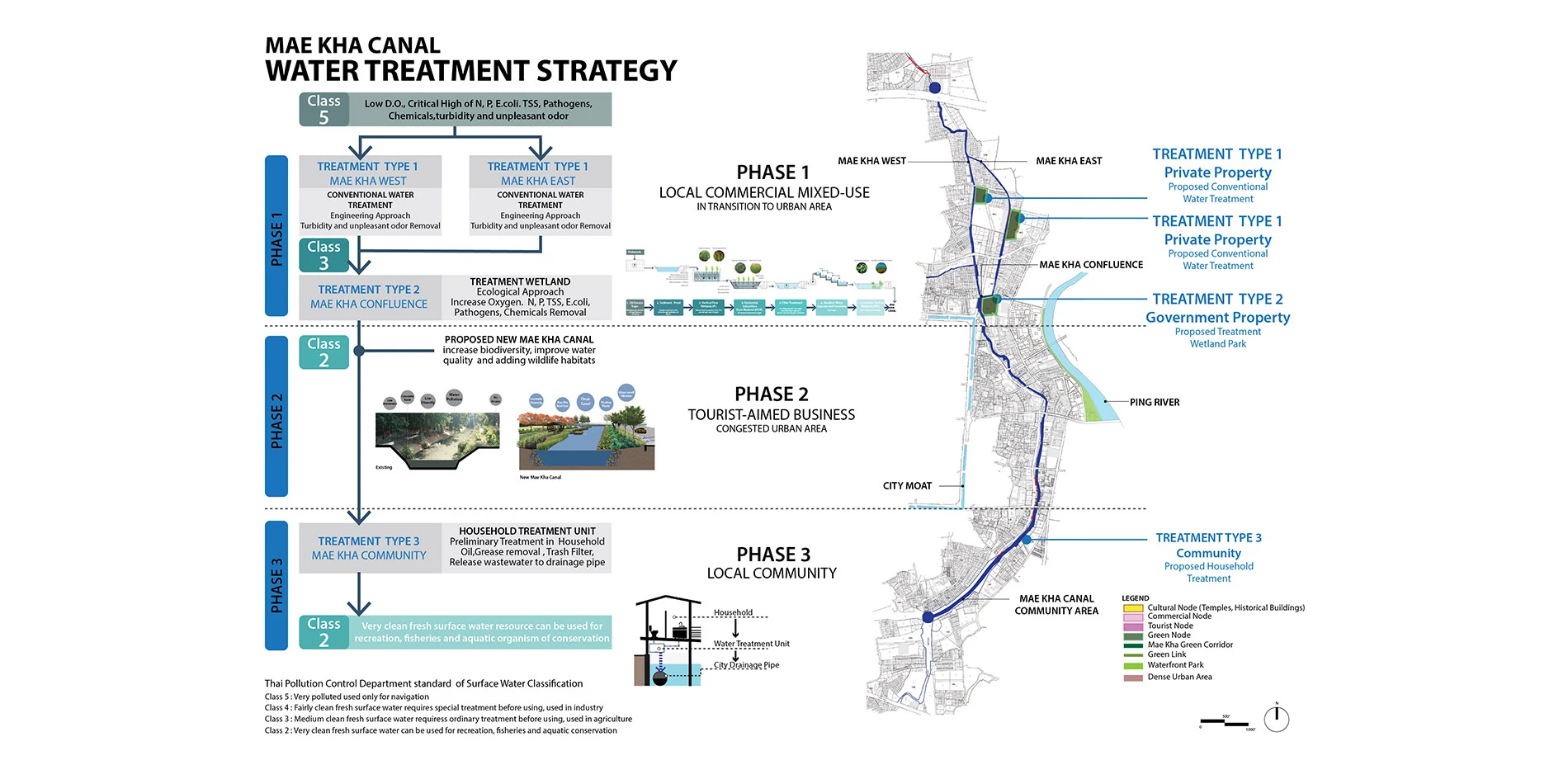 To help mitigate the issue of water pollution, this project focuses on Mae Kha Canal, the most degraded urban canal in the North, with the aim of creating a sustainable future for the degraded urban canal. It aims to promote ecological and sustainable approach in improving water quality in Mae Kha Canal. In an urban scale, it suggests a Green Corridor along the canal where people can interact with nature and enjoy recreation spaces. it intends to promote a stewardship program that encourages participation of communities, government, organizations, stakeholders and private sectors in coordination to Mae Kha Canal development. In a site scale, it proposes a landscape infrastructure of an urban wetland park in the North of Thailand that integrates ecological processes and recreation spaces. As a pilot project of wetland water treatment, the infrastructure will demonstrate and help educate people to learn how to purify water by using ecological methods and the benefits of long- term maintenance and development. Moreover it will articulate Mae Kha Canal’s historical significance and culturally rich in order to encourage a sense of preservation and respect.
