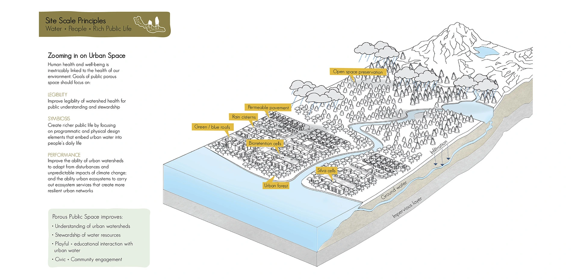 Our Porous Public Space booklet is a response to the built environment’s detrimental impacts to our cultural and ecological systems. We use the term porosity in a dual sense: to characterize changes to the physical built environment as well as building social infrastructure through an inclusive community-based design process. We reframe the conventional wastewater treatment of urban rainwater instead as an opportunity to keep rainwater above ground for community delight, store it for reuse, clean it for healthy aquatic habitat and infiltrate it for groundwater recharge. Porous Public Spaces intertwine ecological design with urban design. We use strategies from both design frameworks to bring people and rainwater together in cities, to create vibrant public life. Porous Public Spaces build social connectedness around water, stewardship of local water resources, understanding about the hydrological cycle’s interaction with the watershed and the city’s context within the larger watershed. We define seven watershed and site-scaled principles that double as a guide for the design process and as a checklist to evaluate existing public places. We apply our principles for design and evaluation to streets, plazas and neighborhoods by redesigning common street typologies and evaluating exemplary sites through case studies. In the booklet, our two and three-dimensional diagrams illustrate how commercial, residential, and mixed-use streets can be reconfigured into Porous Public Spaces through application of our Full Water Cycle, Human Health + Well-being, Full Soil + Vegetation Cycle, and Adaptive Design principles. Through both the community-based design process and experience of place, the booklet focuses on interweaving urban rainwater into the network of our built environment and collective consciousness to simultaneously improve both human and watershed health.