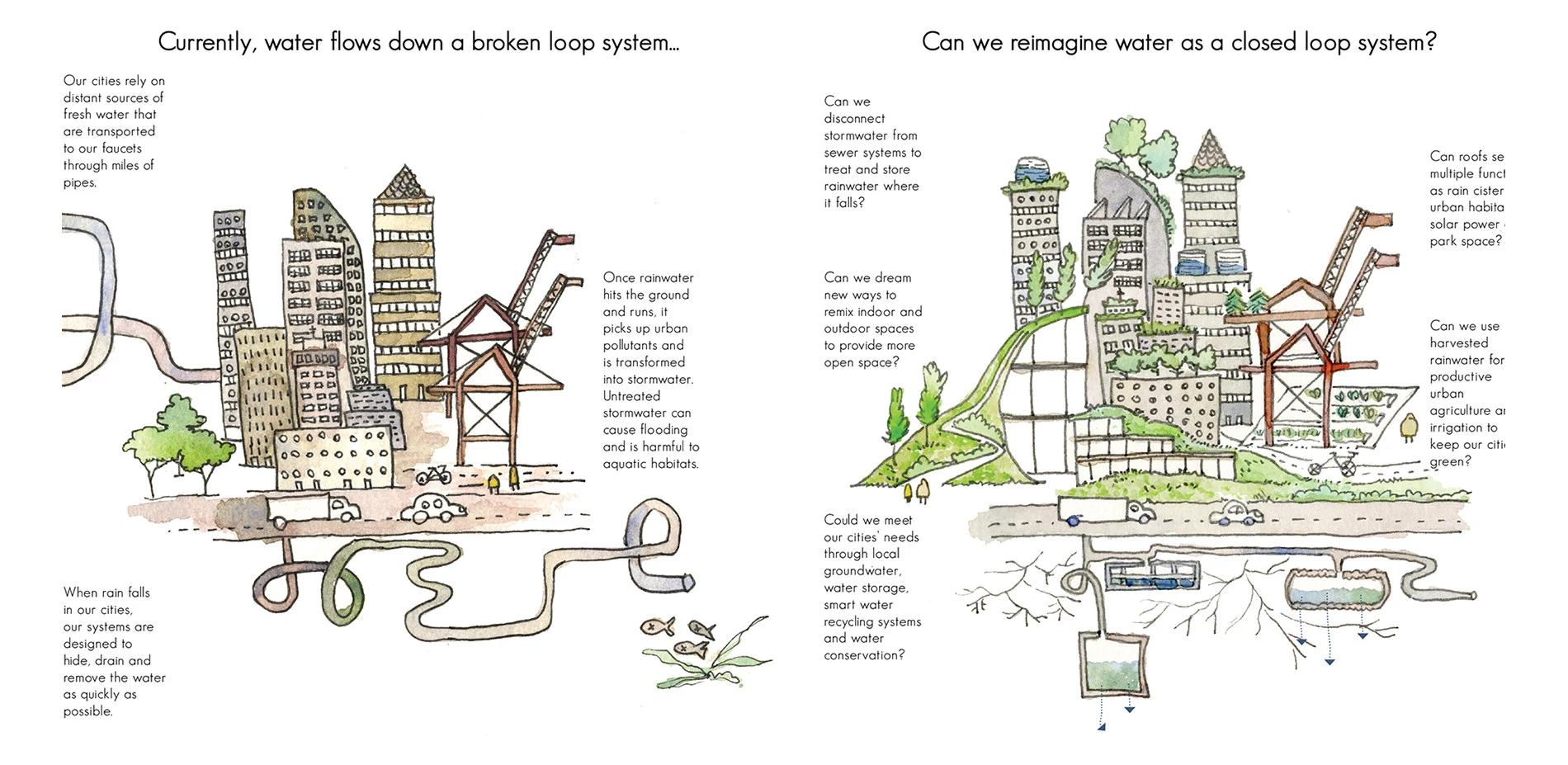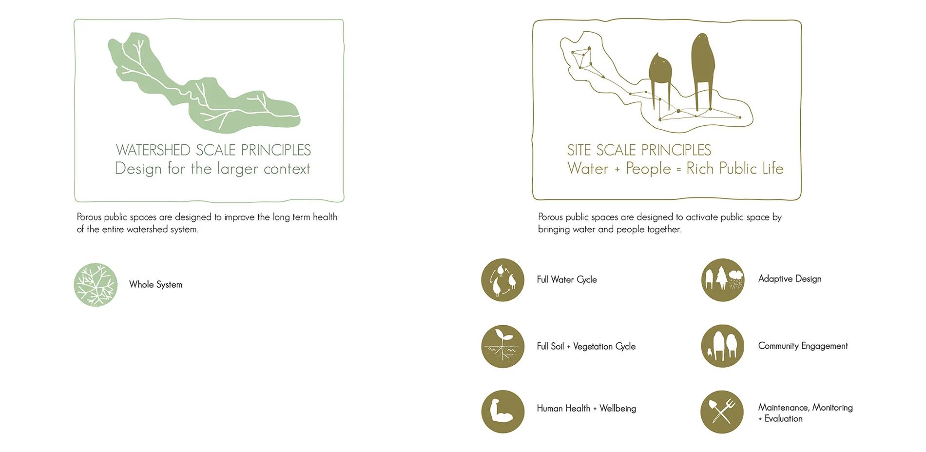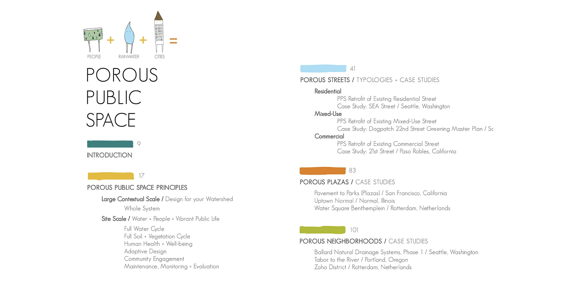 Our porous public space booklet takes the reader on a whimsical journey, playfully intertwining people and rainwater in our cities. It is a tool to deconstruct the concepts and terminology of green stormwater infrastructure because, although the term is widely understood in built environment fields, to the layperson the phrase can often be meaningless. We break the concept down to the basics of designing our built environment to improve both human and watershed health, framing the environmental problem of stormwater as an opportunity to design good public places using rainwater in our streets, plazas and neighborhoods. Presenting a framework that structures a porous community-based design process, we outline seven Porous Public Space principles to create an inspirational and actionable toolkit for communities, designers and local officials to collaboratively design solutions for improved urban watershed health. The booklet is an inspirational tool to bring consciousness to urban rainwater, embedding its presence into our narrative and experience of everyday life.