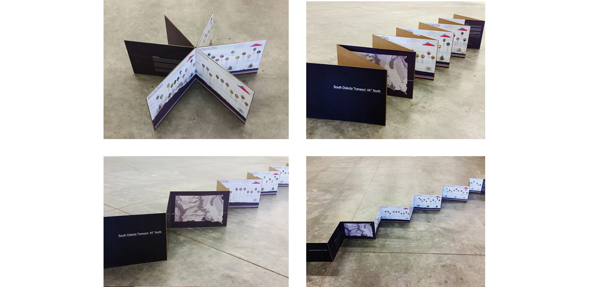 South Dakota Transect is an accordion book that transects the state of South Dakota in half from West to East along the 44th parallel and looks at the plant material along that parallel through its association and dependence on climate, temperature, precipitation, soil substrate, top soil, organic matter, water holding capacity and other cultural requirements. The state of South Dakota, located in the Northern Great Plains, is divided in half by the Missouri River. At first glance, the state appears to have a fairly homogenous distribution of plant material, but through this transect, the diversity of plant material across the state is revealed and clearly articulates the differences in plant populations and the reasons those specific species populate the regions across this particular stretch of the Northern Great Plains.