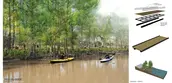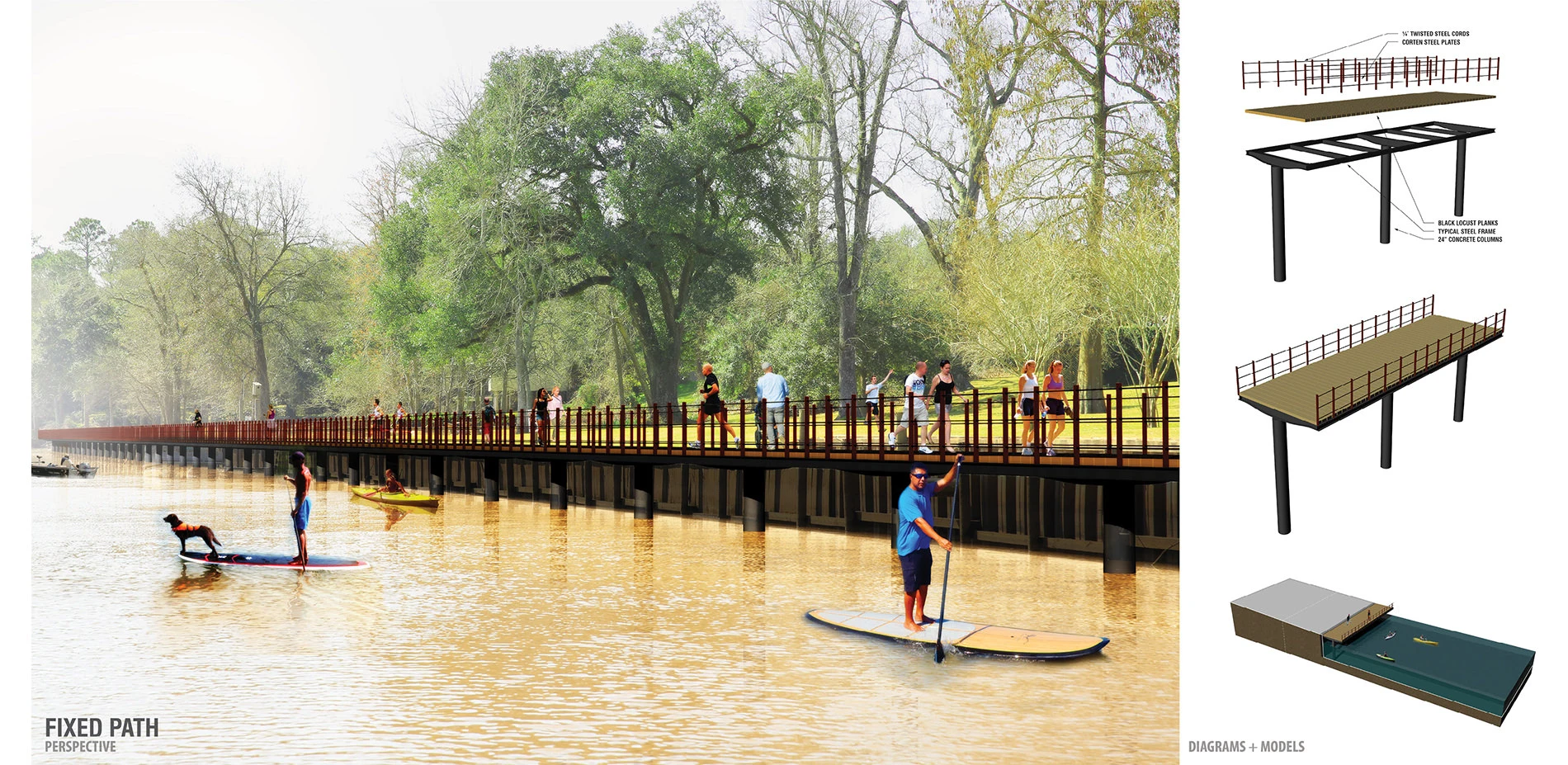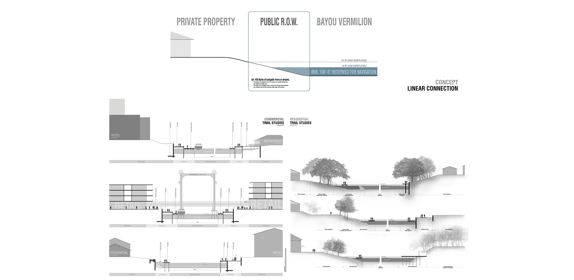 According to Article 456 in the Louisiana Civil Code, land that is between the high-water mark and low-water mark of a navigable waterway is considered the river’s bank, and the bank of a river is subject to public use. Over time, this legal reality has largely been ignored and not enforced; however it means that the banks of Bayou Vermilion, between low-water and high-water marks, can be appropriated for use as a public right-of-way and therefore become a recreation-oriented public corridor. This statute from Louisiana’ Civil Code should neutralize the assumption of implied ownership among those who have built along the bayou’s banks. A boardwalk will serve as a link on the one-mile stretch of the bayou between the open space connection and the mixed-use center with multiple destinations along the route to encourage users of the trail. With new elements such as a sculptural bridge, museum of local culture, active recreation areas, high-density residential units, and an urban waterfront retail corridor, the re-imagined Bayou Vermillion will serve to stimulate the public’s interest, appreciation and use of this small but vital waterway as an extremely versatile amenity rather than as a one-dimensional drainage corridor. The intent of this project is not only to express an idea for how one community could re-activate its waterway but also to create a model for waterfront access for other Louisiana communities that have similar waterway situations.