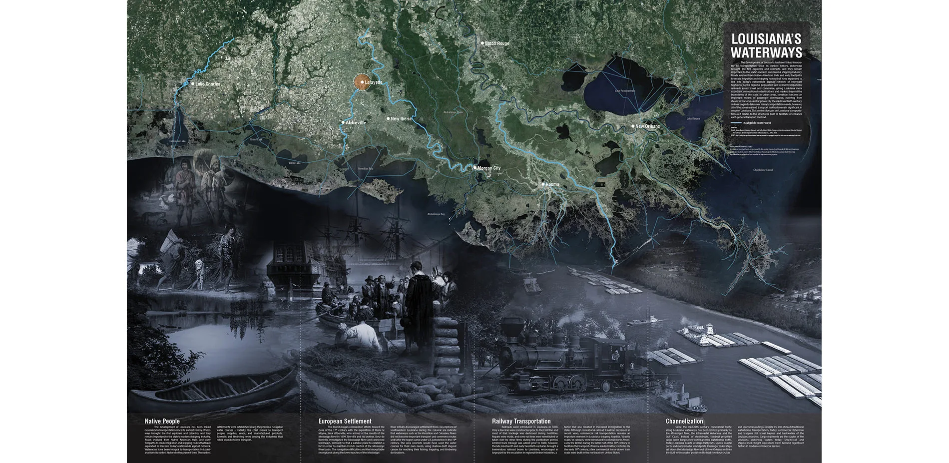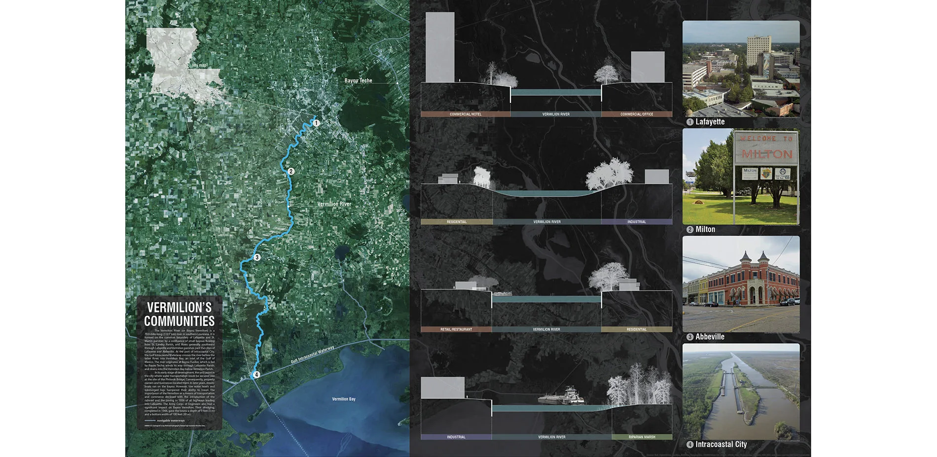 In Southern Louisiana, settlement began around the region’s small bayous and waterways because of their commercial capacity as transportation networks. The effects of this phenomenon are recognized throughout the urban history of the region but are less evident in the contemporary design cultures of these communities. Due to the onset of post WWII industrial navigation and advancements in transportation technology, massive transformations have evolved among these smaller Louisiana communities. The waterways that these small cities have settled around have become neglected in terms of planning focus, development, and public appreciation. Lafayette, and its Bayou Vermillion, serves as a worthy case study for this state-wide phenomenon because, while the community has a rich cultural connection to Bayou Vermilion, over time, it has turned its back to its waterway.