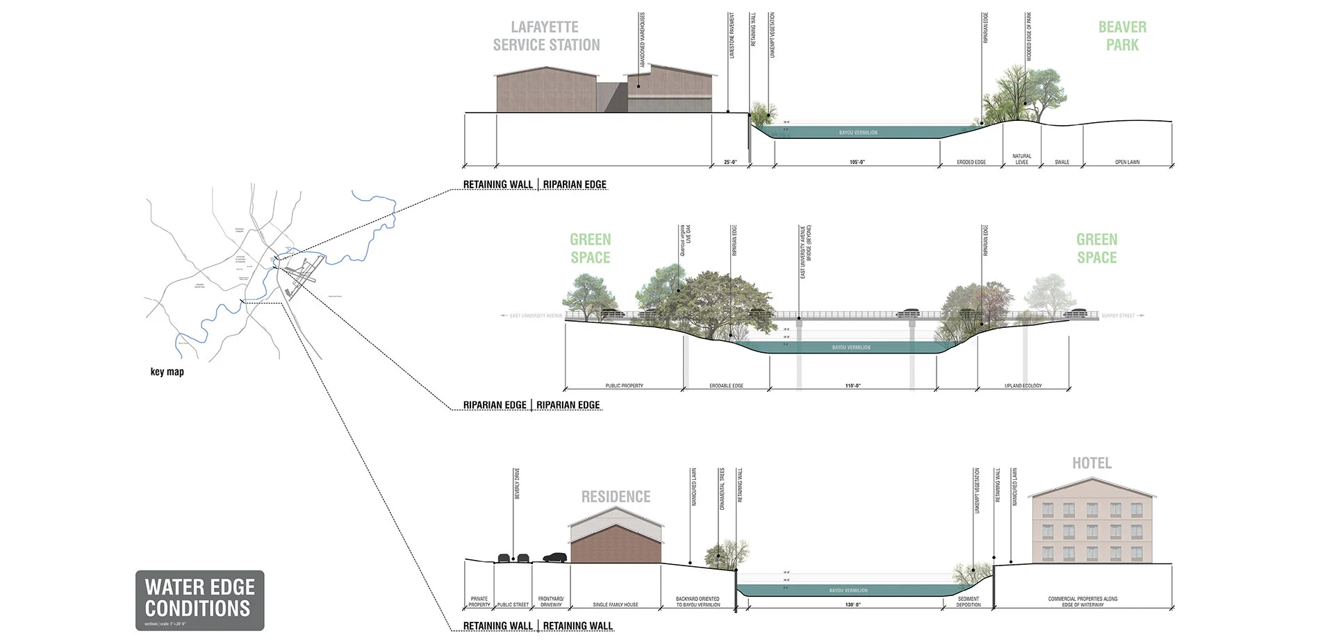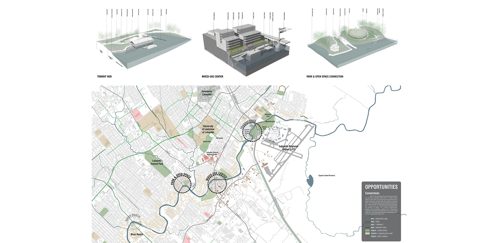 This project aims to establish a connection among open spaces along Bayou Vermilion in Lafayette to enhance the waterway’s cultural qualities and take advantage of their capacity to provide environmental awareness, to provide new recreational opportunities, and to increase waterfront access to the public. The city has two critical issues that need addressing: perception and land ownership. Many of the city’s younger citizens do not have an understanding of the waterway’s location, and the older generations perceive this bayou as little more than a drainage canal. The majority of land along the bayou is privately owned and, of that, most is residential so public access has remained limited to a few critical points. Among these critical points, this project proposes to develop three new land use typologies in order to activate this waterfront: a transit hub, a mixed-use urban center, and a recreation and open space connection.