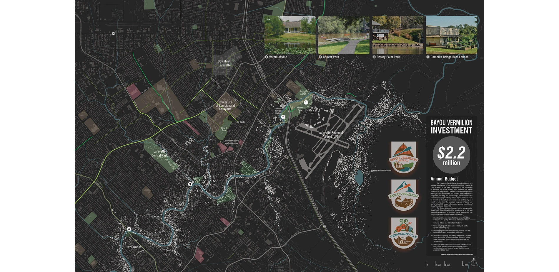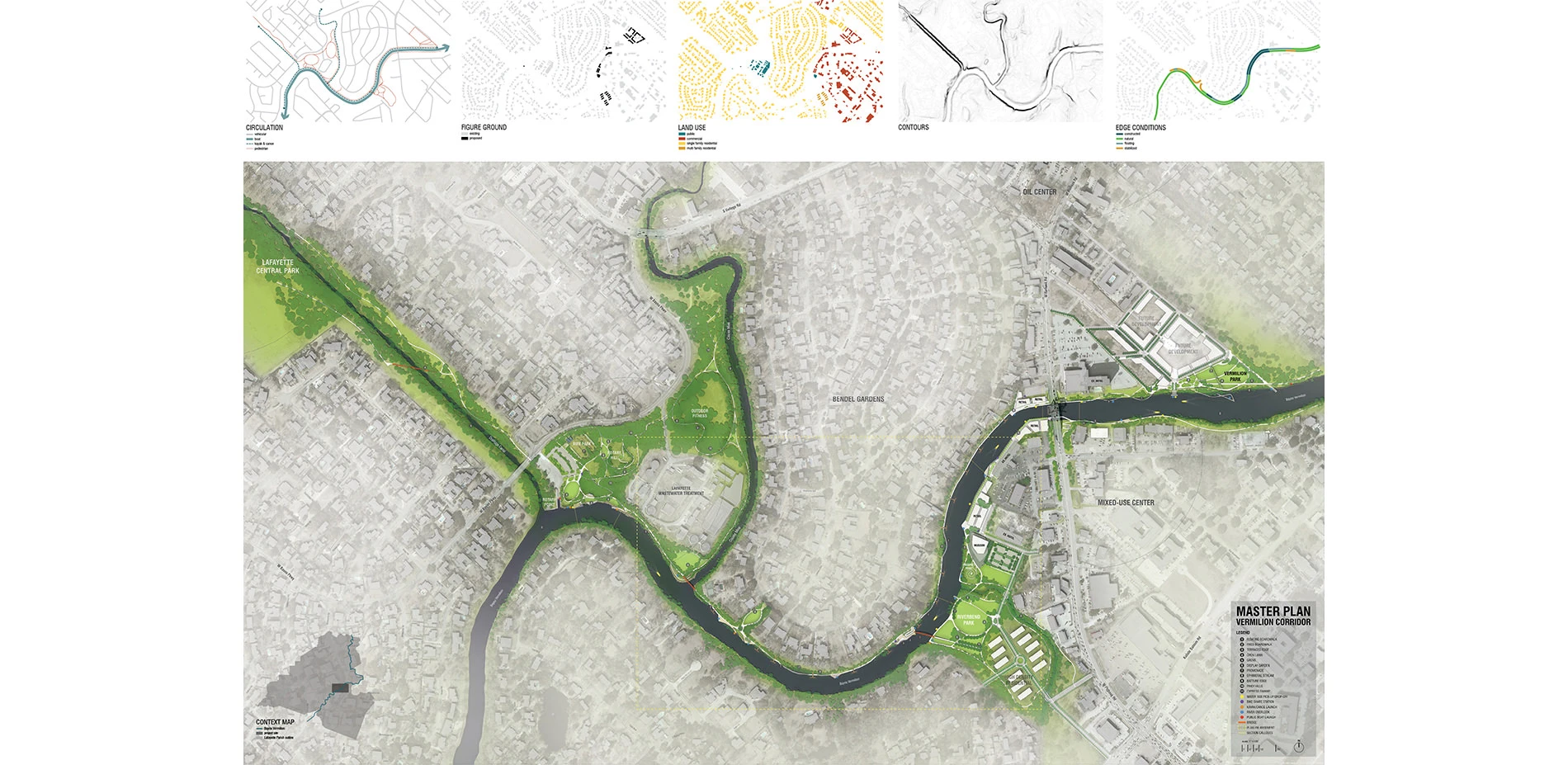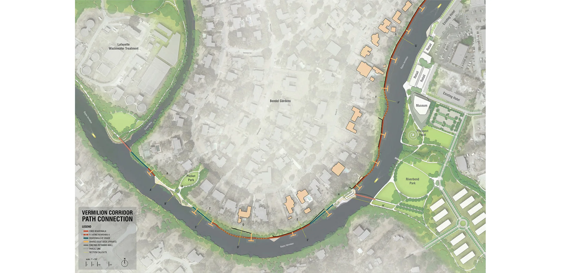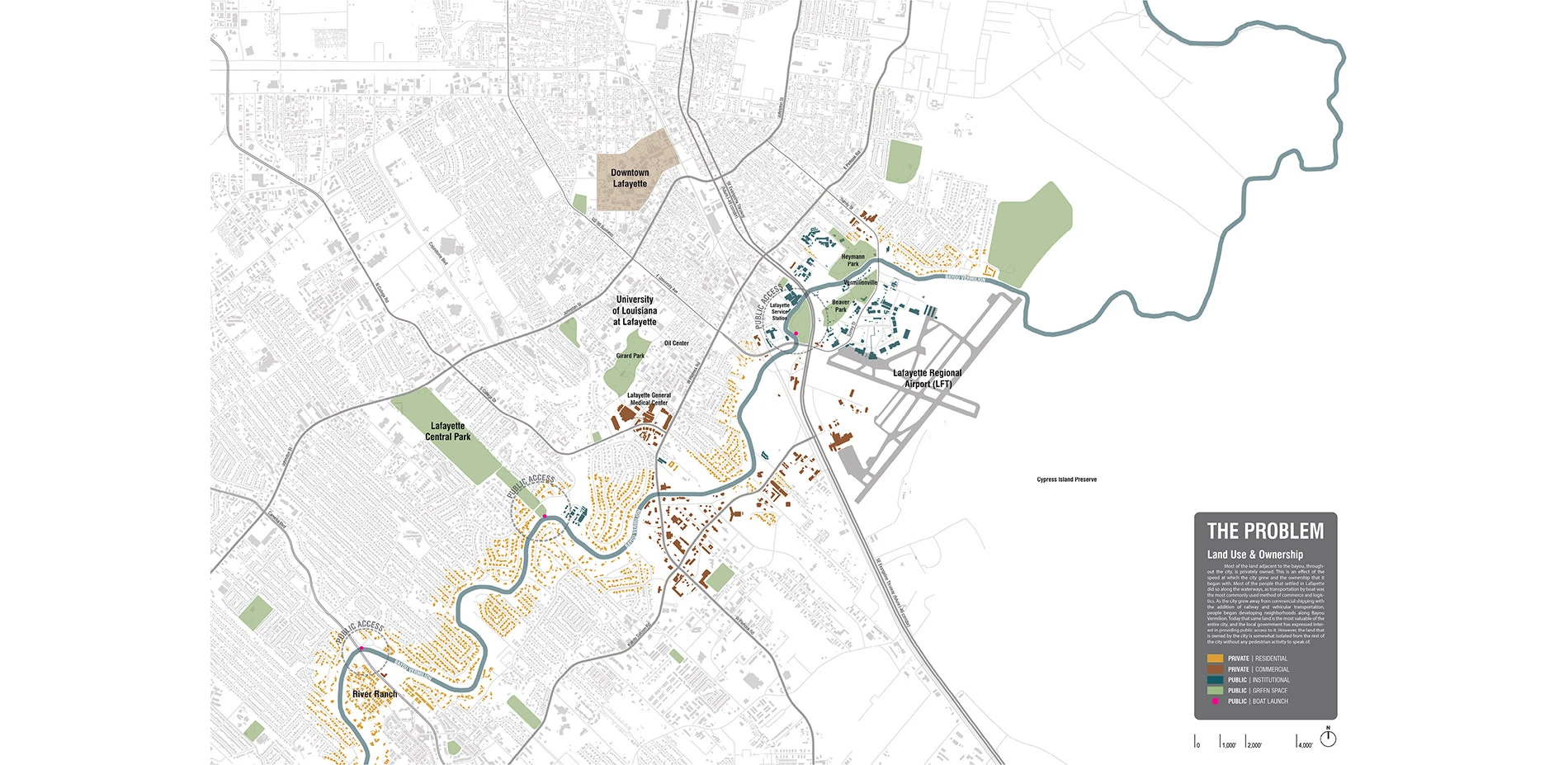 This project, located in Lafayette, Louisiana, aims to establish a connection among open spaces along Bayou Vermilion in order to enhance its use as a cultural, economic, ecological, and open space amenity. Like many other small communities in Louisiana and elsewhere, Lafayette turned its back on the waterway that facilitated the area’s original settlement. Much of the land along the bayou is privately owned and residential, with public access limited to a few critical points; at which, this project proposes a transit hub, a mixed-use center, and connections to existing public recreation and open spaces. To reinforce these new uses, a trail will connect several destinations by utilizing land on the banks of Bayou Vermilion adjacent to existing residential properties. The intent of this project is to create public access to Lafayette’s historic and scenic Bayou Vermilion, thereby enabling local residents access to the Bayou’s unique cultural, ecological, and open space potential. In addition, this project can provide a model for similar waterfront access for other Louisiana communities that share similar conditions.