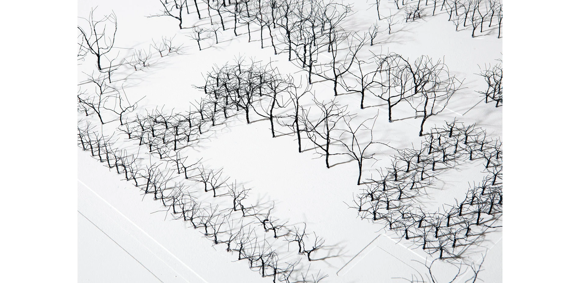 Findings are disseminated through a public installation of the six-week exhibition including five physical typology models in addition to the two large-scale site models mentioned above. Each typology physical model is roughly 24” x 24” and made of painted wood and black wire twisted trees. The size and format of the models allows enough room and a communication format to spatially exhibit and observe the formal configurations and canopies of the various tree species and typological investigations. Select species are investigated in physical form across the five typologies to enhance the importance of individual tree selection within typologies. As another form of design communication and enhancing the understanding of the typologies, over 30 individual drawing series were displayed including such explorations as canopy coverage and shade over time, seasonality and texture, growth over time, canopy competition, residual space analysis (the space between the tree planting and the ground plane), surface analysis, circulation as it results to planting sequence, perspectival view, fluctuating experiential trunk width, root growth over time, among others.