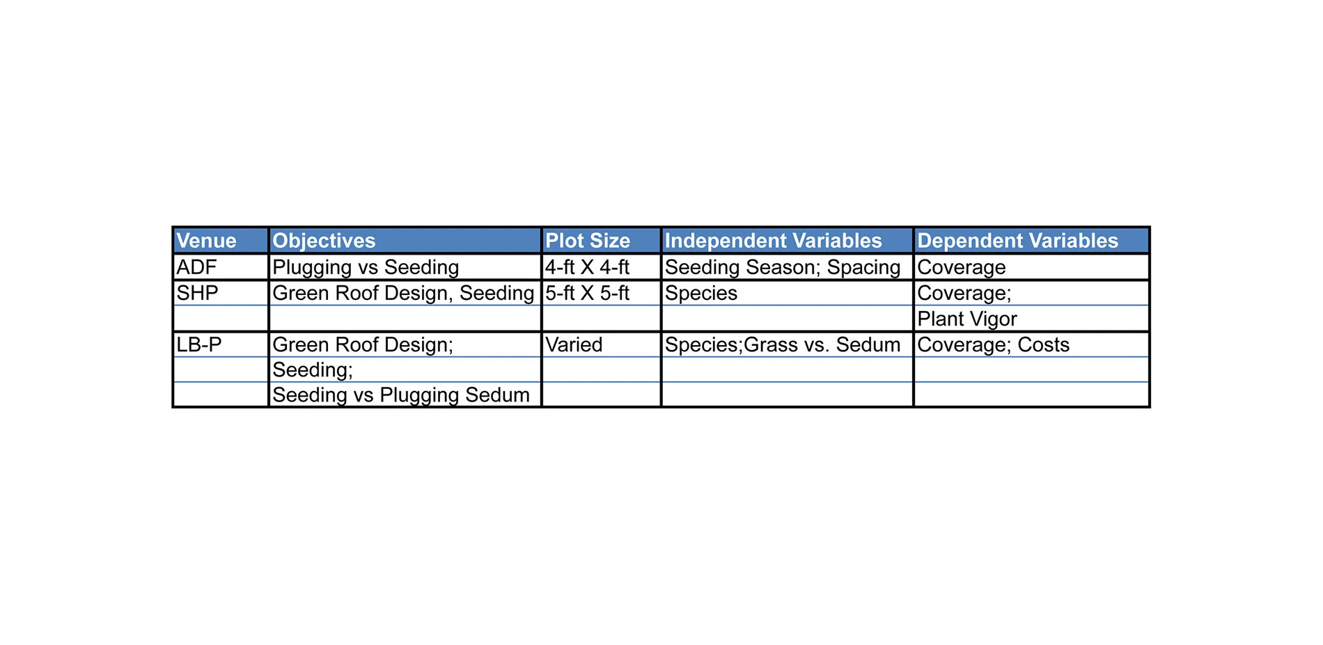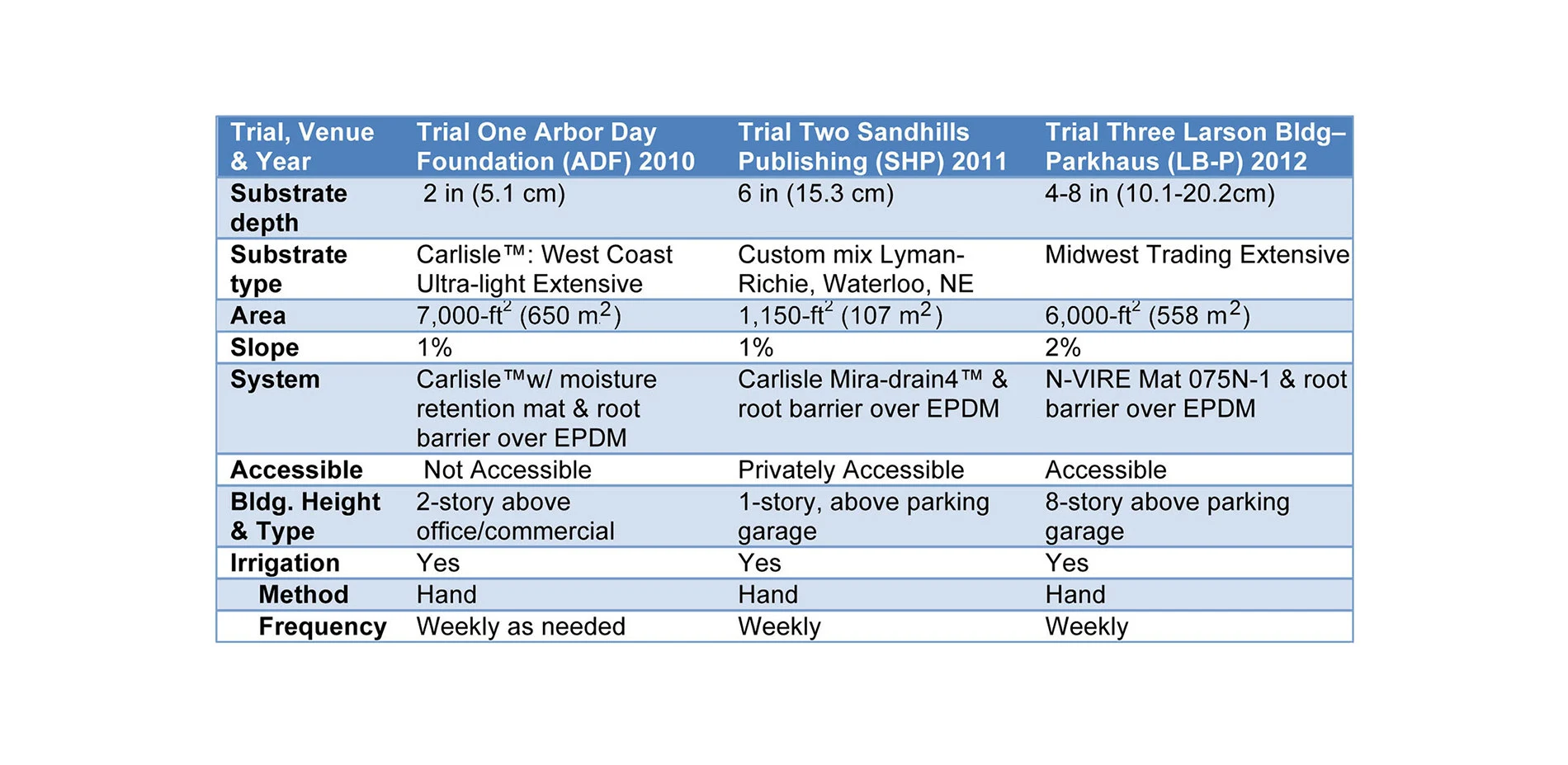 Each green roof venue (Table 1) presented its own unique design circumstances related to the cooperator’s goals, site microclimate, construction specifications, and installation that constrained the timing, relationship, and extent of experimental designs and comparisons (Table 2). The green roofs at Sandhills Publishing (SHP) and the Larson Building-Parkhaus (LB-P) were designed as green roofs which incorporated experimental plots.