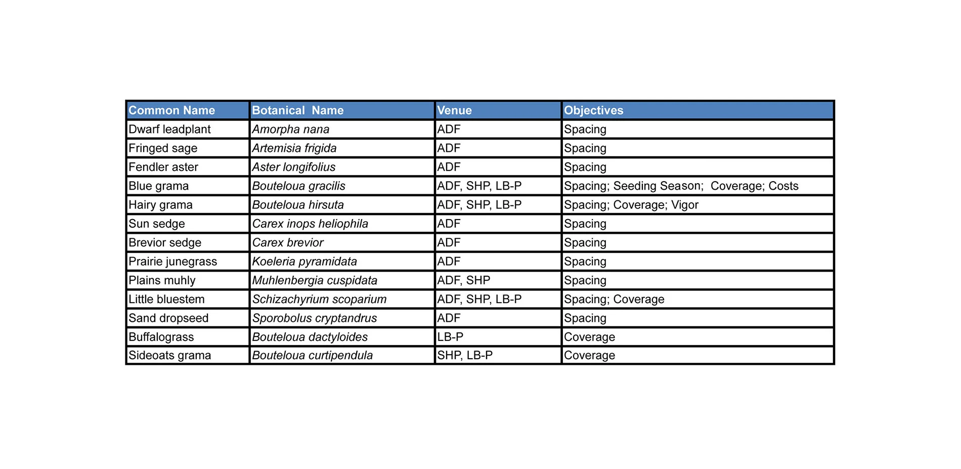 - At SHP 4 spring-sown grass species in 6-inch rows met 80% coverage in one growing season.