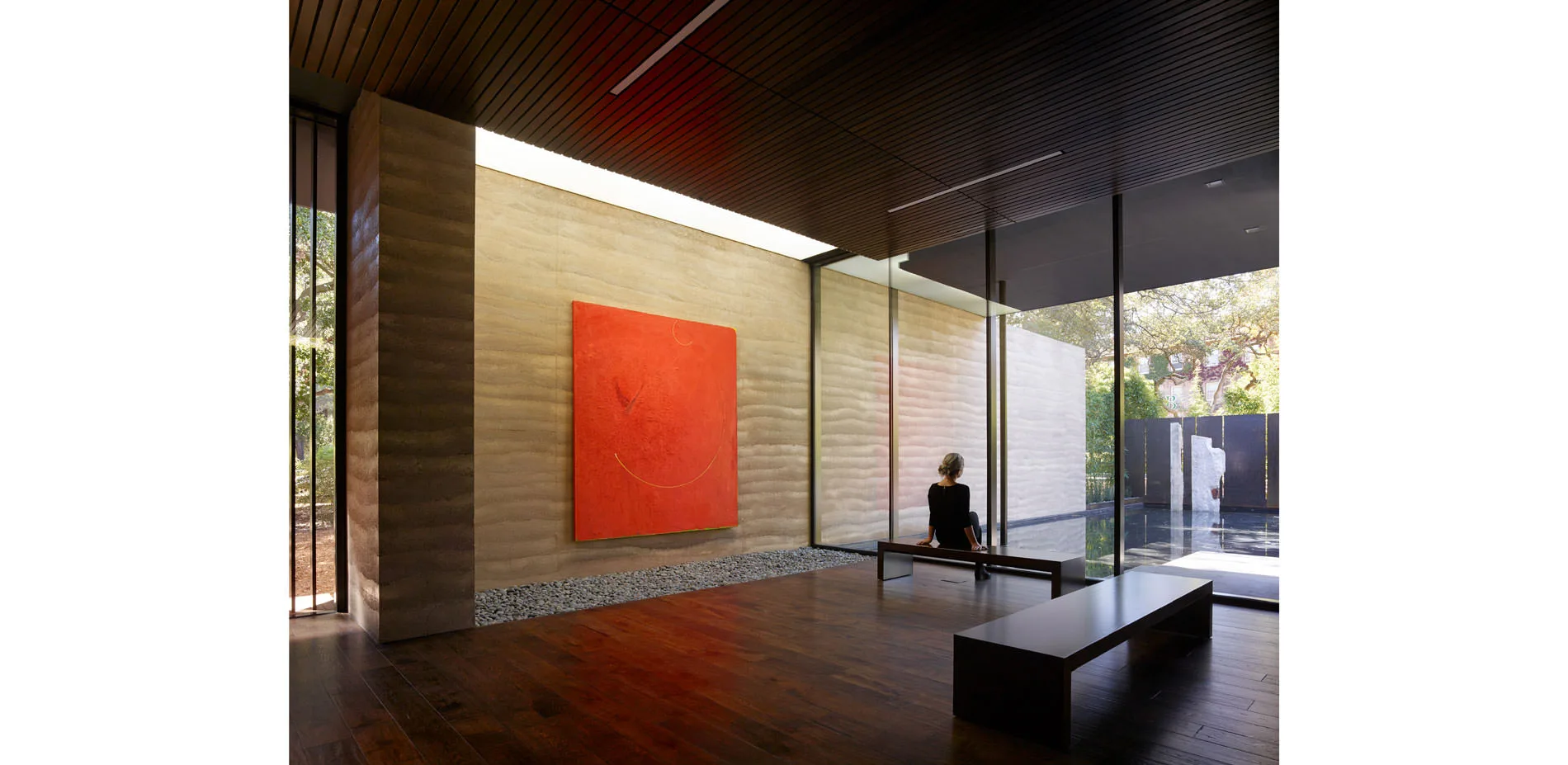 The project’s innovative materials palette reinforces the deep engagement with nature that is integral to the program and overall design concept for the complex. Rammed earth walls, weathered steel, stone, water, gravel and decomposed granite immerse visitors in a tactile environment. These materials amplify the experience of ephemeral phenomena, drawing visitors’ attention to the sound of stone crunching underfoot, the movement of the breeze across the water, the play of light and shadow against planar surfaces.