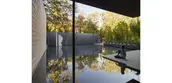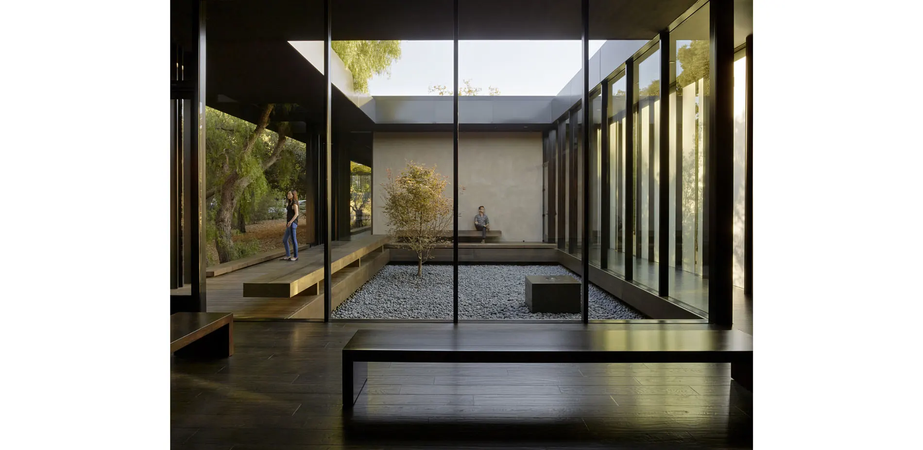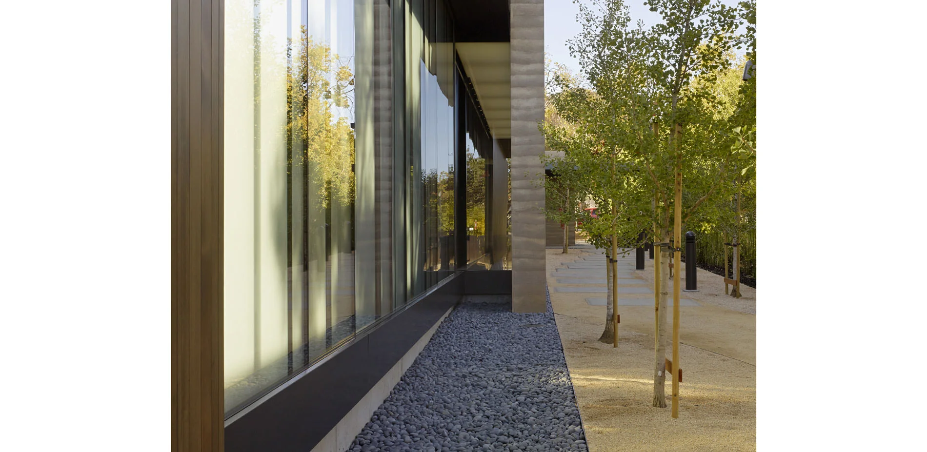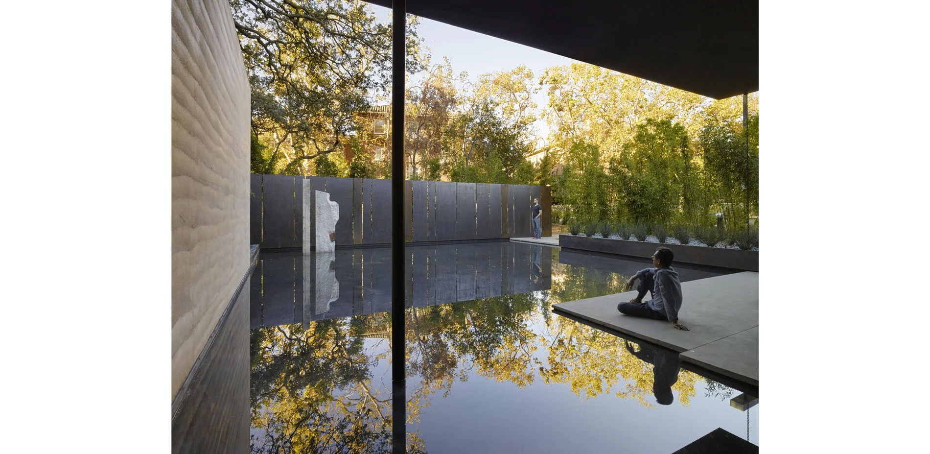 The long, narrow building, on a one-acre site, is bounded by a major campus thoroughfare, a heavily used bike path, and a large dormitory. The carefully choreographed entry sequence provides an experientially rich transition between the bustling campus and the chapel-like gallery: a crushed stone path leads visitors through a grove of ginkgo trees and past a tall wall of bamboo, allowing them to shed the outside world before entering the center. Within the building, the interior spaces merge with a series of outdoor rooms intended for quiet contemplation. Wide panes of glass and vertical fins frame views back out to the woodland and courtyards. At the rear of the building, a still reflecting pool defined by a rammed earth wall, a weathered steel screen, and a stand of bamboo are designed to quiet surrounding distractions and turn visitors’ focus towards the ephemera around them. At the core of the building, a Zen-inspired courtyard opens to both the sky above and the adjacent oak woodland, offering views of a meditative labyrinth nestled among the trees beyond.