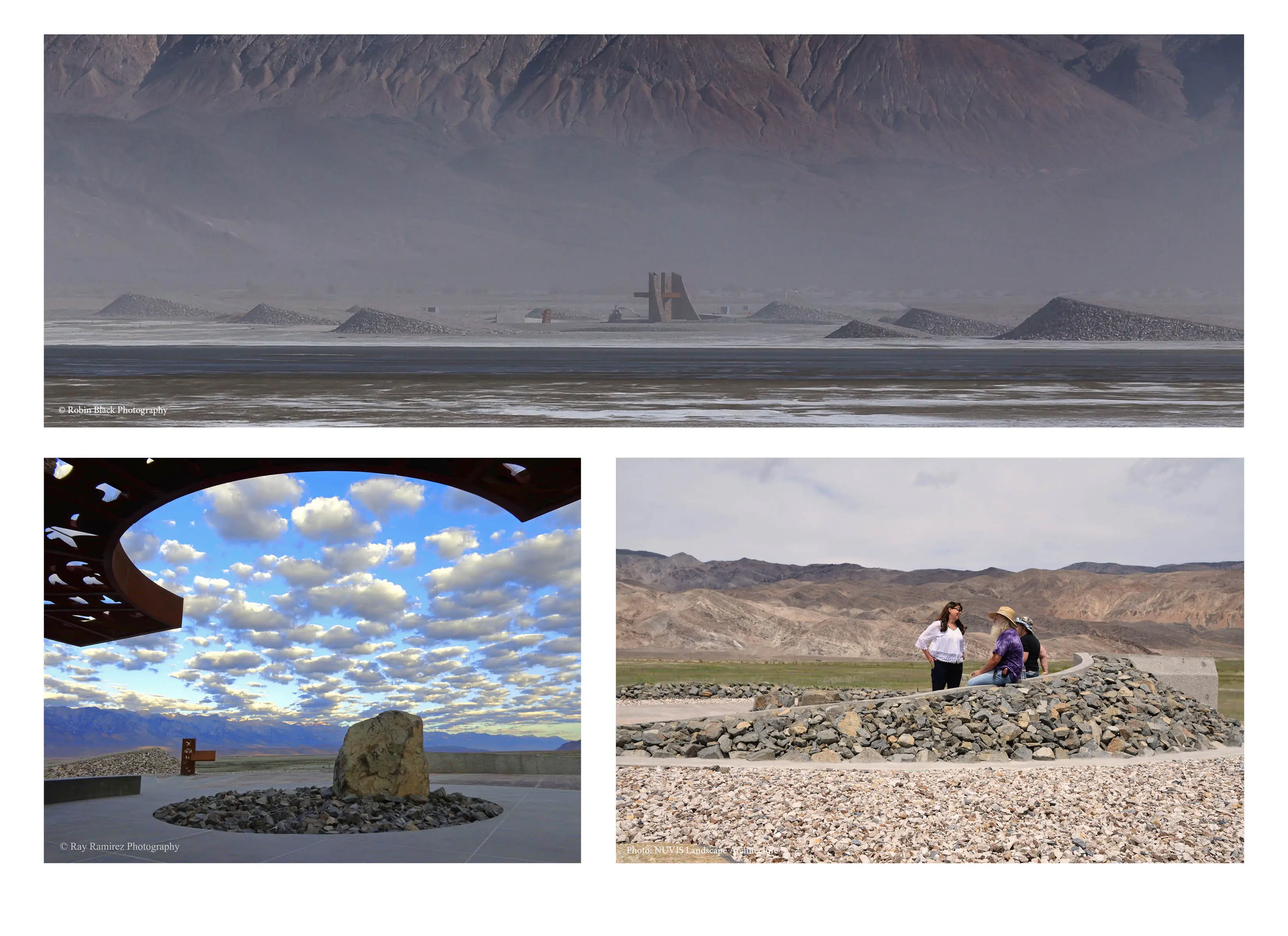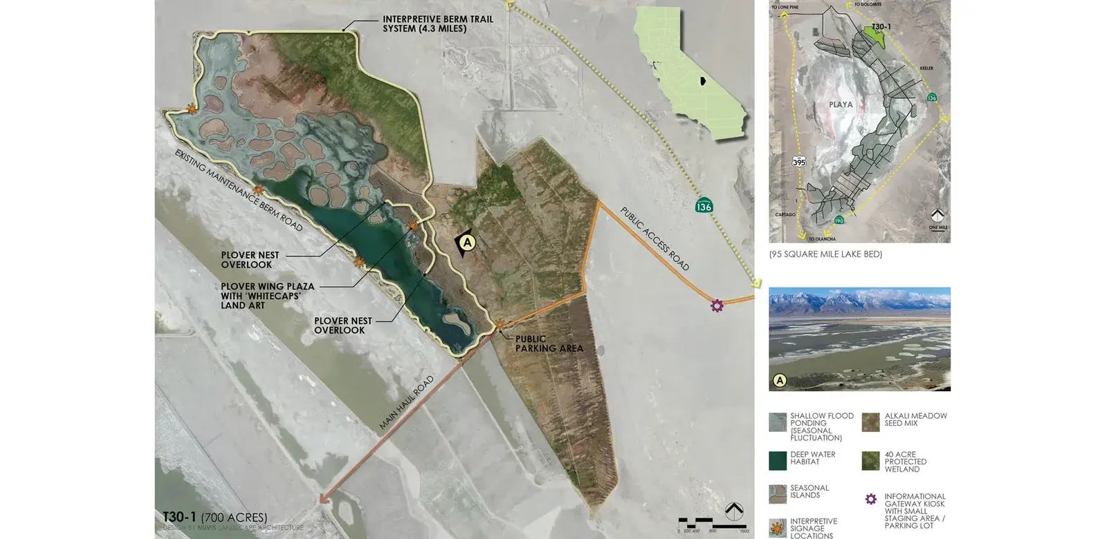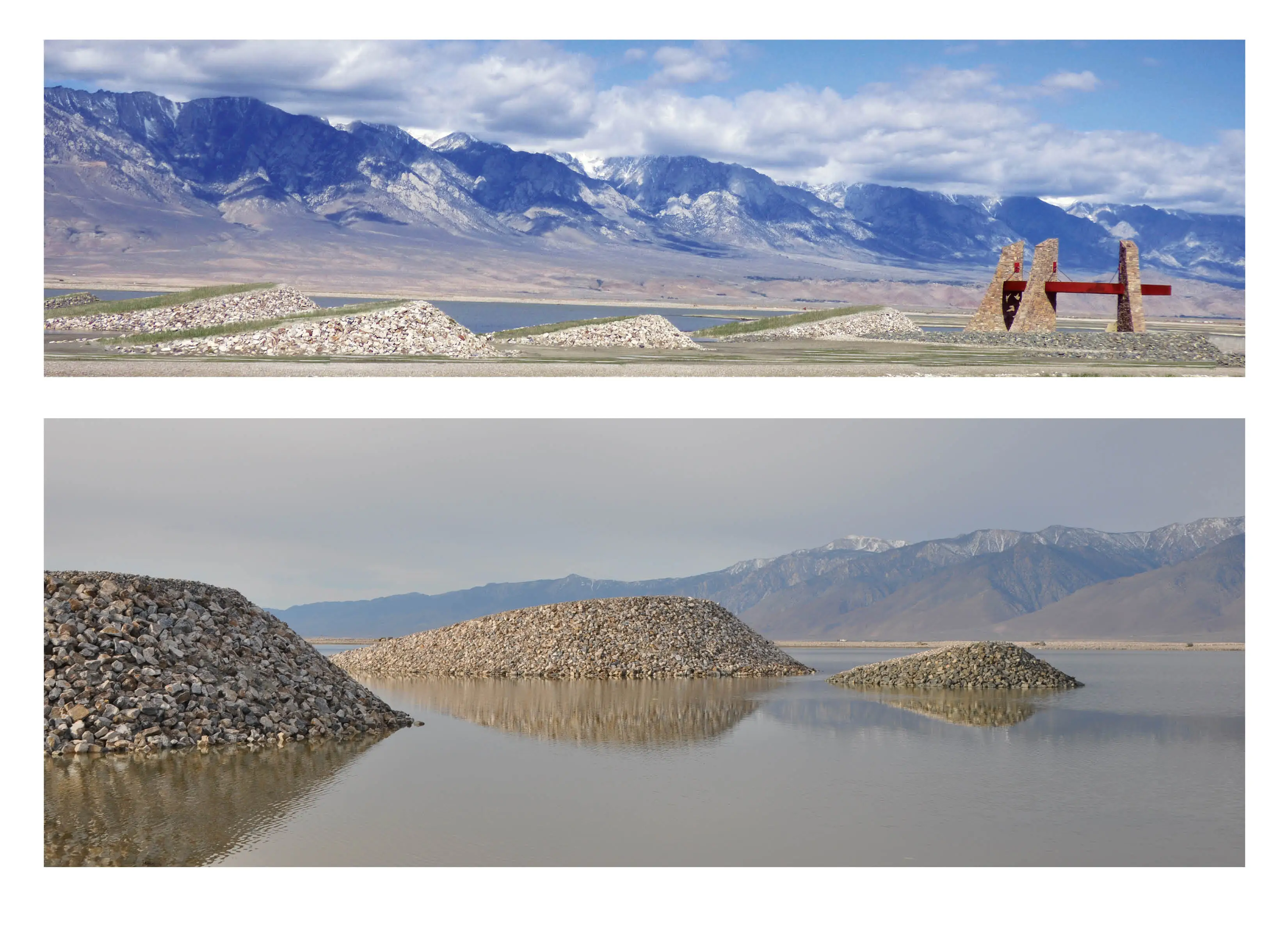 Owens Lake Land Art project (located on a 700-acre parcel named T30) began with a mandate from California State Lands to the Los Angeles Department of Water and Power (LADWP) to meet the following goals: provide public access and hiking trails, create bird and mammal habitat, and preserve cultural resources while still meeting the strict dust emission controls. The landscape architect, adhering to the approved yet limited dust mitigation palette (shallow flood, gravel cover, and managed vegetation where soil conditions allow), designed a solution which evolved into a land art project named the ‘Whitecaps’. The project did not start out as an art commission yet the design developed into a spiritual composition of simple materials and forms inspired by the Owens Valley.