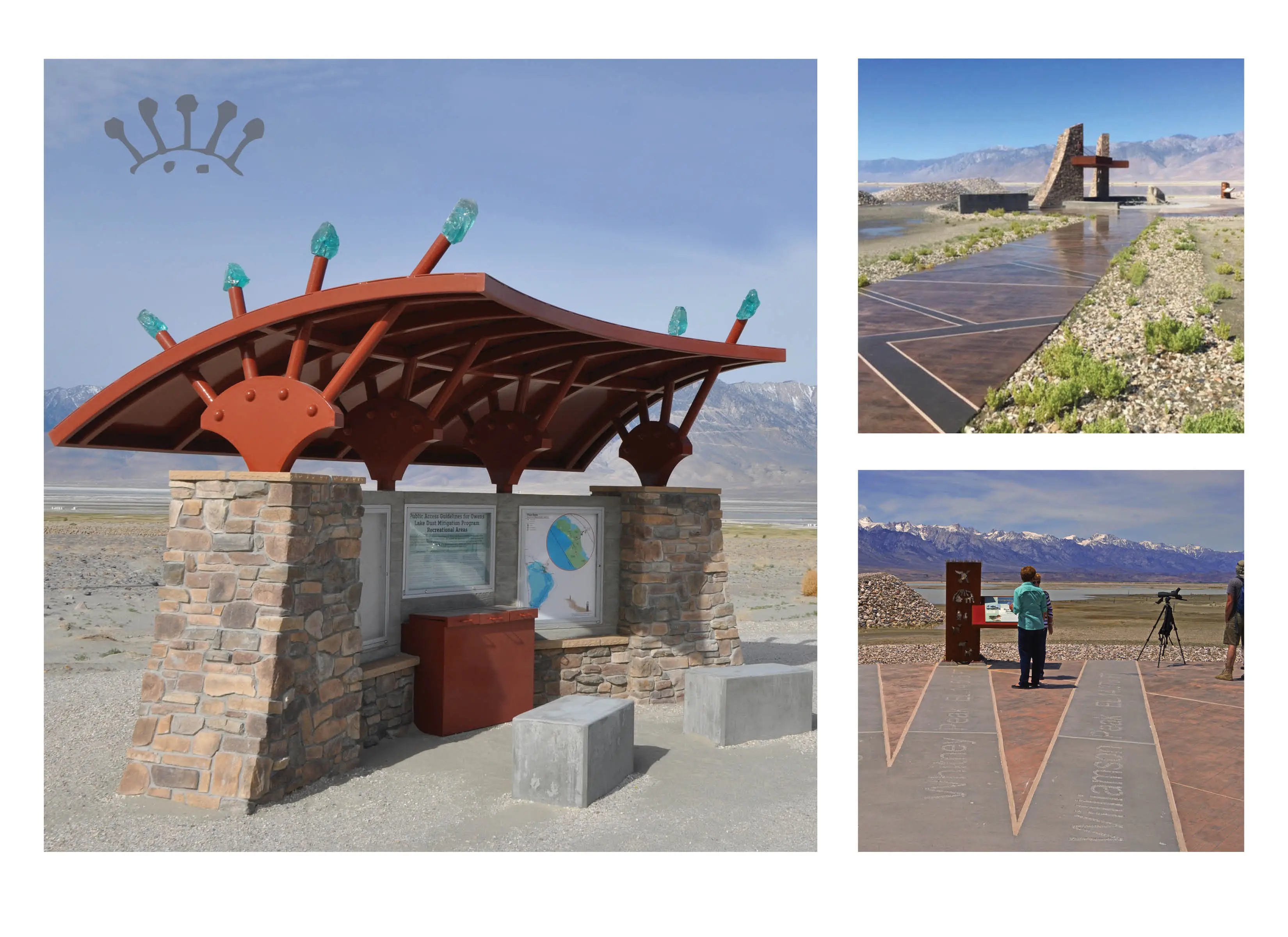 Collaborating with LADWP’s operation and maintenance staff, site amenities were designed to stand the test of time and hold up against the unforgiving environment of the playa which experiences seasonal temperature fluctuations from below 0° F to over 110° F and is home to corrosive alkaline soils and extreme atmospheric conditions. Ted Schade, former air pollution control officer for the Owens Valley and avid critic of the LADWP, recently stated in the Los Angeles Times that the Owens Lake Land Art project, “is California’s version of Stonehenge”.