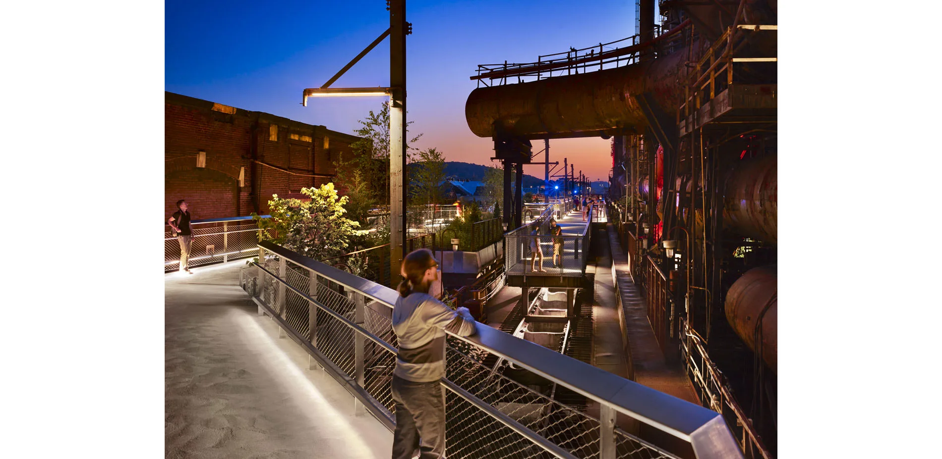 The Hoover-Mason Trestle structure was designed to tread-lightly over the existing structure. All new surfaces and planters are supported by a new steel structure that attaches at the location of the existing rail tracks, and the new structural steel was designed in weathering steel to blend with the existing SteelStacks, and allow the walkways to visually float above the structure, as a clearly identifiable new structure, juxtaposing new and old. Respecting the linearity of the rail tracks, metal-grating walkways run parallel immediately above the tracks, encouraging people to look down and acknowledge the existing site.