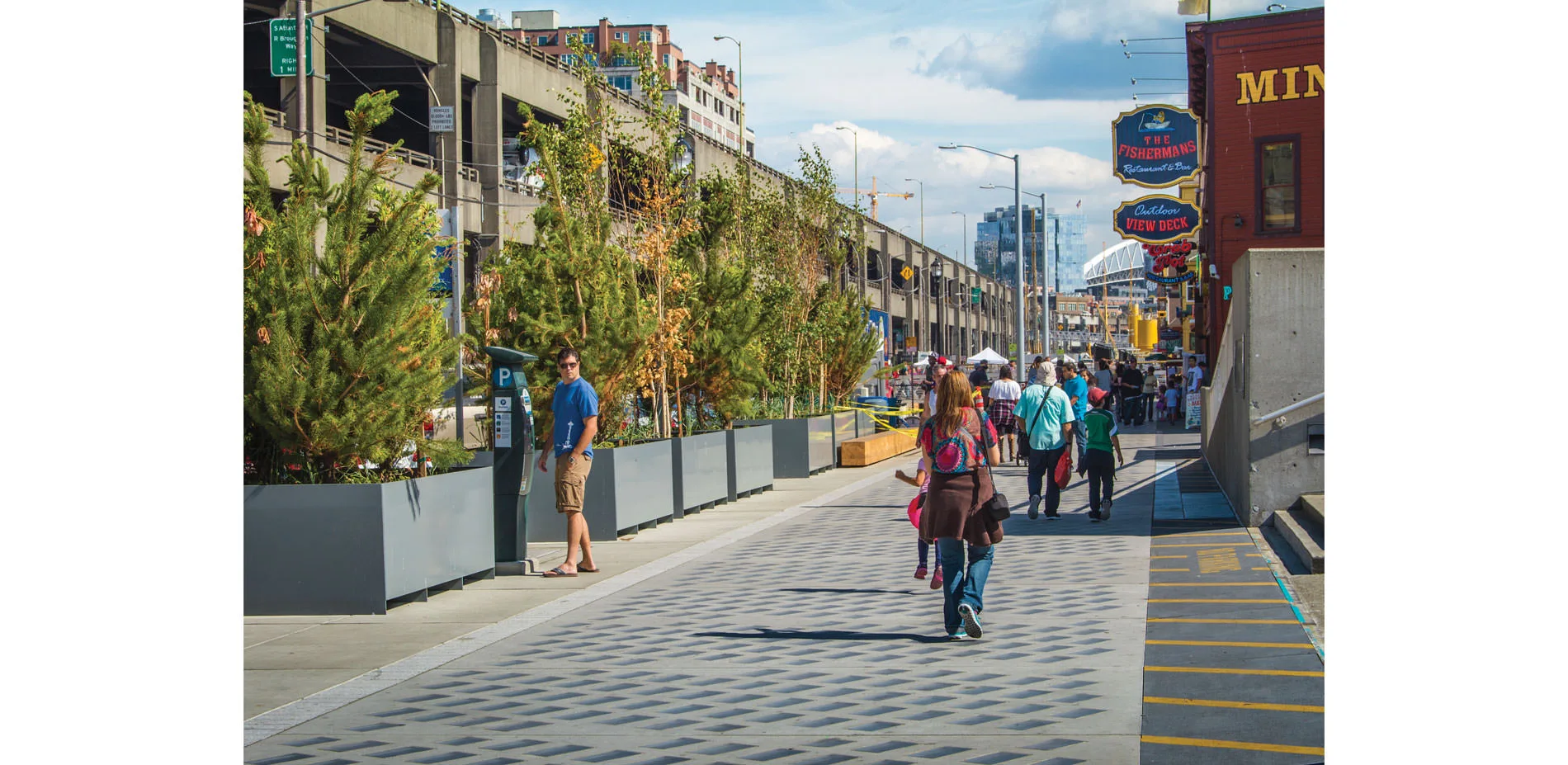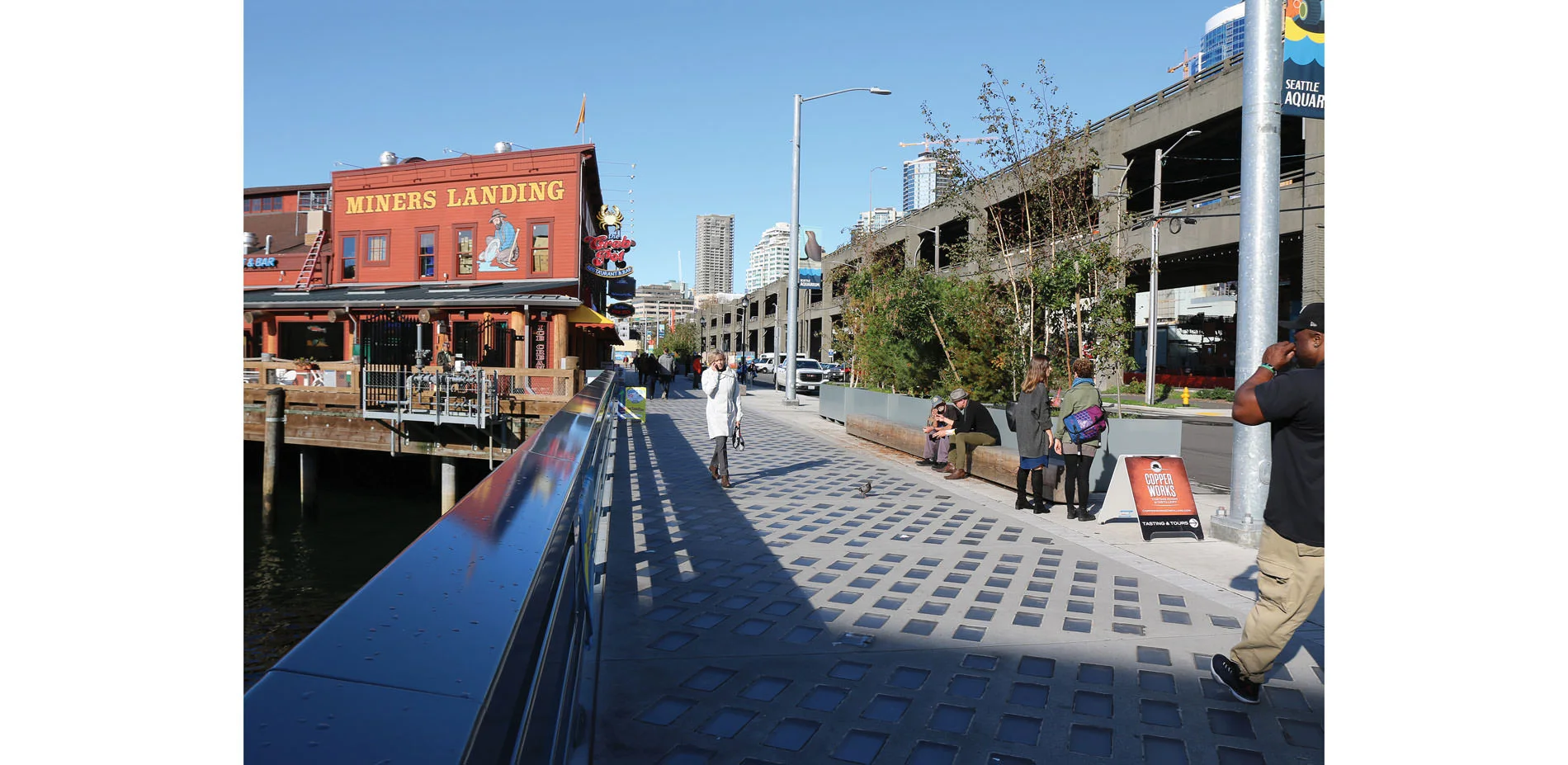 The CPS’s pedestrian promenade features the LPS panels, which are part of the sidewalk, as well as cast-in-place concrete, above-grade planters with native and climate-appropriate species, wide benches made from reclaimed ship timbers, and a vehicular crash-rated custom-designed railing. The LPS panels will remain in place, with their pattern corresponding to the future Waterfront Promenade’s layout. The planters and benches are temporary and will be repurposed into the greater Waterfront Promenade once the Alaskan Way Viaduct is demolished and construction begins on the final implementation of the Central Waterfront.