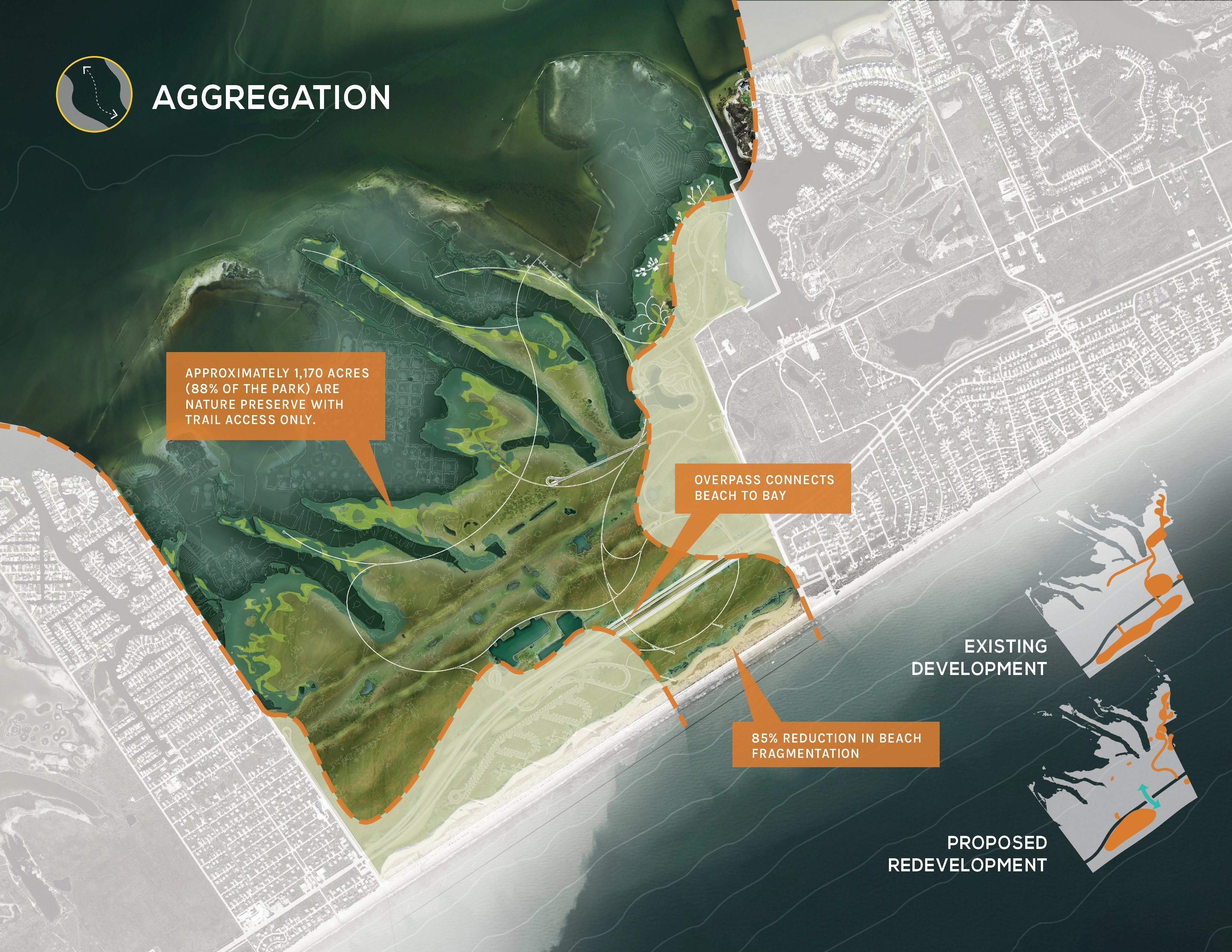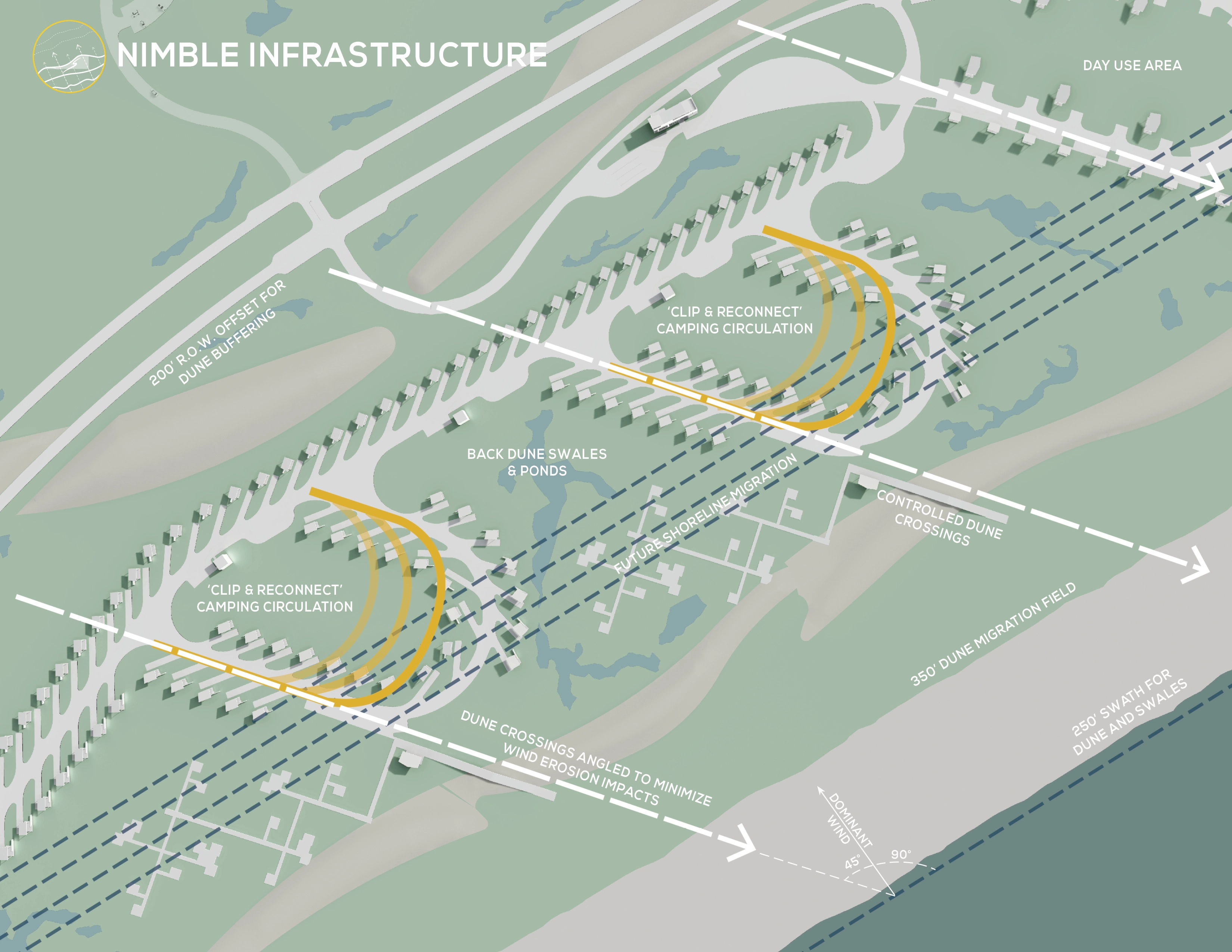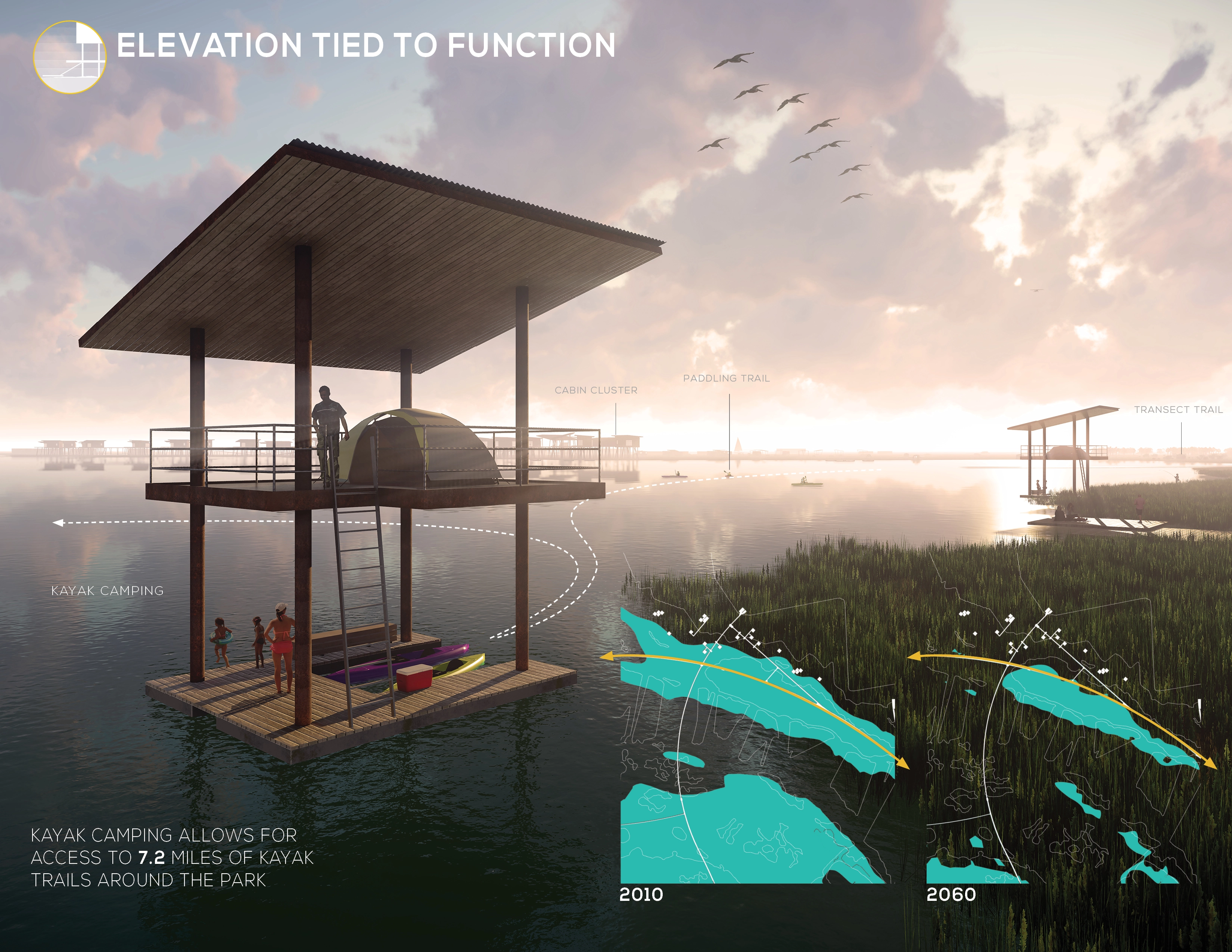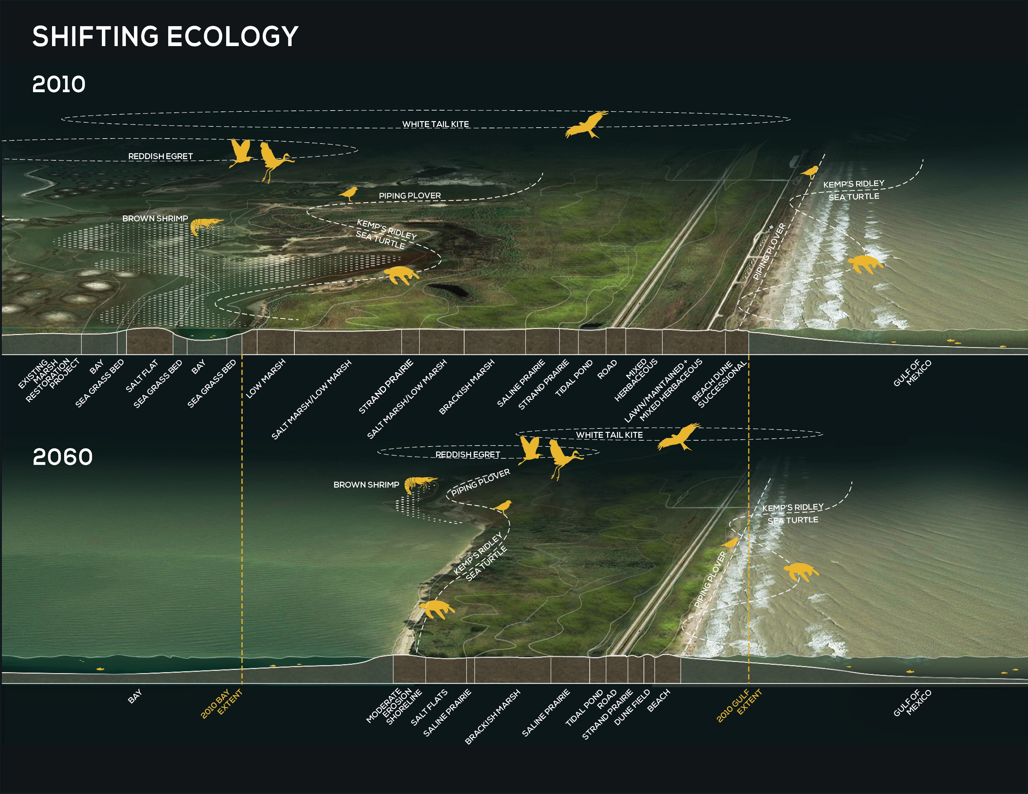 Barrier islands are dynamic ecosystems in constant evolution. While wind and tide shape the landscape, tropical storms and sea level rise accelerate inland habitat migration. In 2008, Hurricane Ike completely ravaged Galveston Island State Park. The redevelopment master plan is a new precedent for coastal recreation planning built on a foundation of predictive models. Based on site specific ecologies and elevations, the plan must literally anticipate what of the site will remain in 50 years and what its ecology will be. The plan immerses visitors in the dynamics of this fragile and diverse landscape.