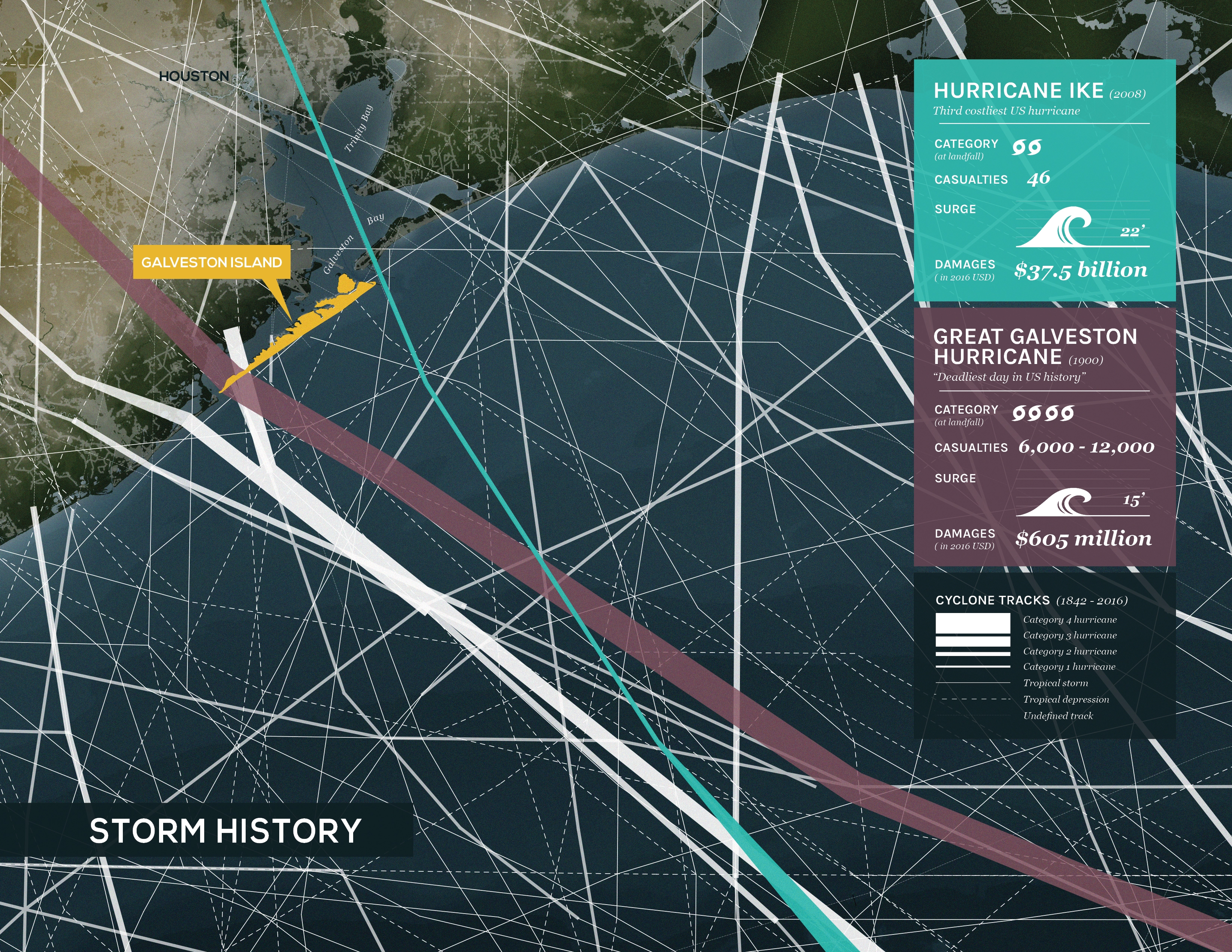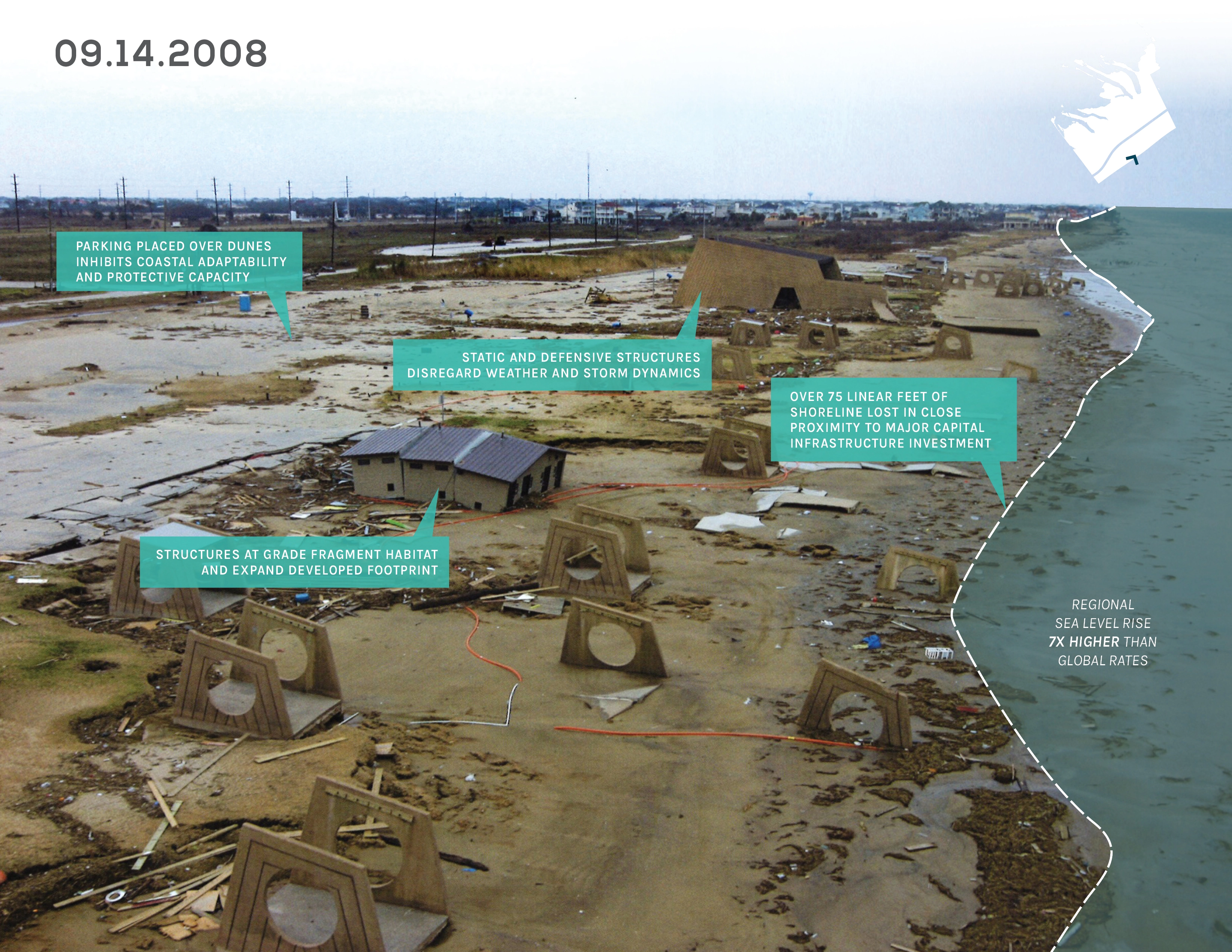 September 13, 2008 – Hurricane Ike slams into the Texas coast. This mighty force of nature ravages the region as the 3rd most costly hurricane on record. Since 1842, over fifty storms have churned through these waters – forcing a pattern of re-armoring, re-construction, destruction, repeat - on barrier islands and Gulf communities.