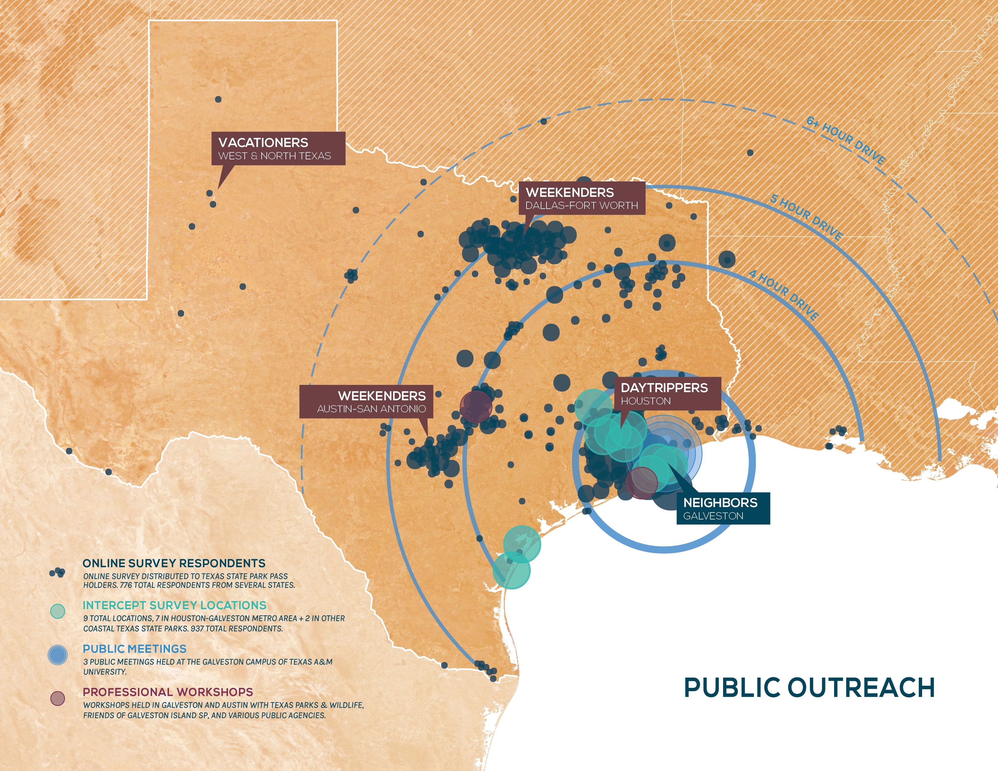 Outreach purposefully identified different visitor groups throughout the state, including former neighbors displaced by Ike. The plan is built on a foundation of public education, but is also inspired by memories and personal stories shared at numerous engagement events: