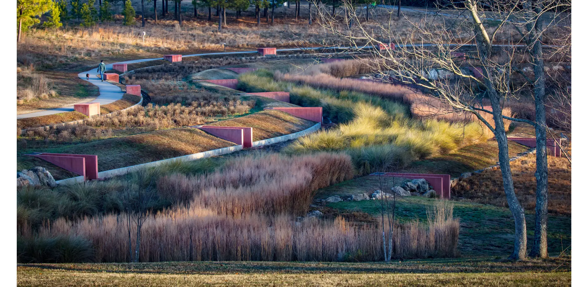 The North Carolina Museum of Art (NCMA) is situated on 164-acres of picturesque rolling hills in one of the fastest growing urban regions in the country. With its vision: “To enrich lives through the power and wonder of art,” the museum embodies the heart of visual arts and design for the entire state. In addition to extensive interior galleries, the museum has created one of the largest curated art parks in the world. The landscape architect was engaged to develop a comprehensive master plan for the park, as well as the design and construction of this project, which encompasses 28.3 acres of sculpted landscapes, gardens and progressive stormwater features that combine to create a systems-based landscape that celebrates the synergistic relationship between culture, art, and ecology.