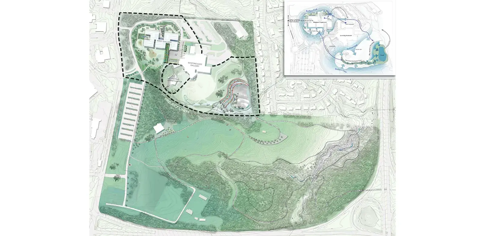 In addition to the sculpture gardens surrounding the museum, the landscape architect tied together disparate parts of the park with pedestrian connections and an intricate and innovative water management system. At the low portion of the site, a beautiful and functional seven-acre landscape with bioretention terraces, wetlands, lushly planted swales, and a one-acre pond were created to collectively capture, hold, and cleanse all of the stormwater from the developed portion of the property. A design gradient between art and nature was established on the site, with a formal design vocabulary in the landscape immediately surrounding the new galleries transitioning into a more naturalistic aesthetic as one approaches the pond. Within the wetlands, utilitarian elements such as inflow and outflow structures were conceived as works of sculpture that both contrast and fit beautifully within the landscape. Educating people about natural systems and the need to responsibly deal with stormwater became an important part of the project; doing so in a beautiful manner supports both the educational and artistic missions of the museum.