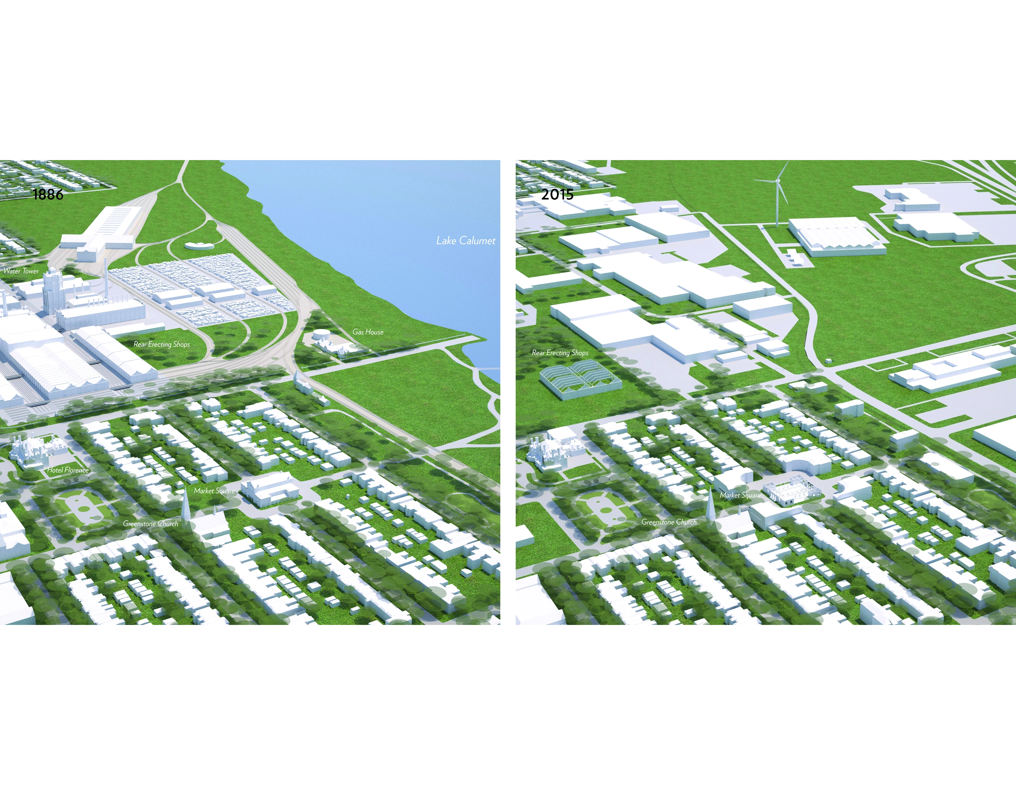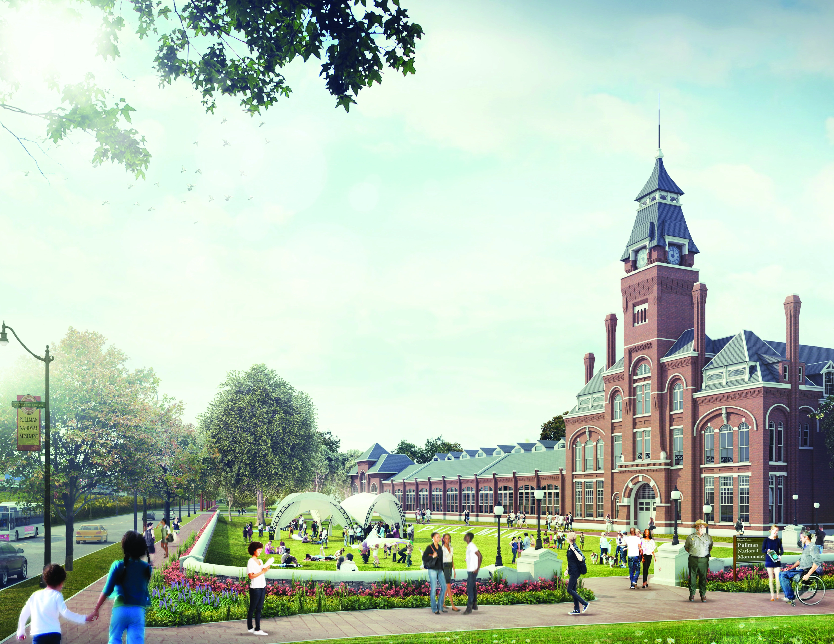 The Pullman Factory Complex is also envisioned to incorporate solar collectors, wind turbines, and rainwater harvesting features that reduce environmental impacts while also serving as educational features.